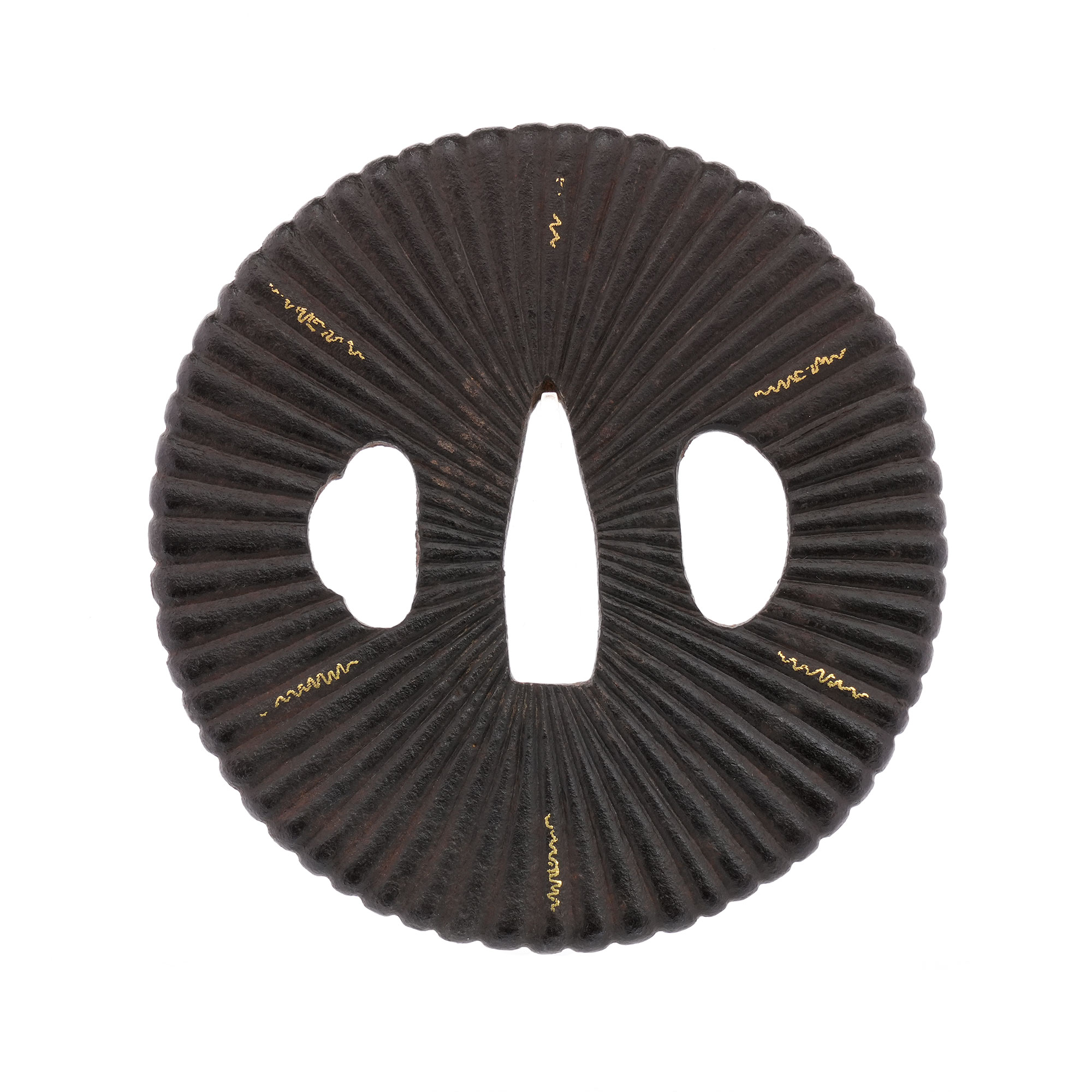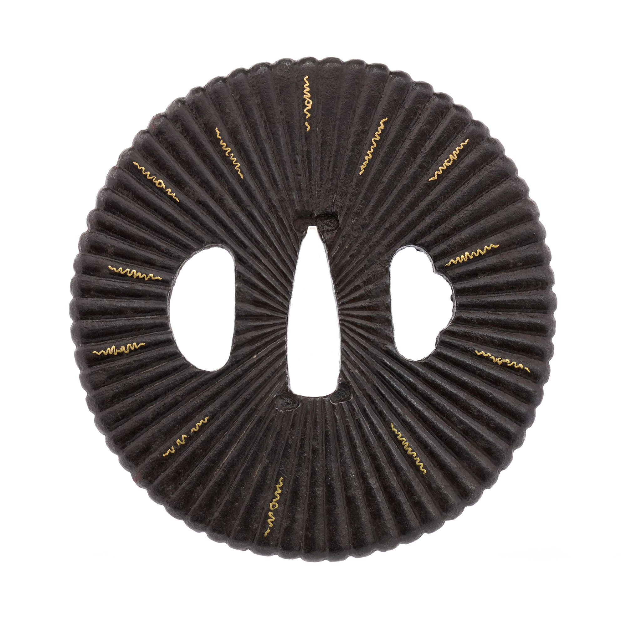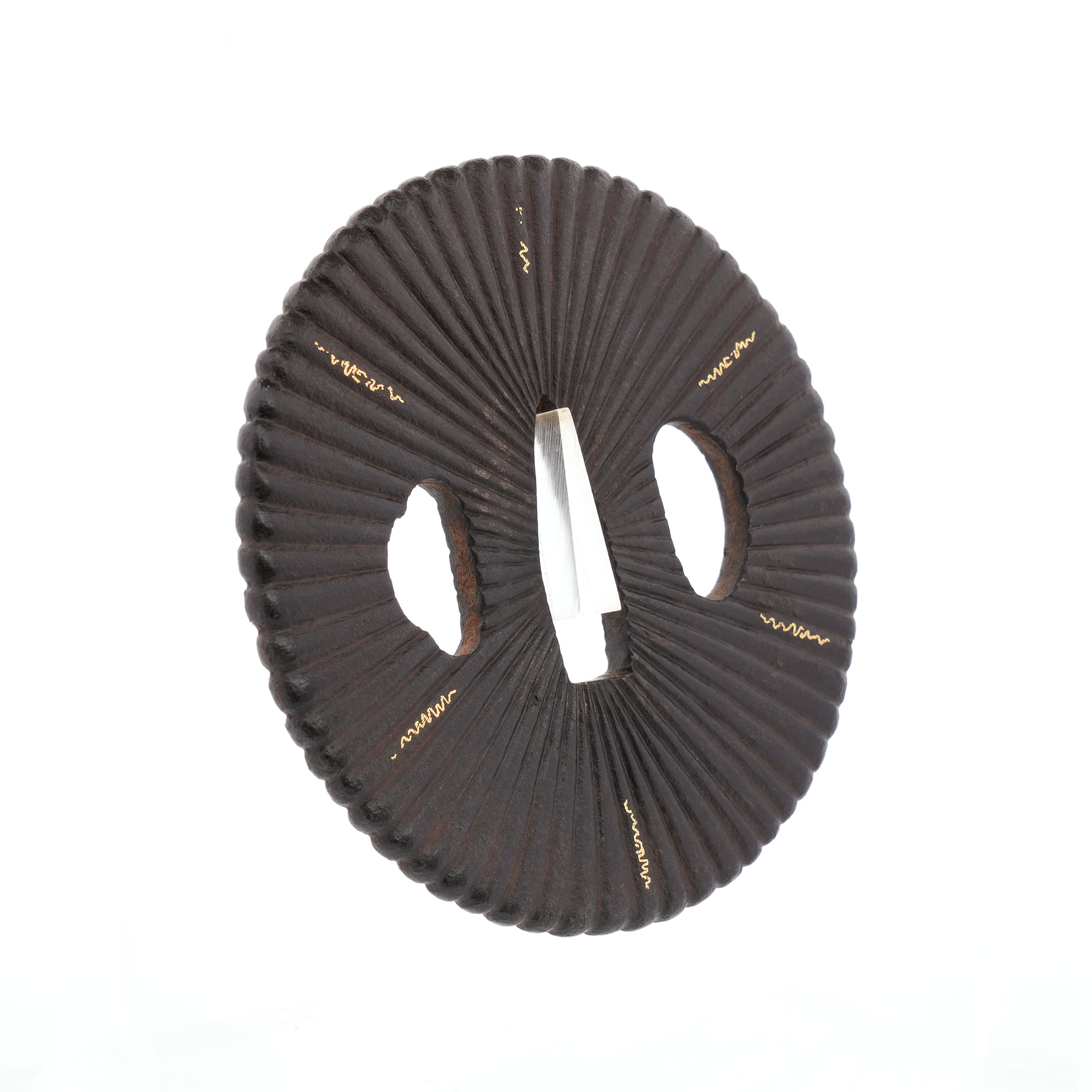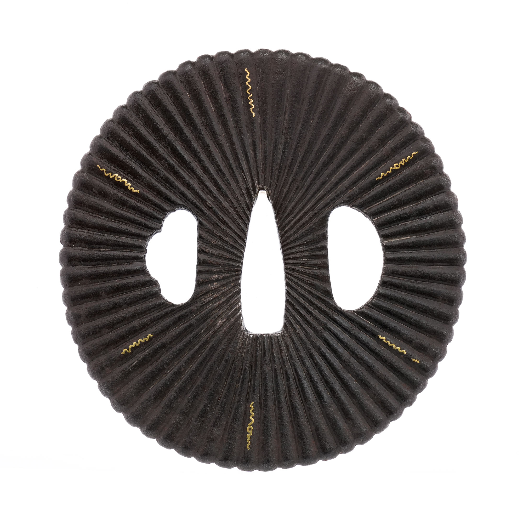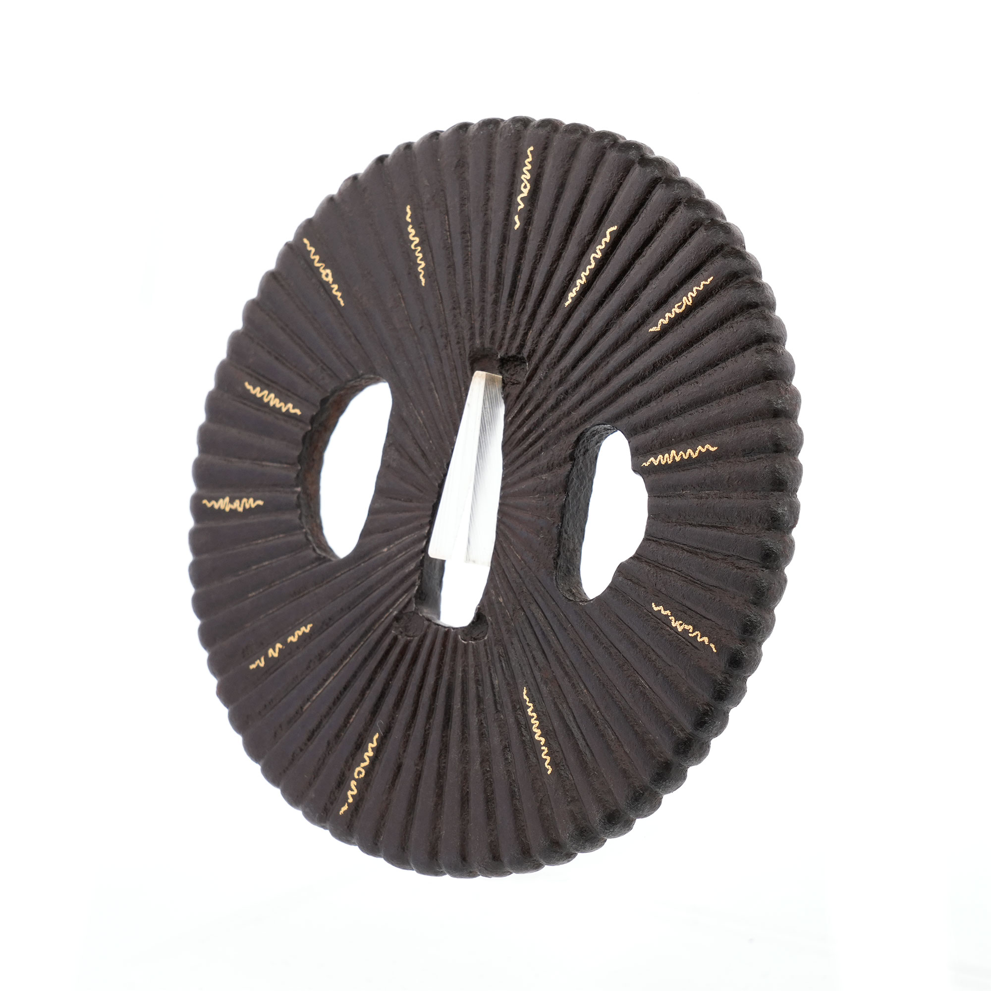 鍛えのよい鉄地に放射状の鑢目を精緻に施し、菊花を想わせる優美な姿に仕上げた鐔。大小いずれの象嵌にも剥離は殆ど認められず、往時の風趣を今に伝える健全な佳作である。