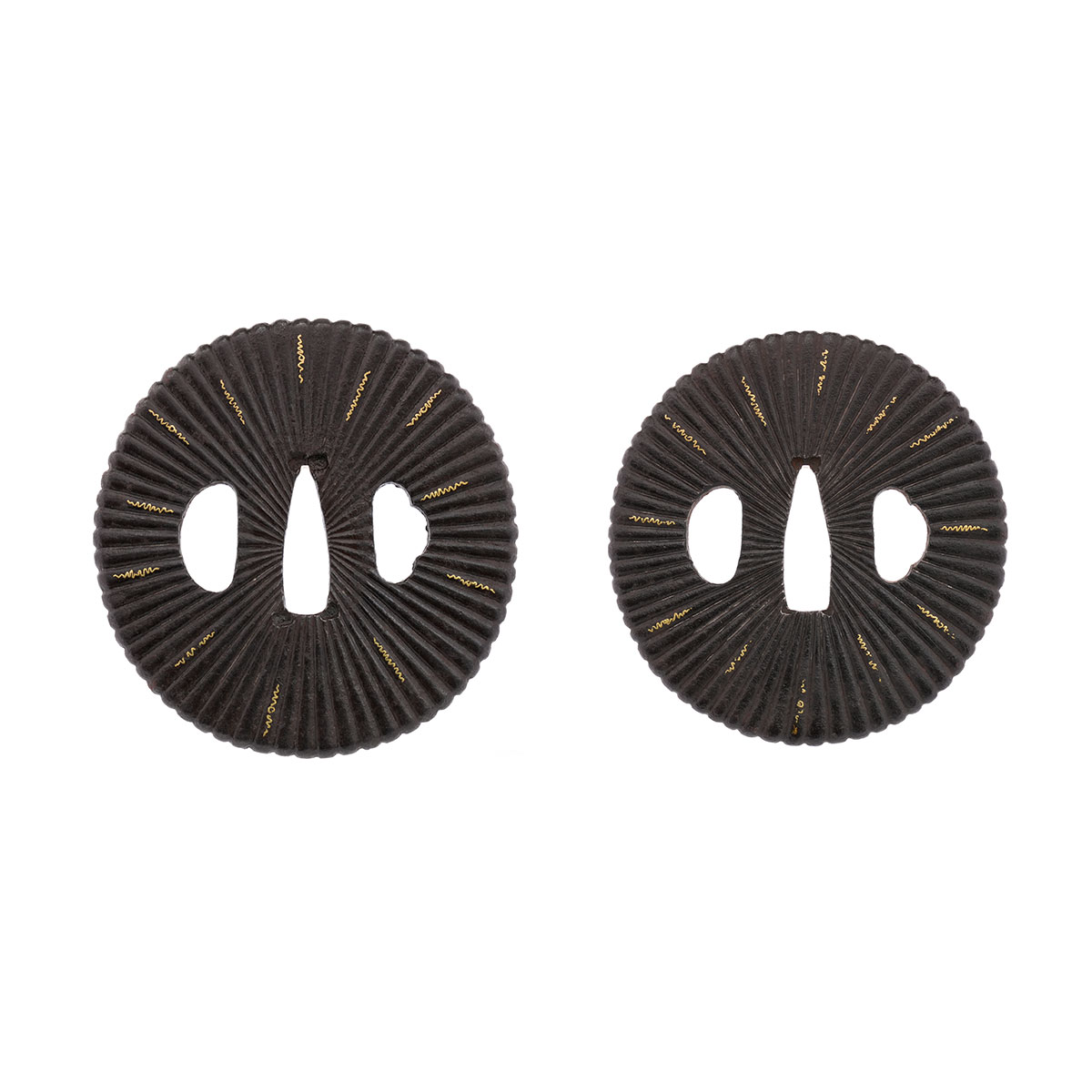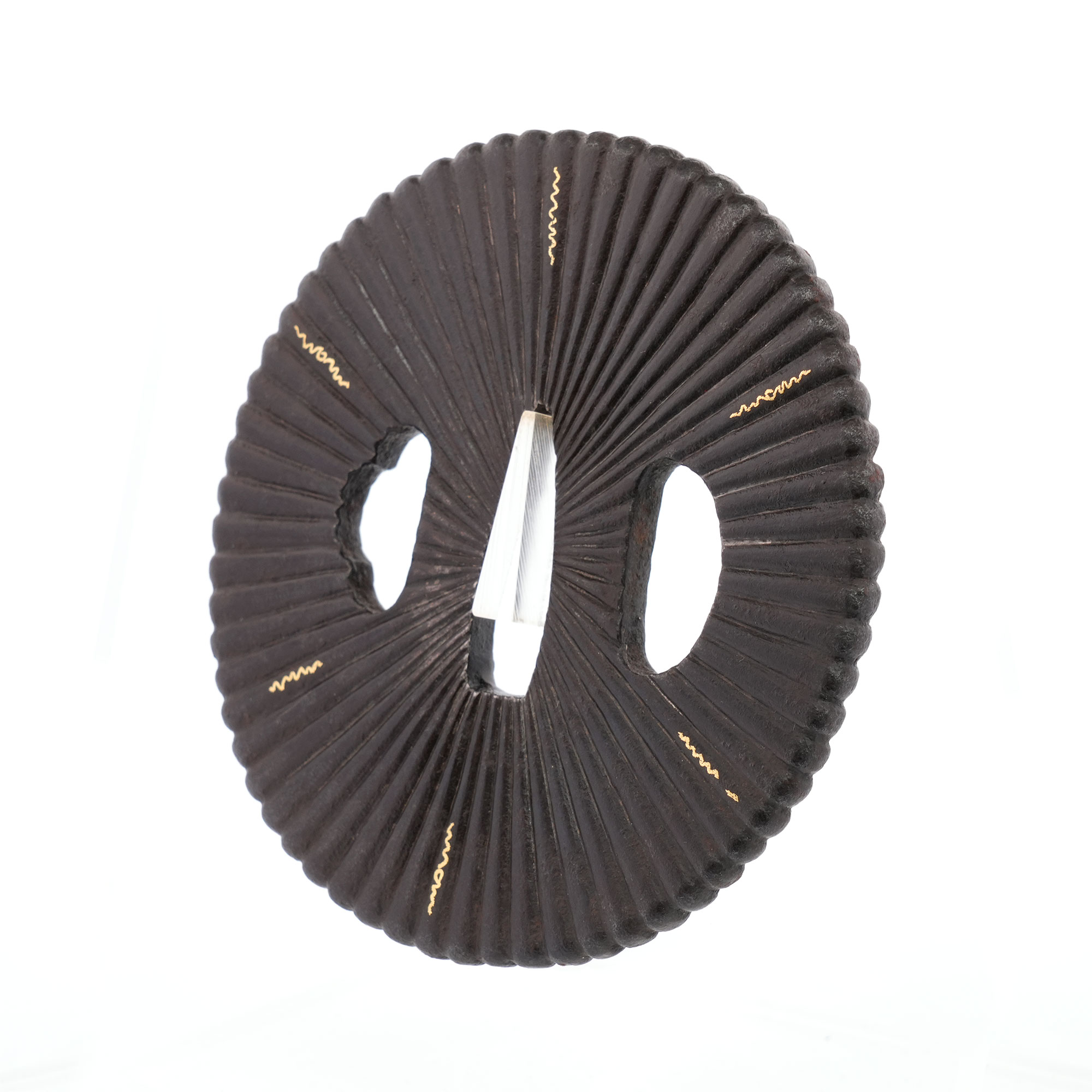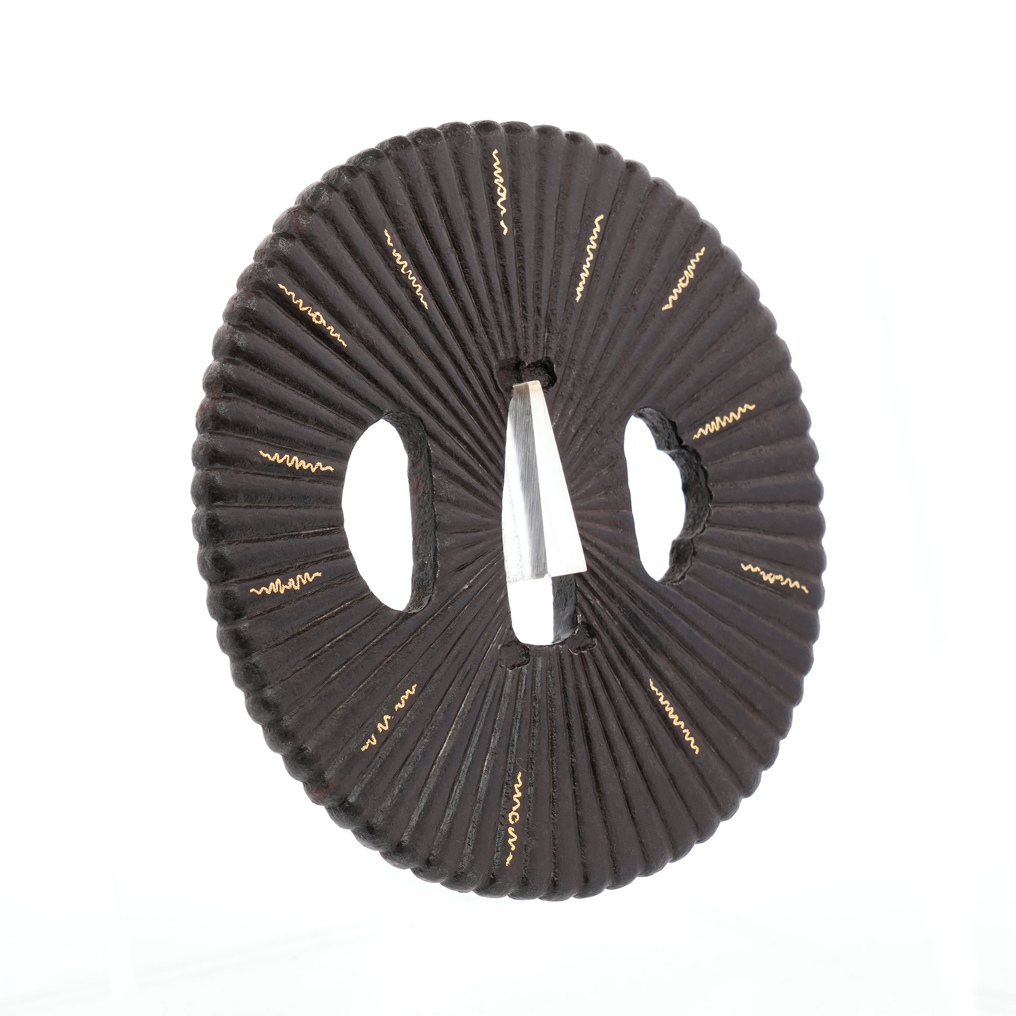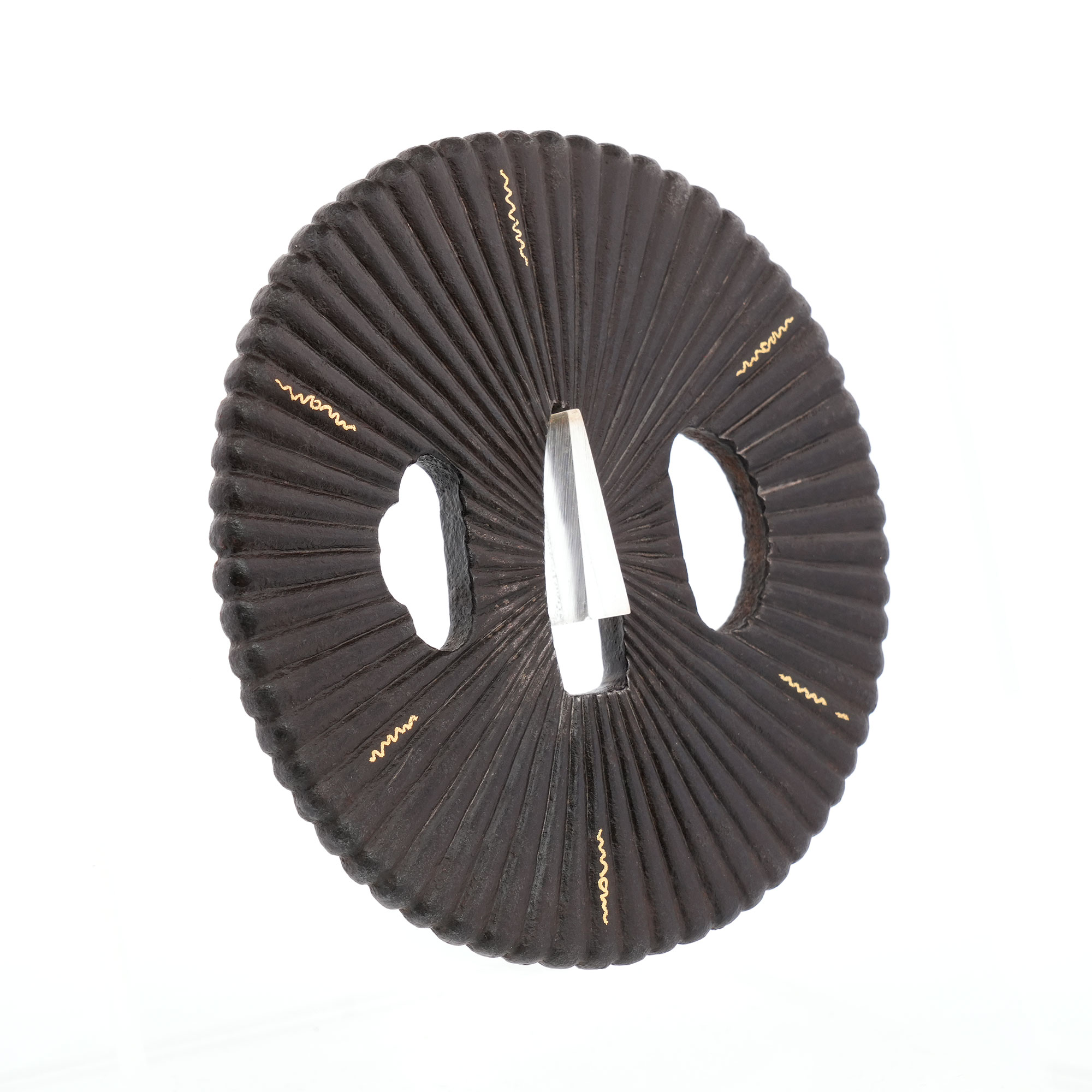 鍛えのよい鉄地に放射状の鑢目を精緻に施し、菊花を想わせる優美な姿に仕上げた鐔。大小いずれの象嵌にも剥離は殆ど認められず、往時の風趣を今に伝える健全な佳作である。