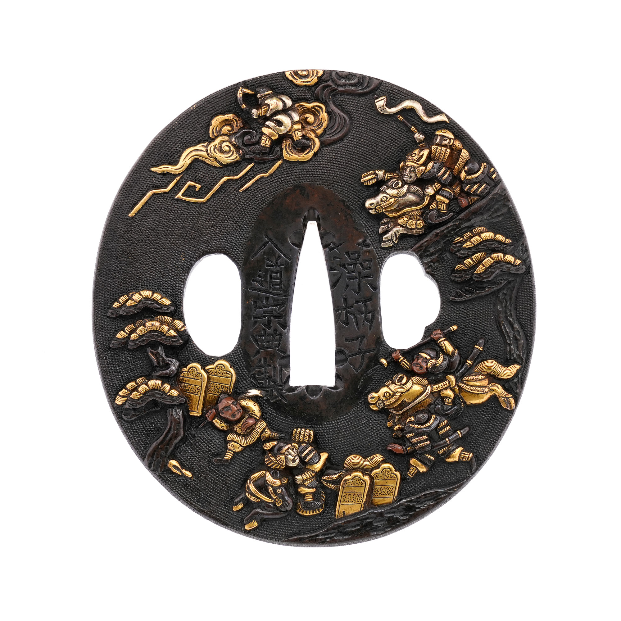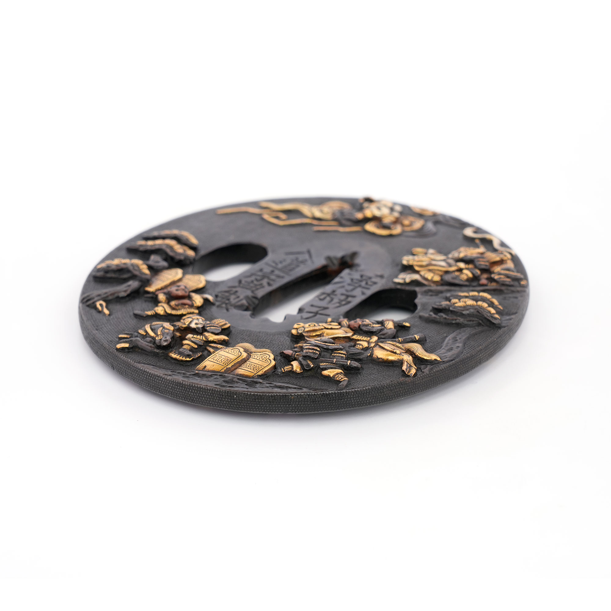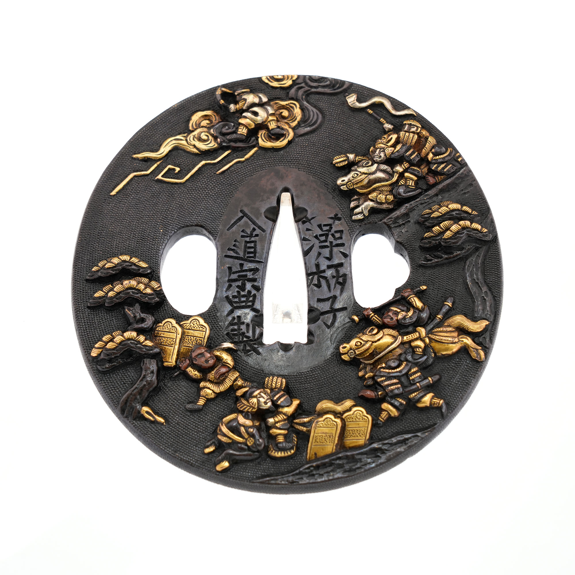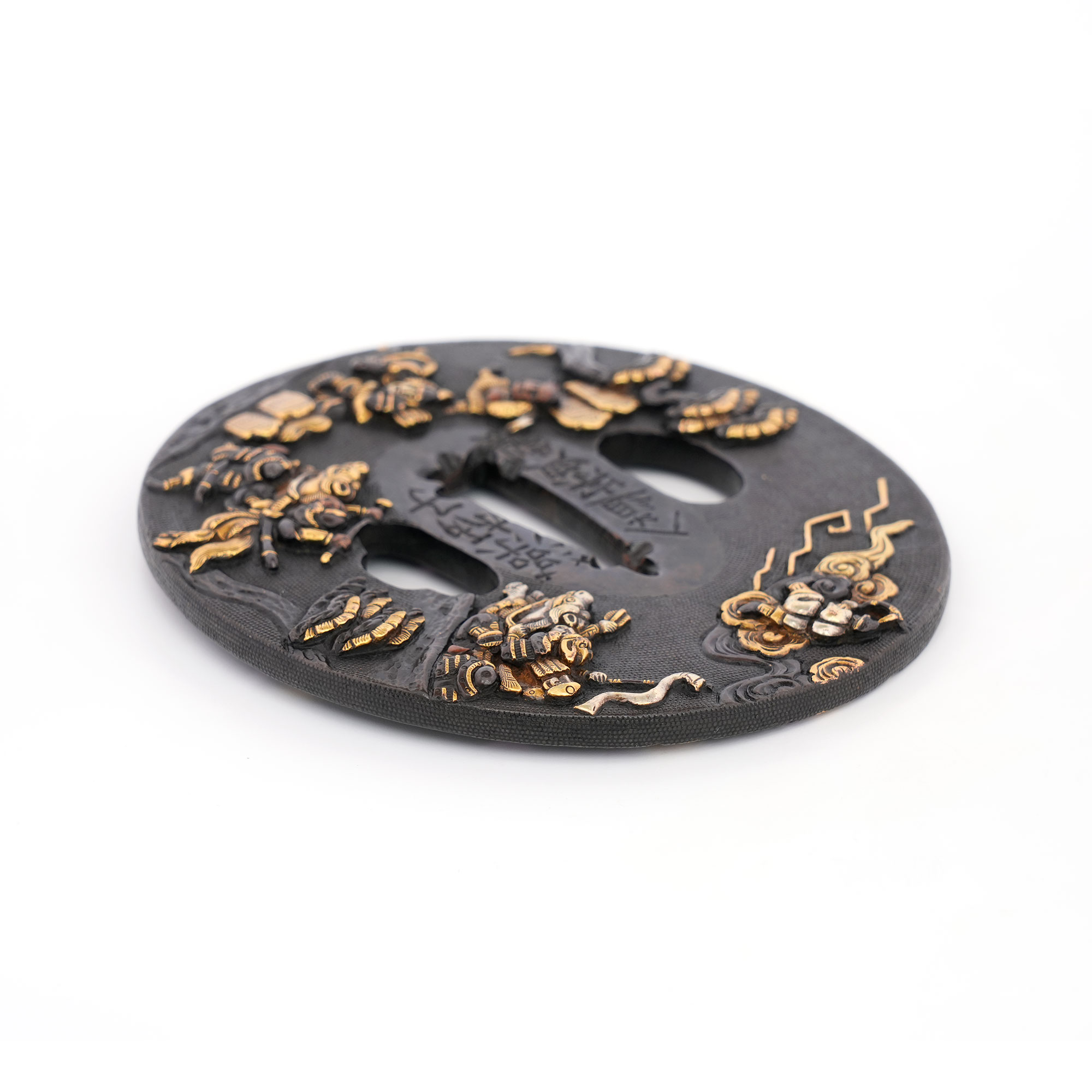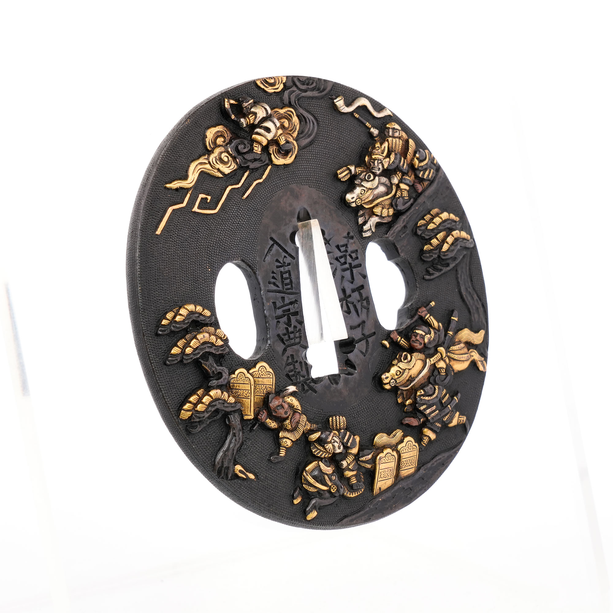 赤銅地に細やかに魚子を打ち、元寇の戦いを巧緻な彫技で表した作品。文永の役における神風を、雲上より弓を引く雷神の姿で象徴的に表している点が実に興味深い。彫口には確かな力があり、題材と表現とが見事に調和した優品である。