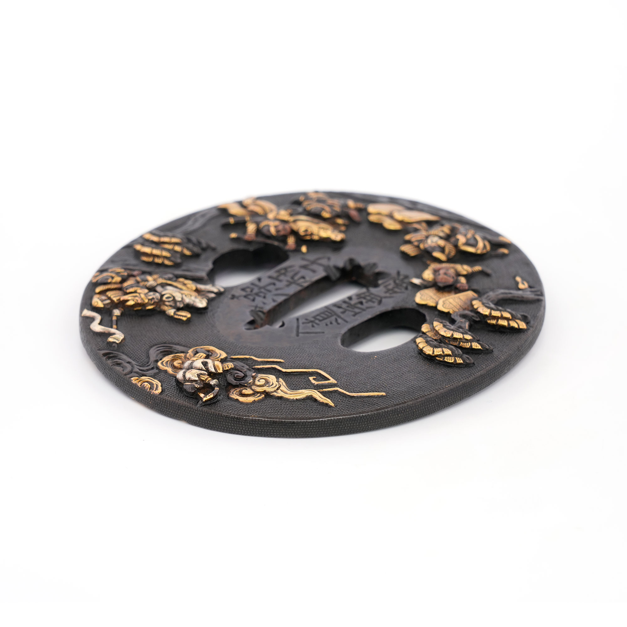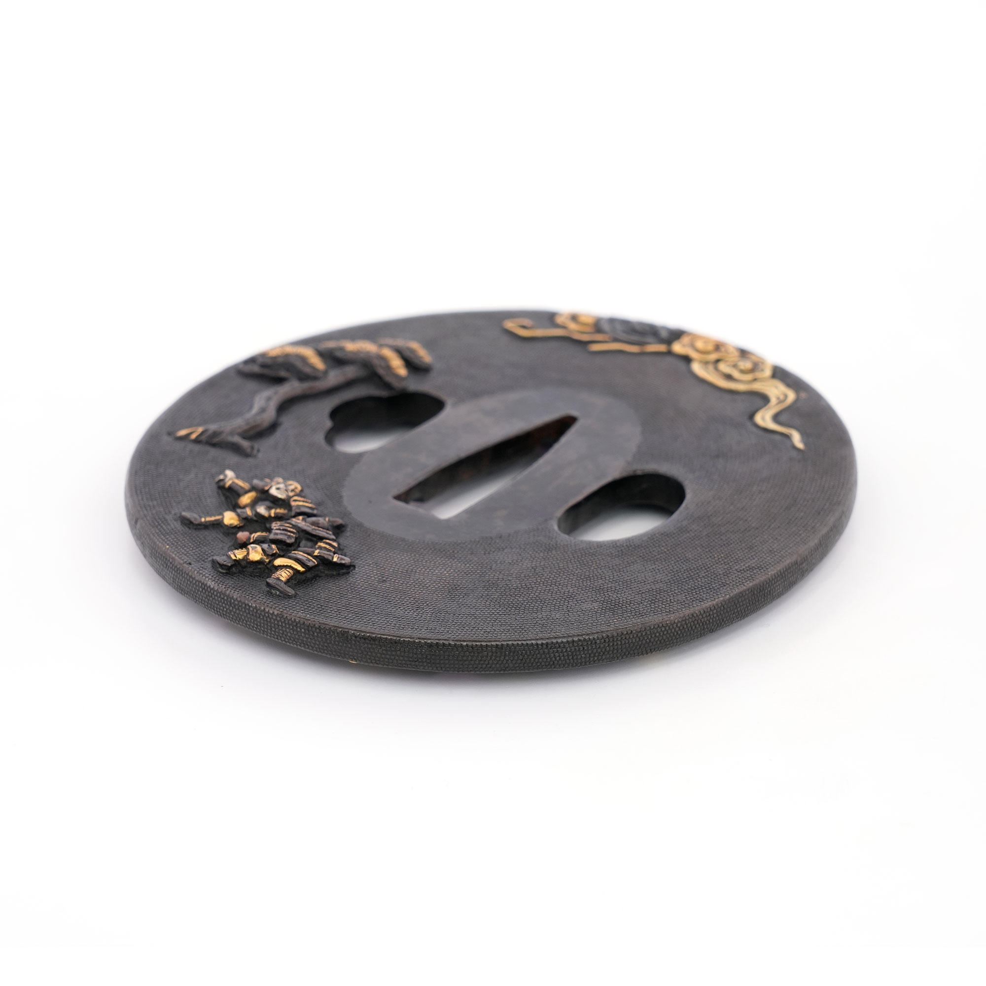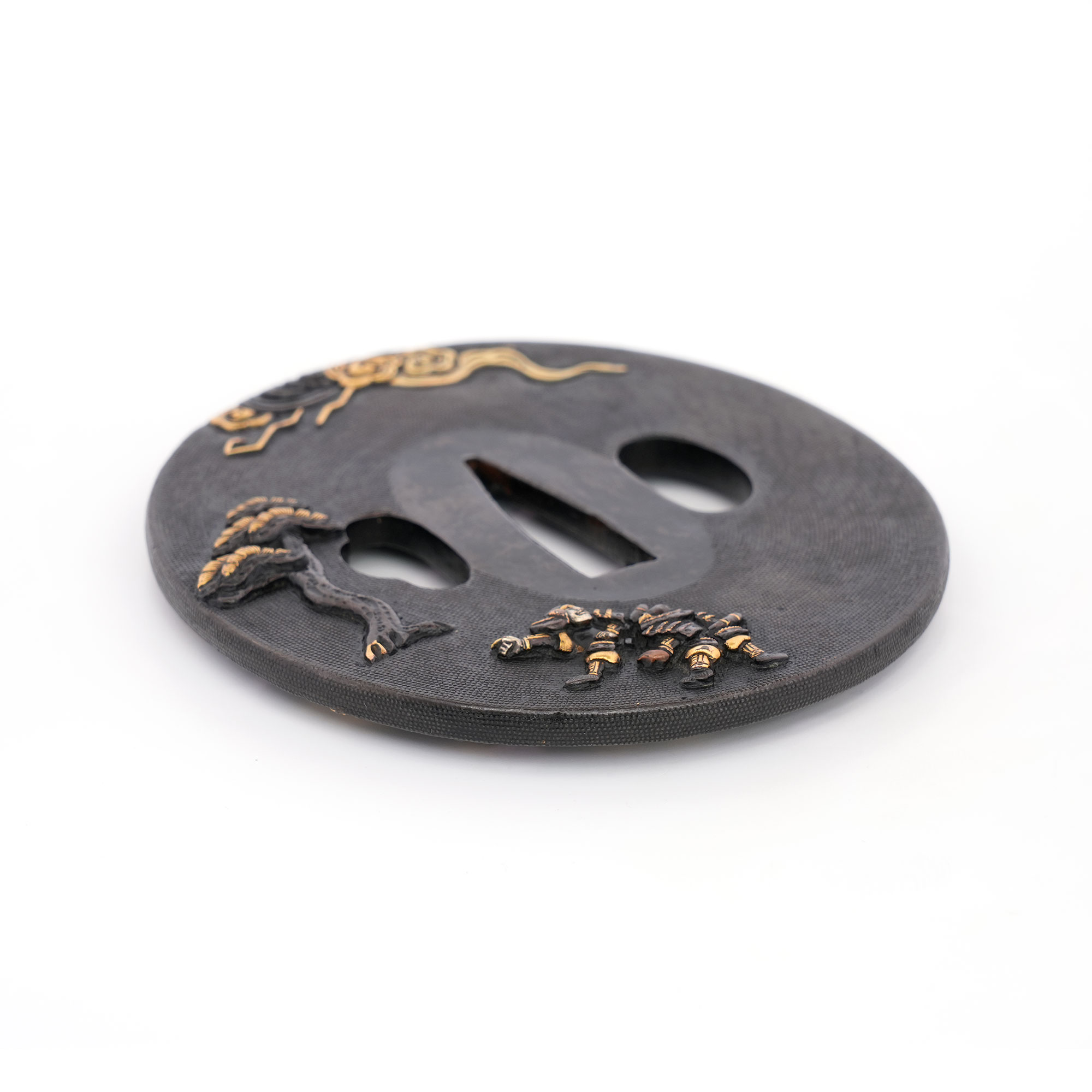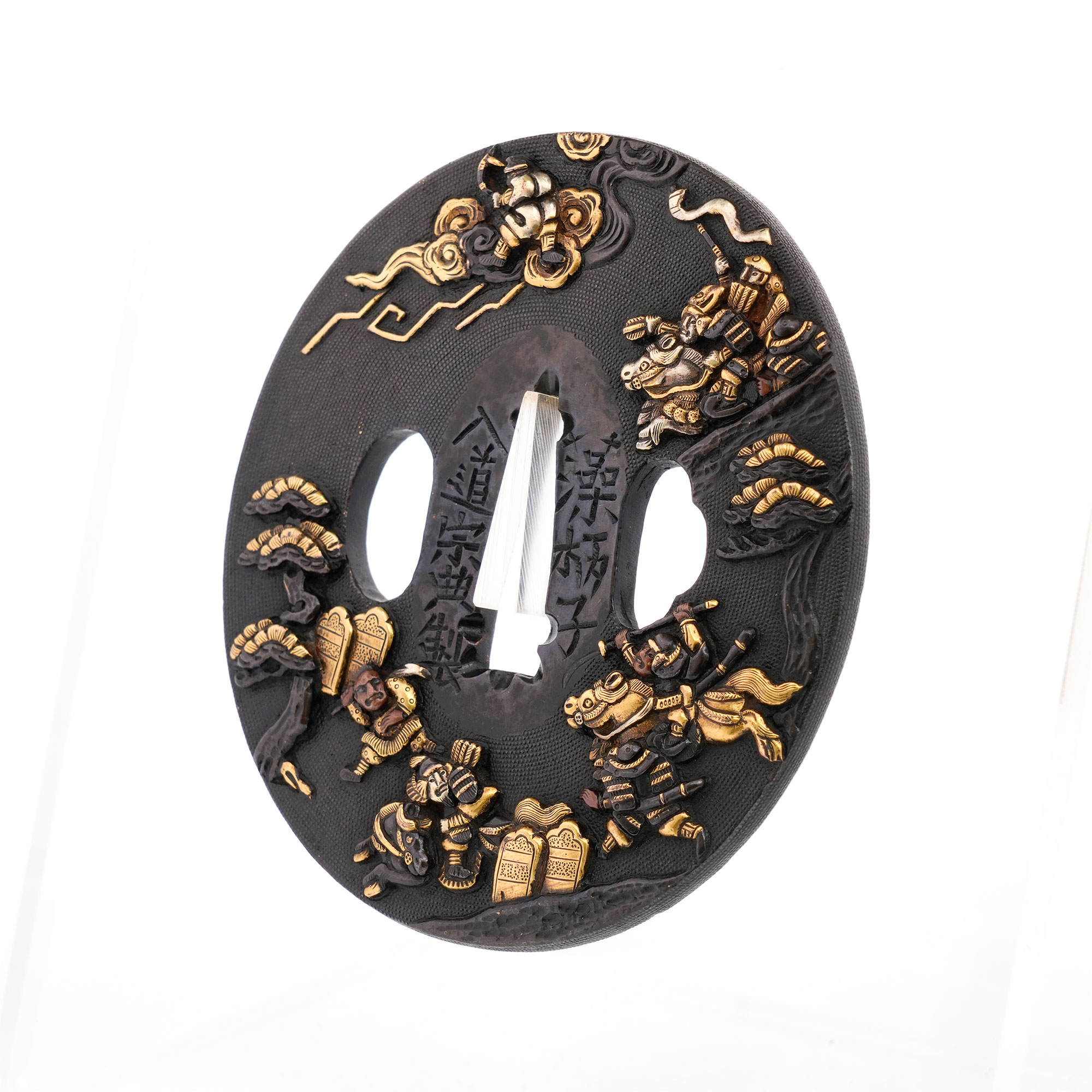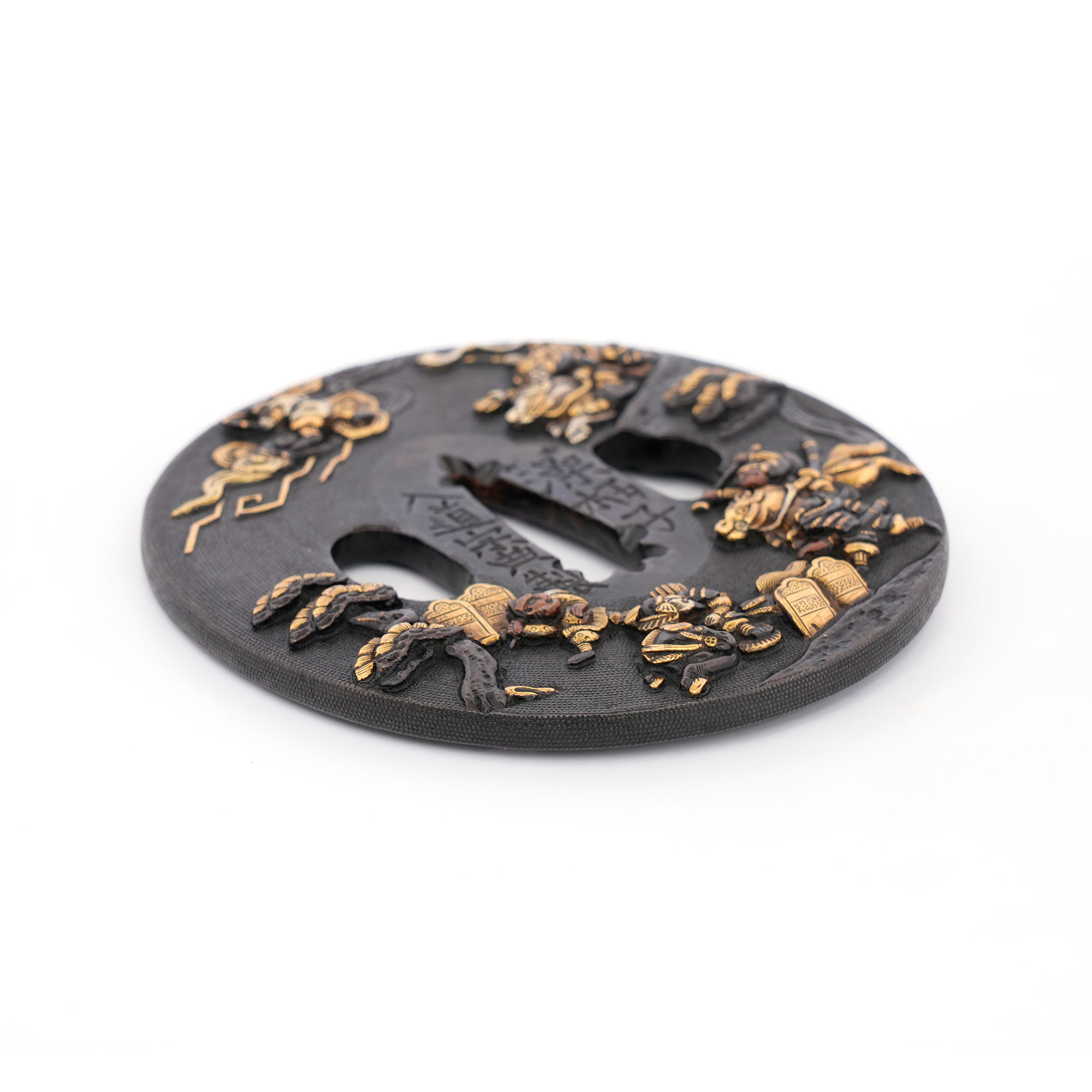 赤銅地に細やかに魚子を打ち、元寇の戦いを巧緻な彫技で表した作品。文永の役における神風を、雲上より弓を引く雷神の姿で象徴的に表している点が実に興味深い。彫口には確かな力があり、題材と表現とが見事に調和した優品である。