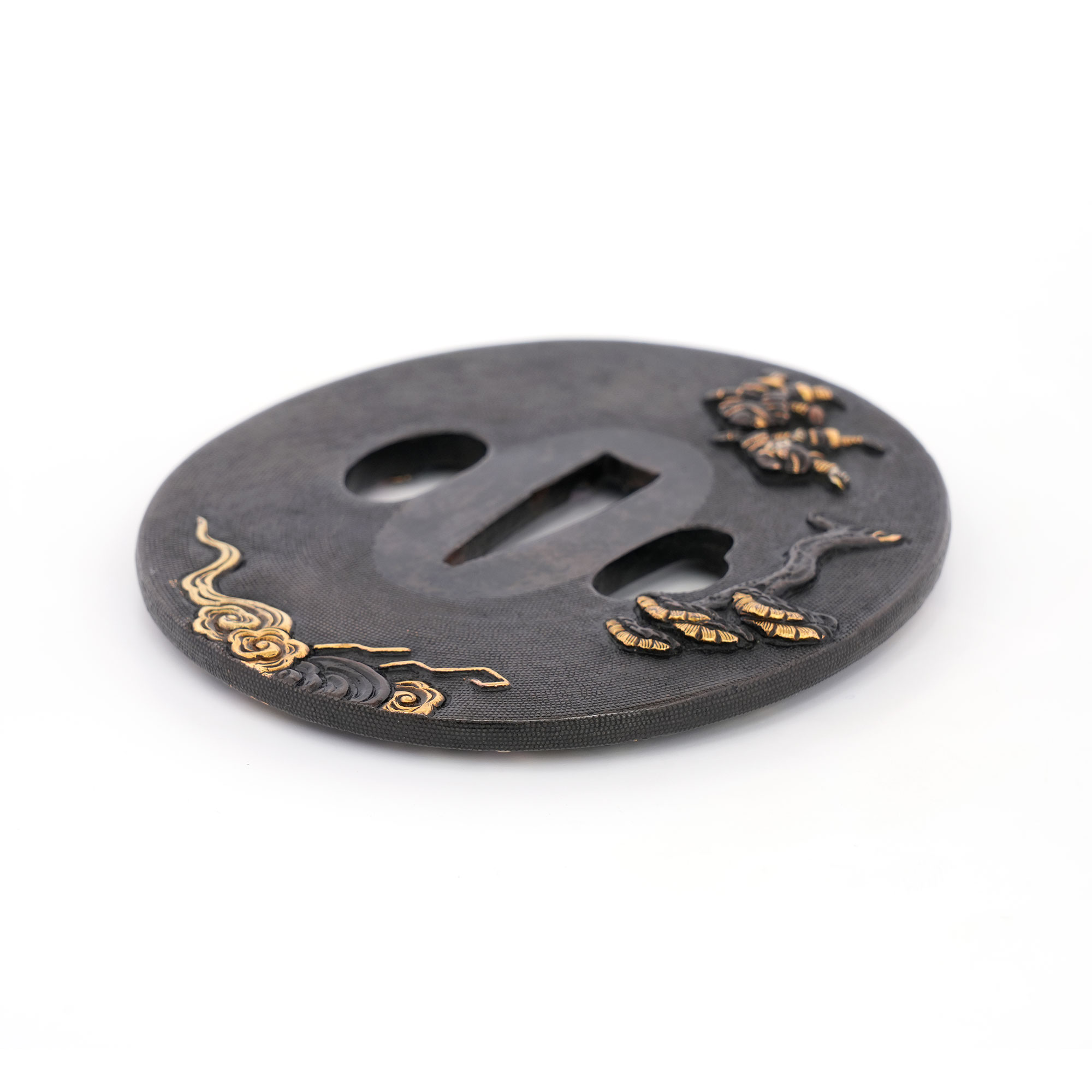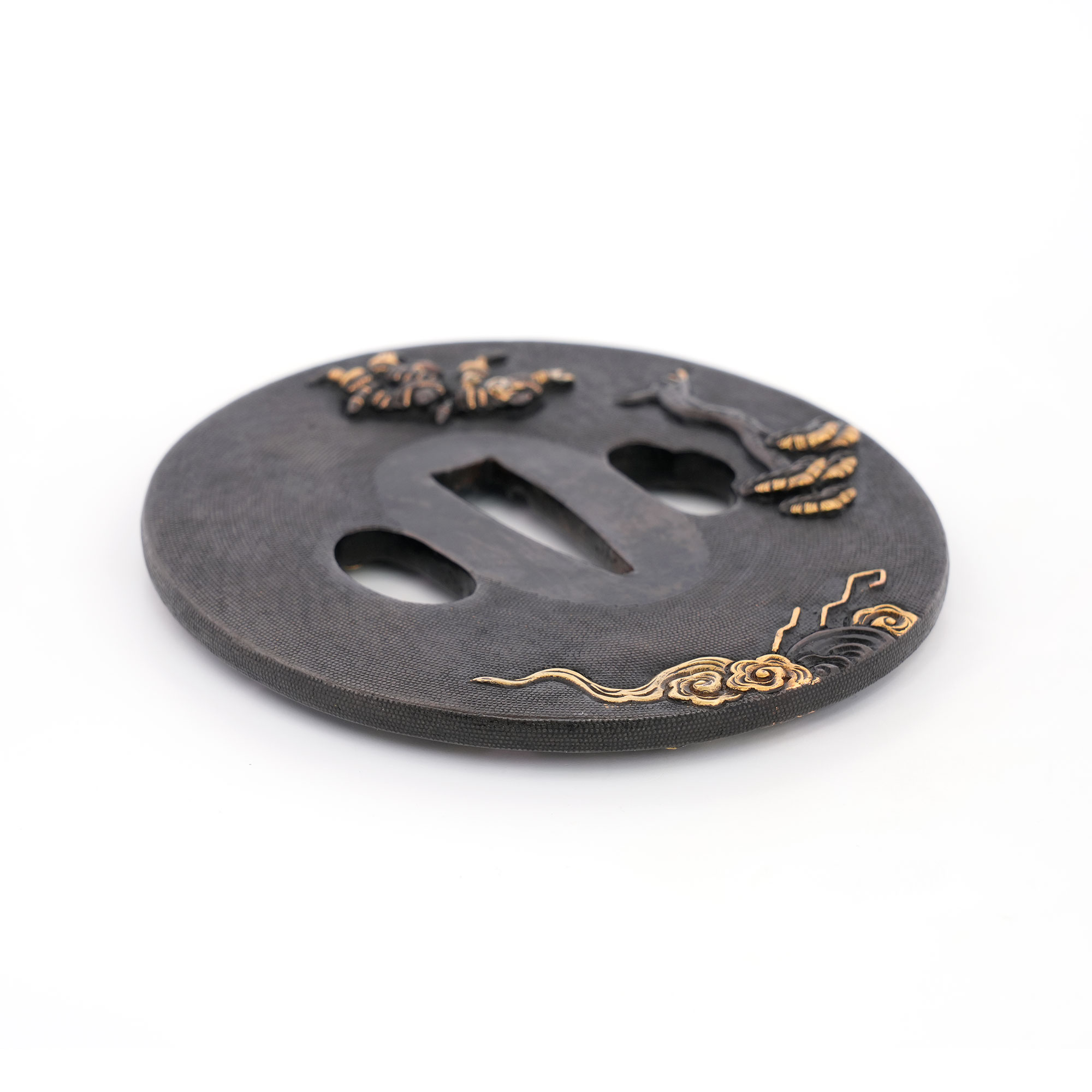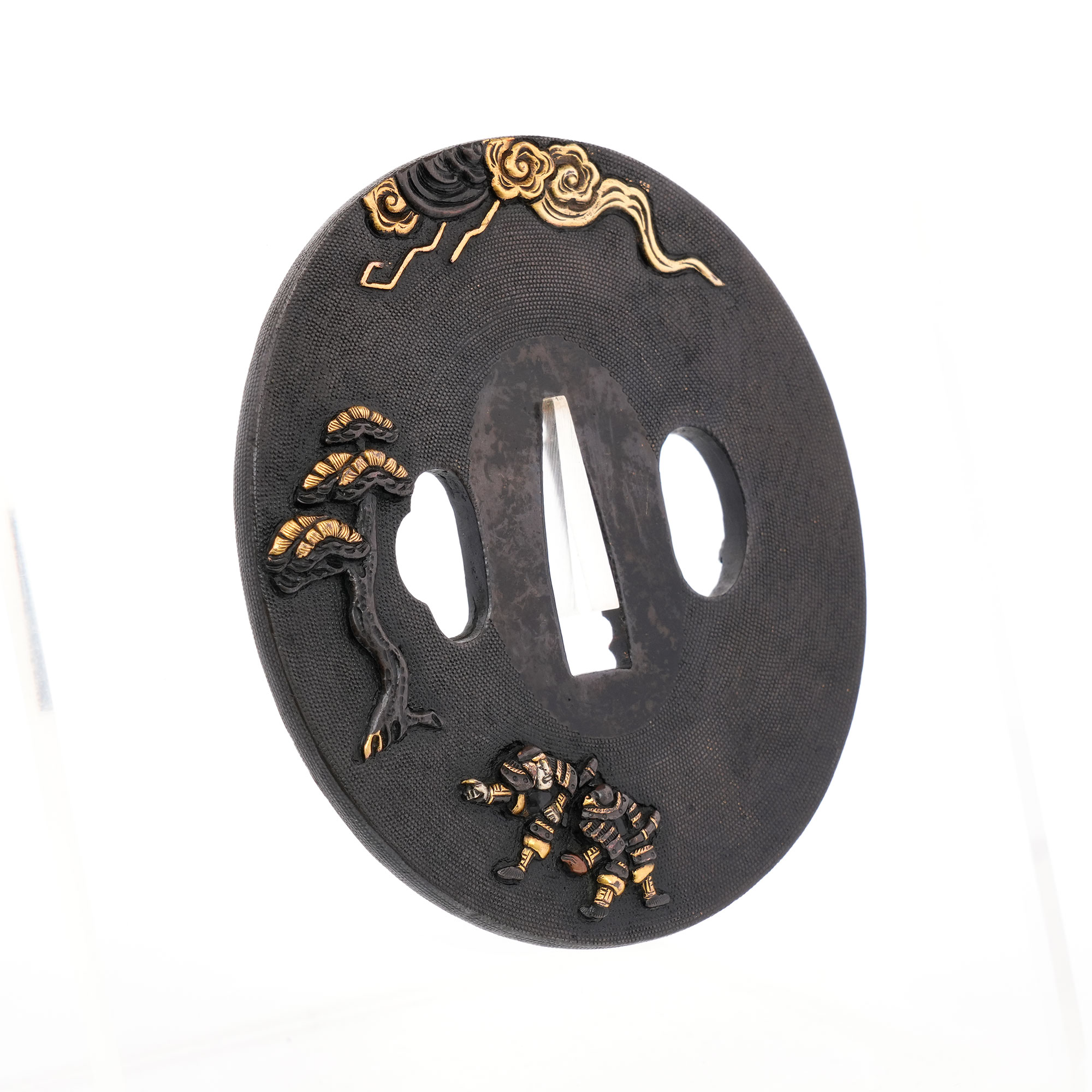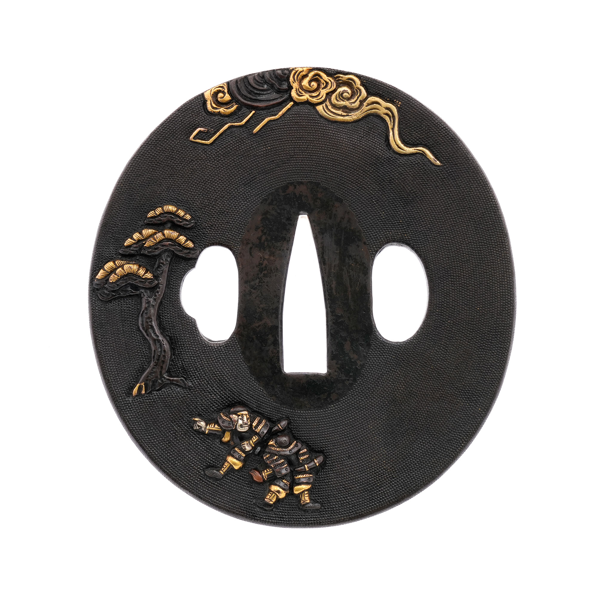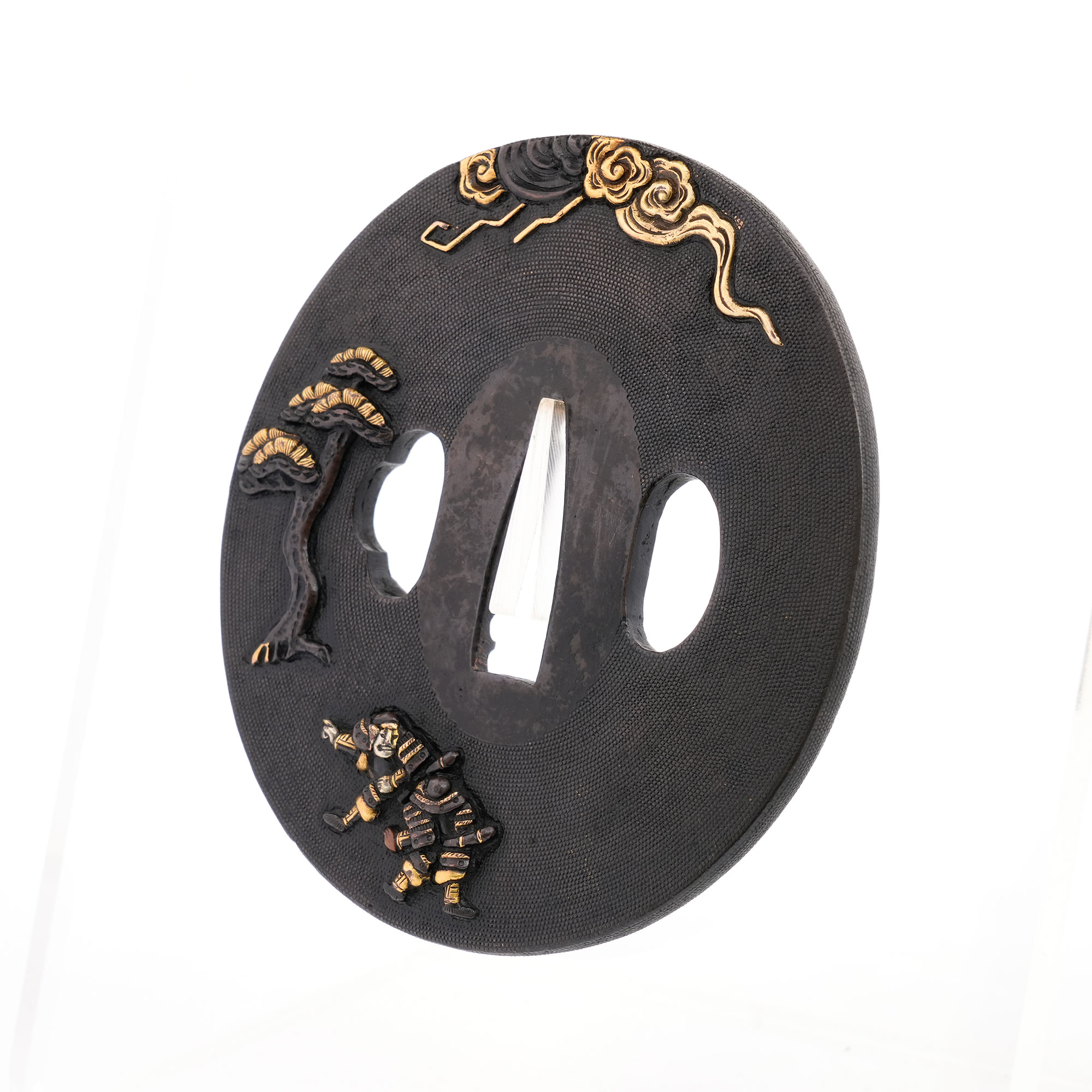 赤銅地に細やかに魚子を打ち、元寇の戦いを巧緻な彫技で表した作品。文永の役における神風を、雲上より弓を引く雷神の姿で象徴的に表している点が実に興味深い。彫口には確かな力があり、題材と表現とが見事に調和した優品である。