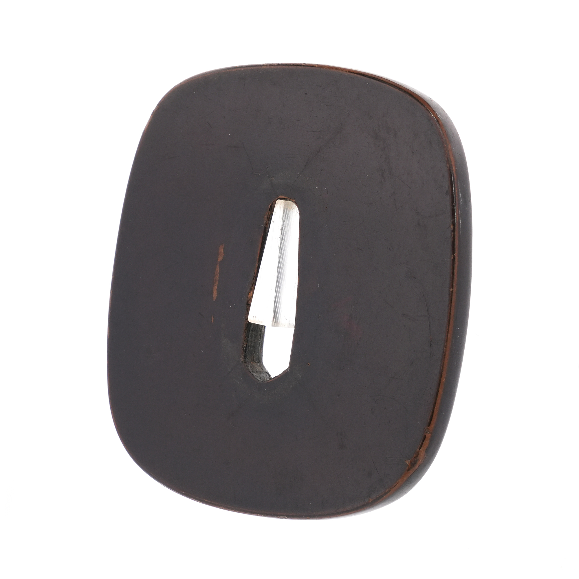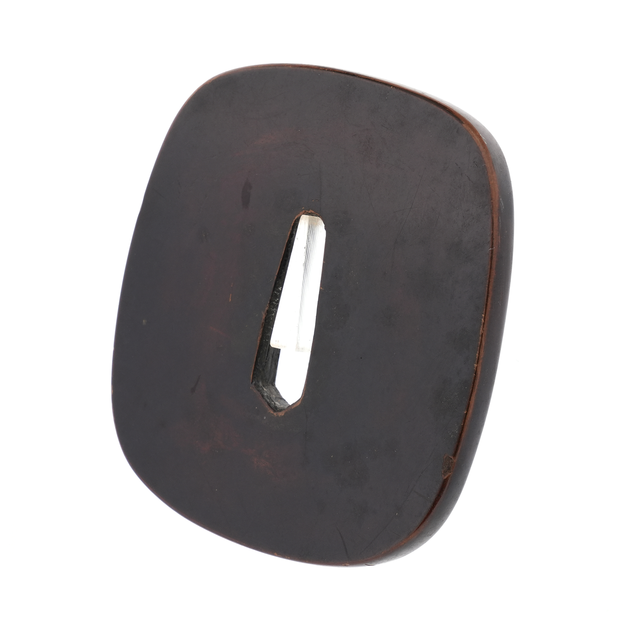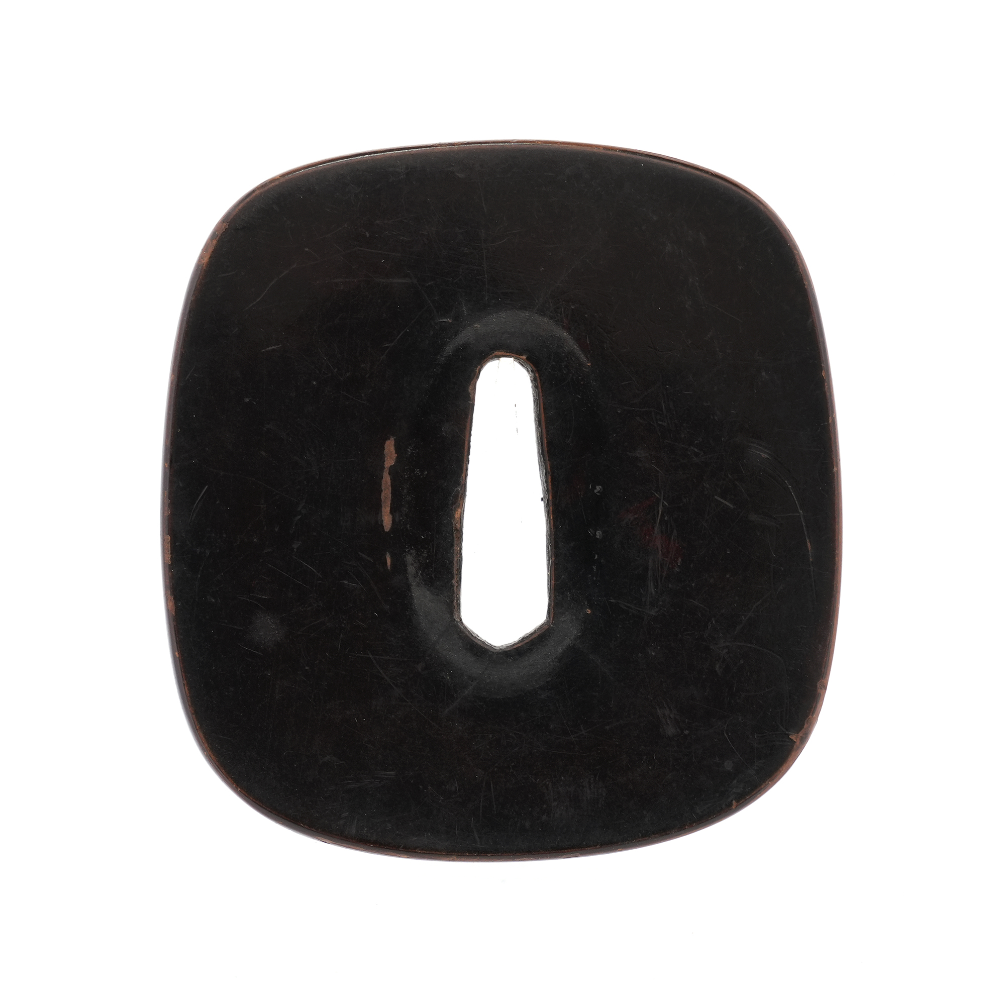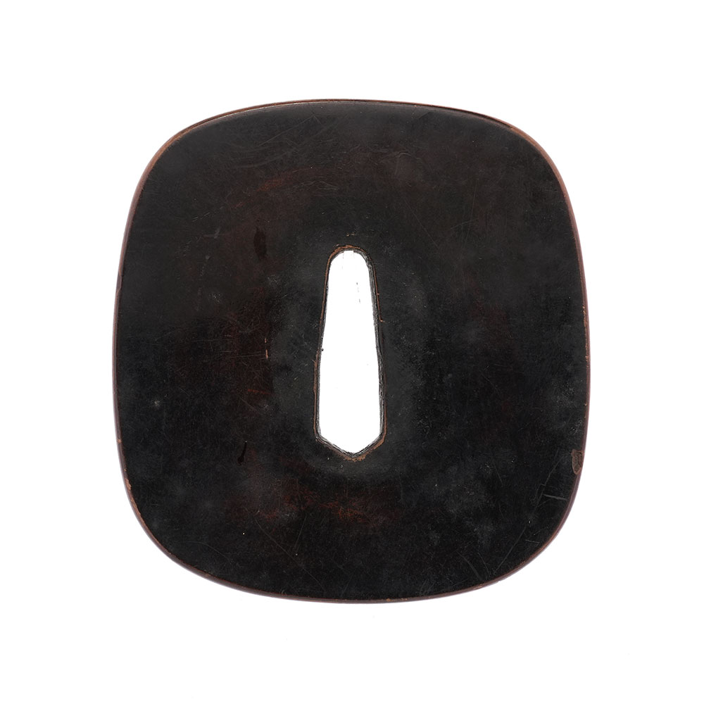 本作は、89.5ミリとかなり大振りでありつつ、気品漂う赤銅磨地の献上鐔で、小柄笄穴を設けず、端正で引き締まった意匠となっています。献上鐔は登城の際の大小拵に用いられるもので、武家における格式を示す重要な装具であり、質素な中にも威儀と華やぎを兼ね備えています。 磨き上げられた赤銅地の深みある色味は、静謐さと高貴さを同時に湛えており、まさに武家の品格を象徴する作と言えます。格式高き献上鐔として、コレクションの中心を飾るに相応しい逸品です。