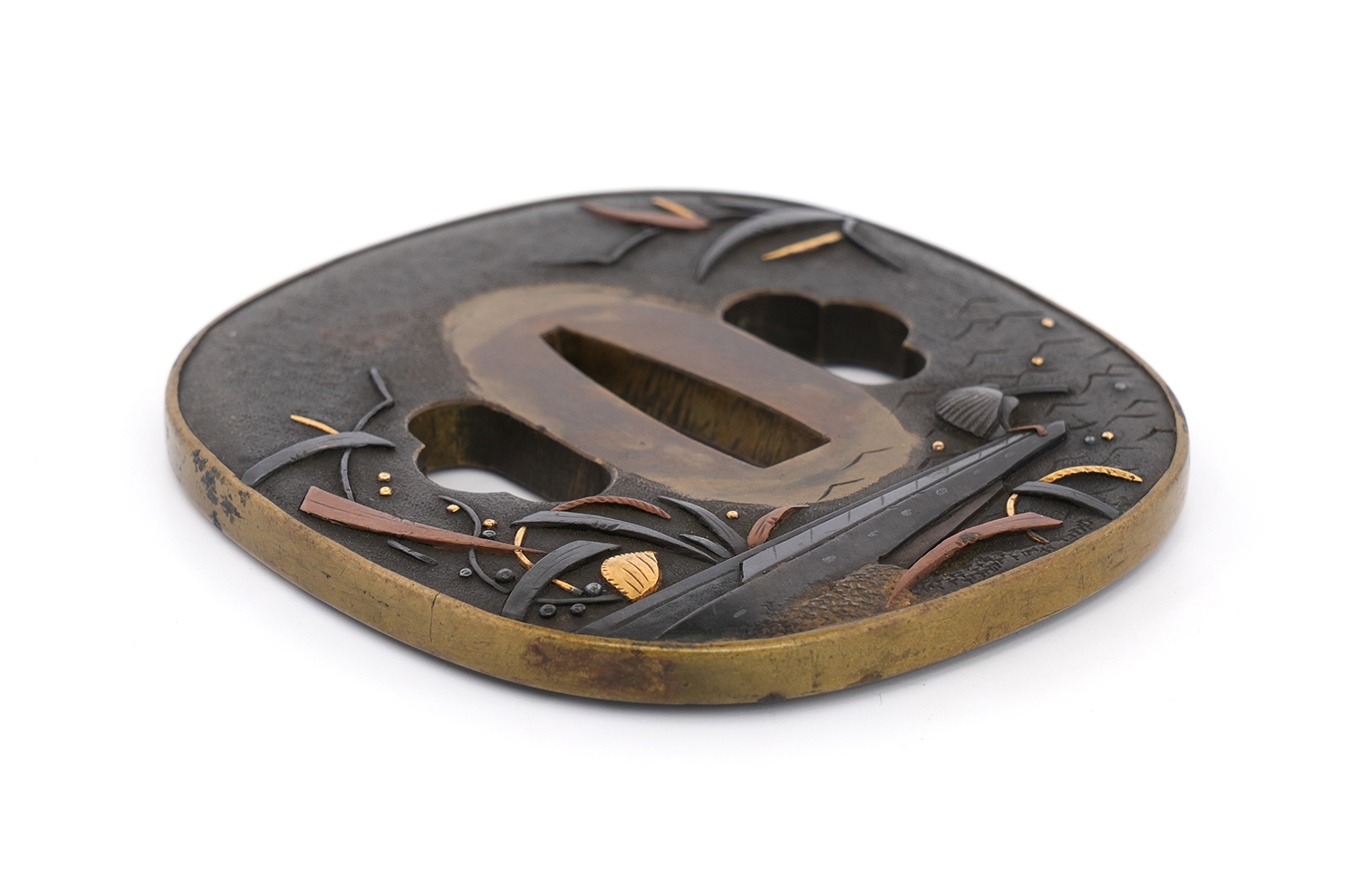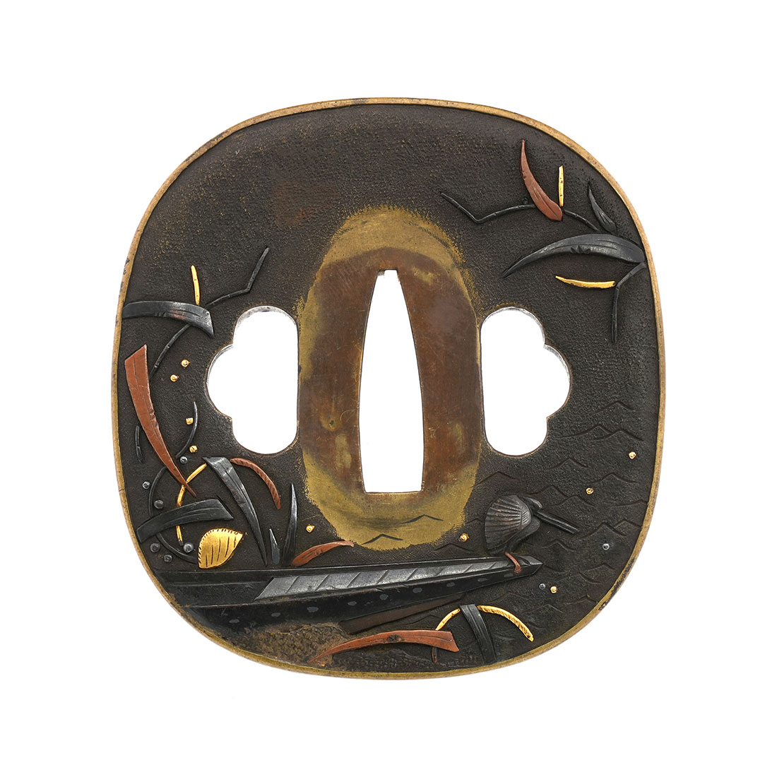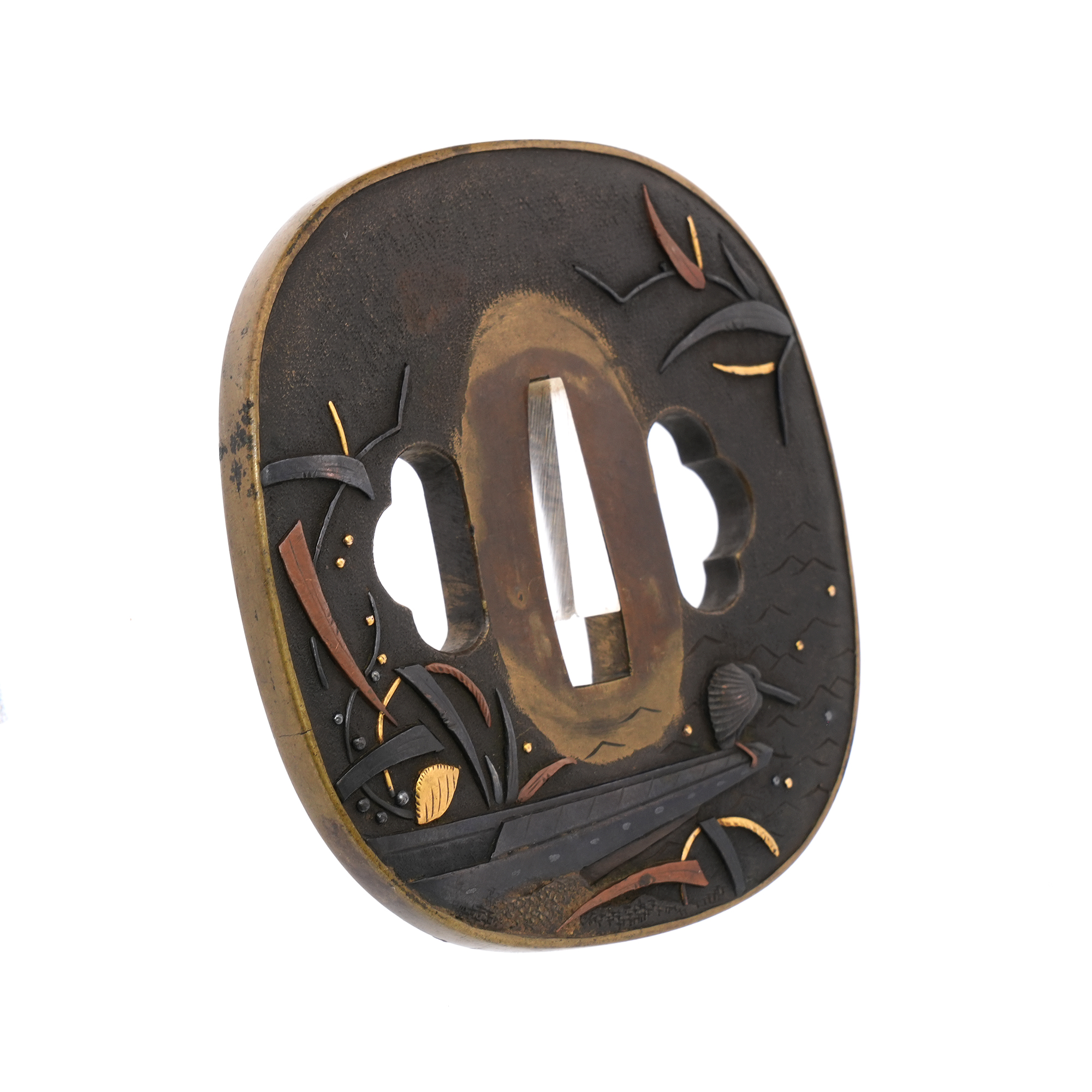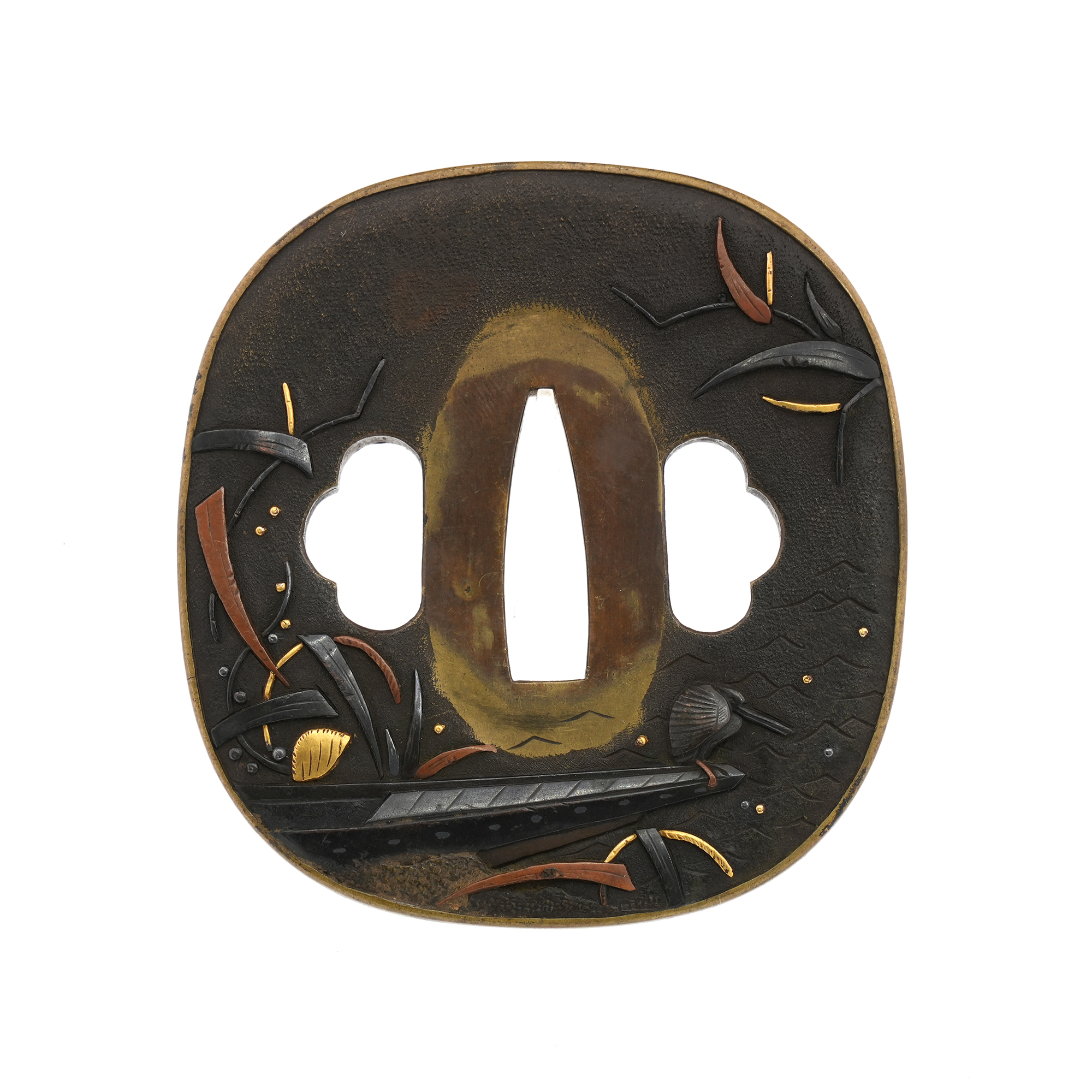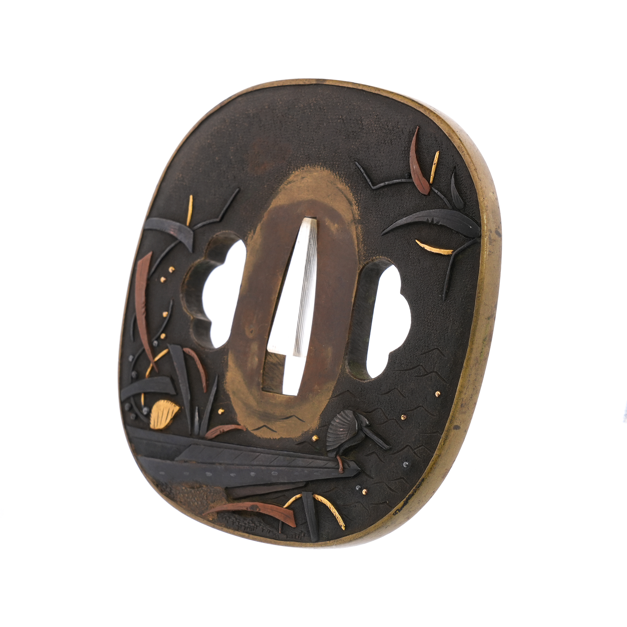 本鐔の画題「一路平安」にも深い意味が込められています。鷺は中国語で「路」と同音であり、一羽の鷺は一路を象徴し、旅路の平安を祈る意があるとされます。本作では、葦が茂る川辺に繋留された舟の舳先に、一羽の鷺が羽を休めている姿が描かれています。旅の途中での休憩か、あるいはこれから舟で旅立つ場面か… そんな情景を、わずか一枚の鐔に巧みに表現しています。