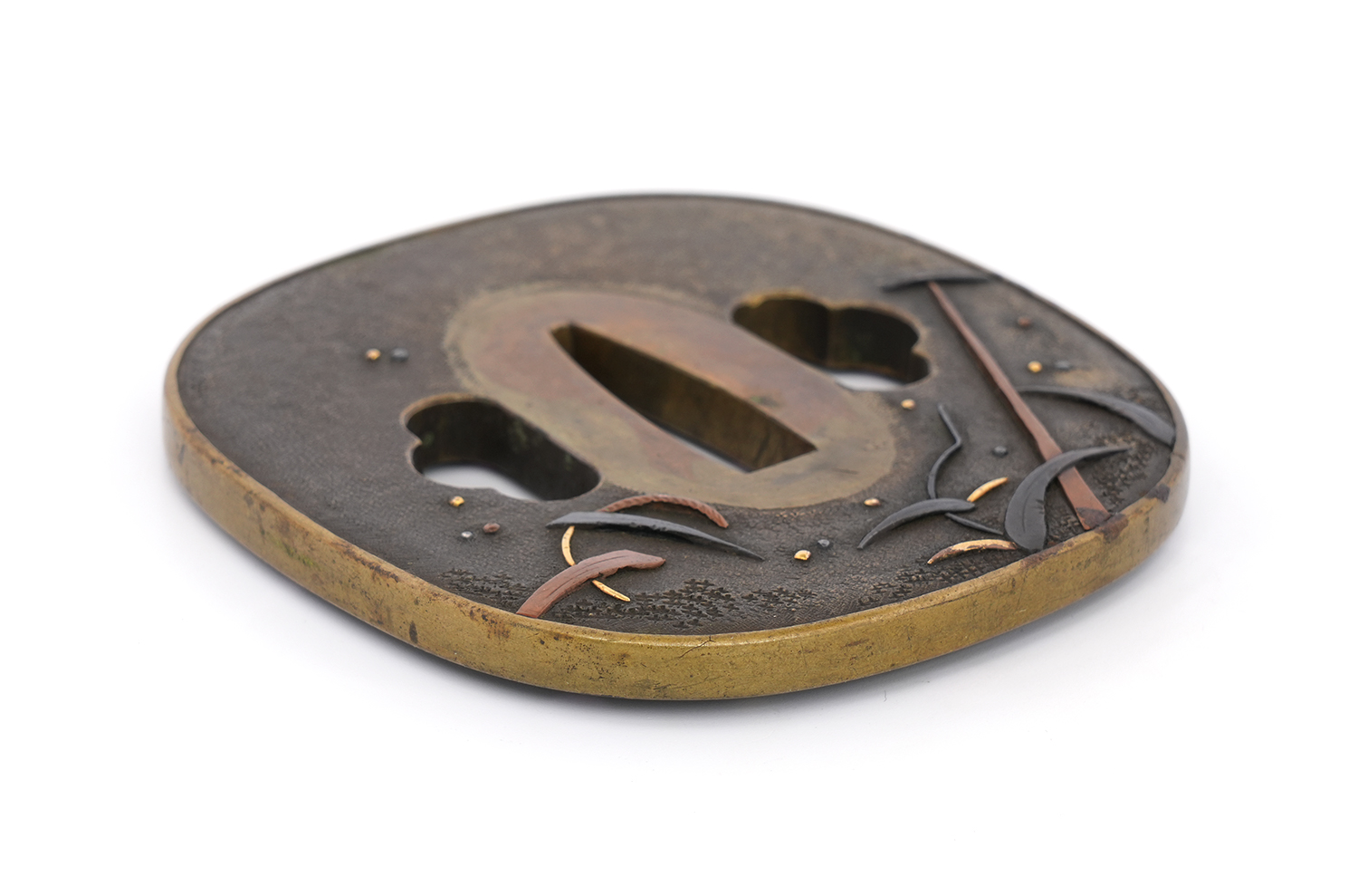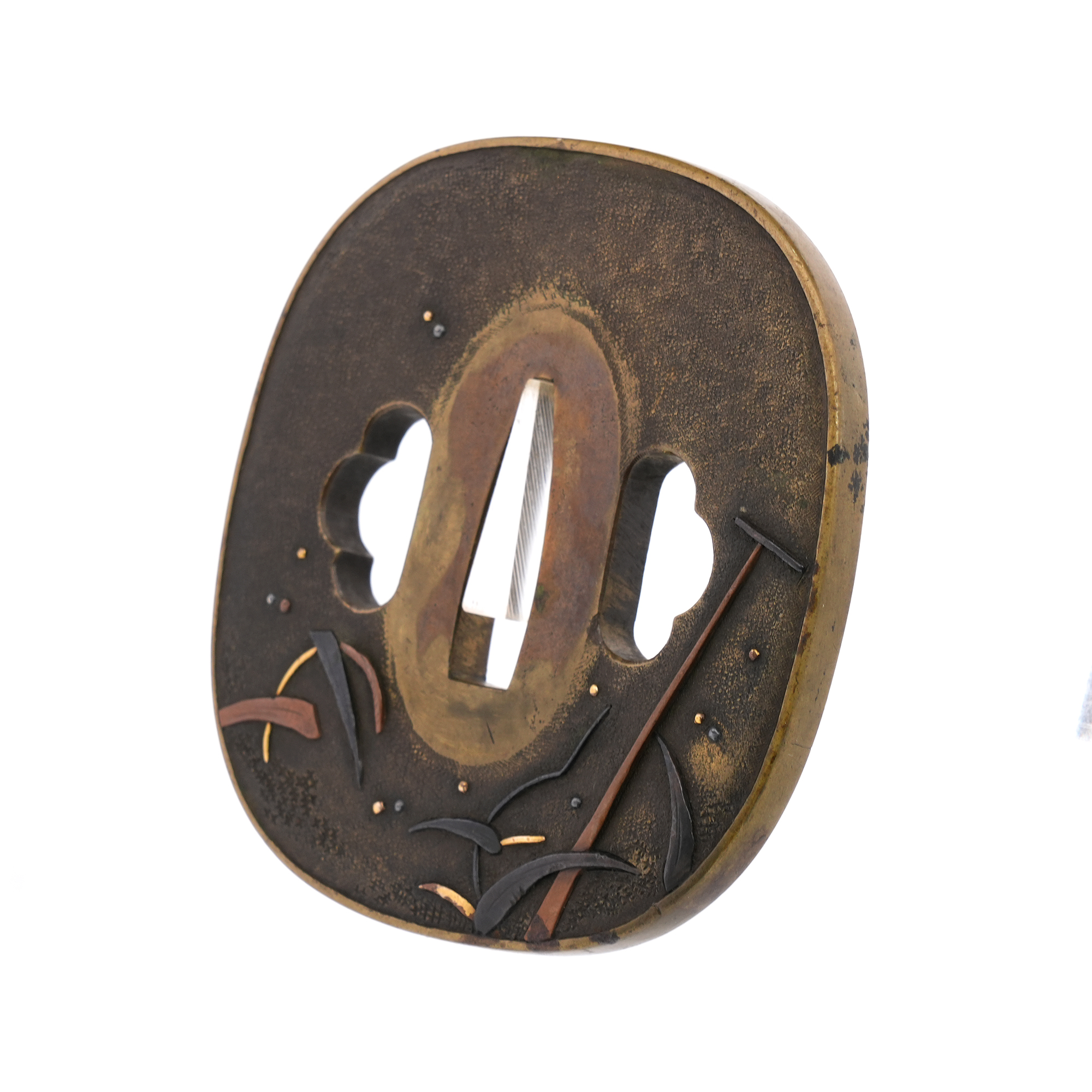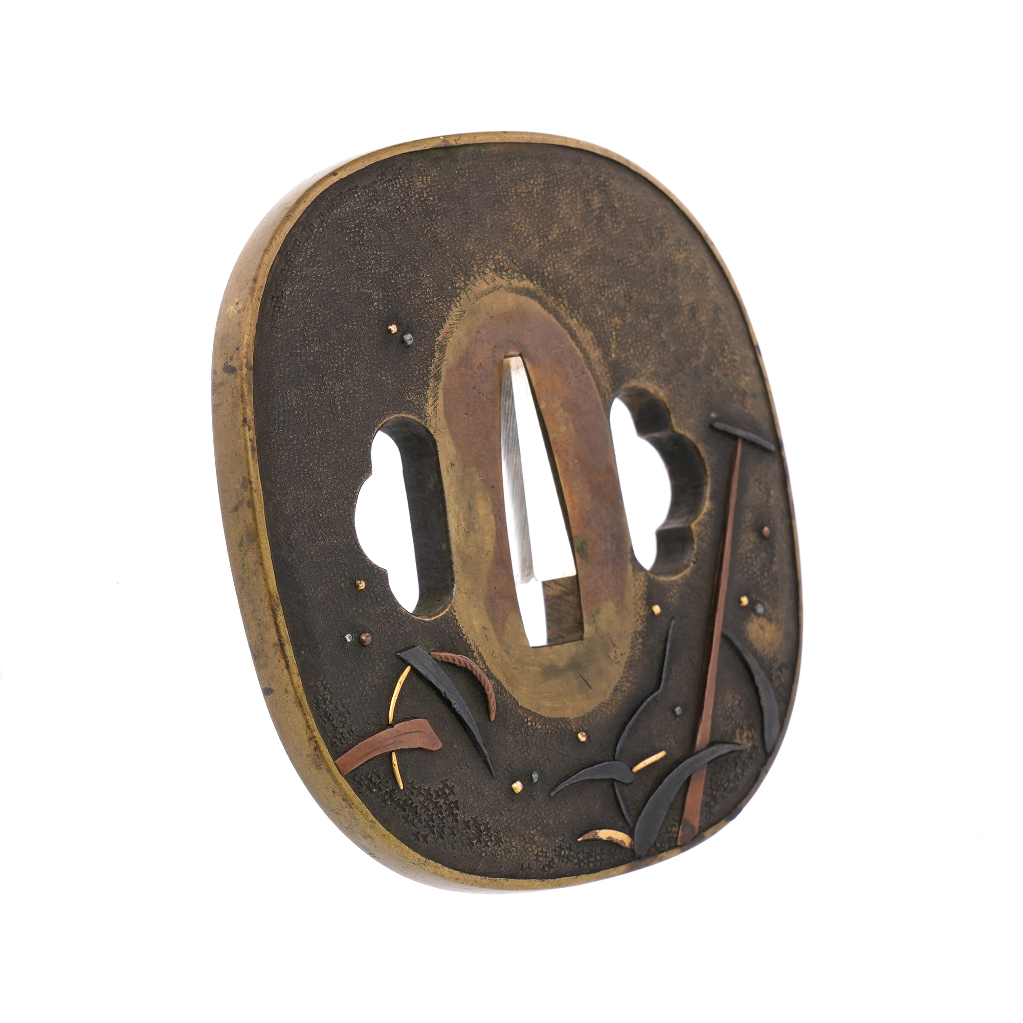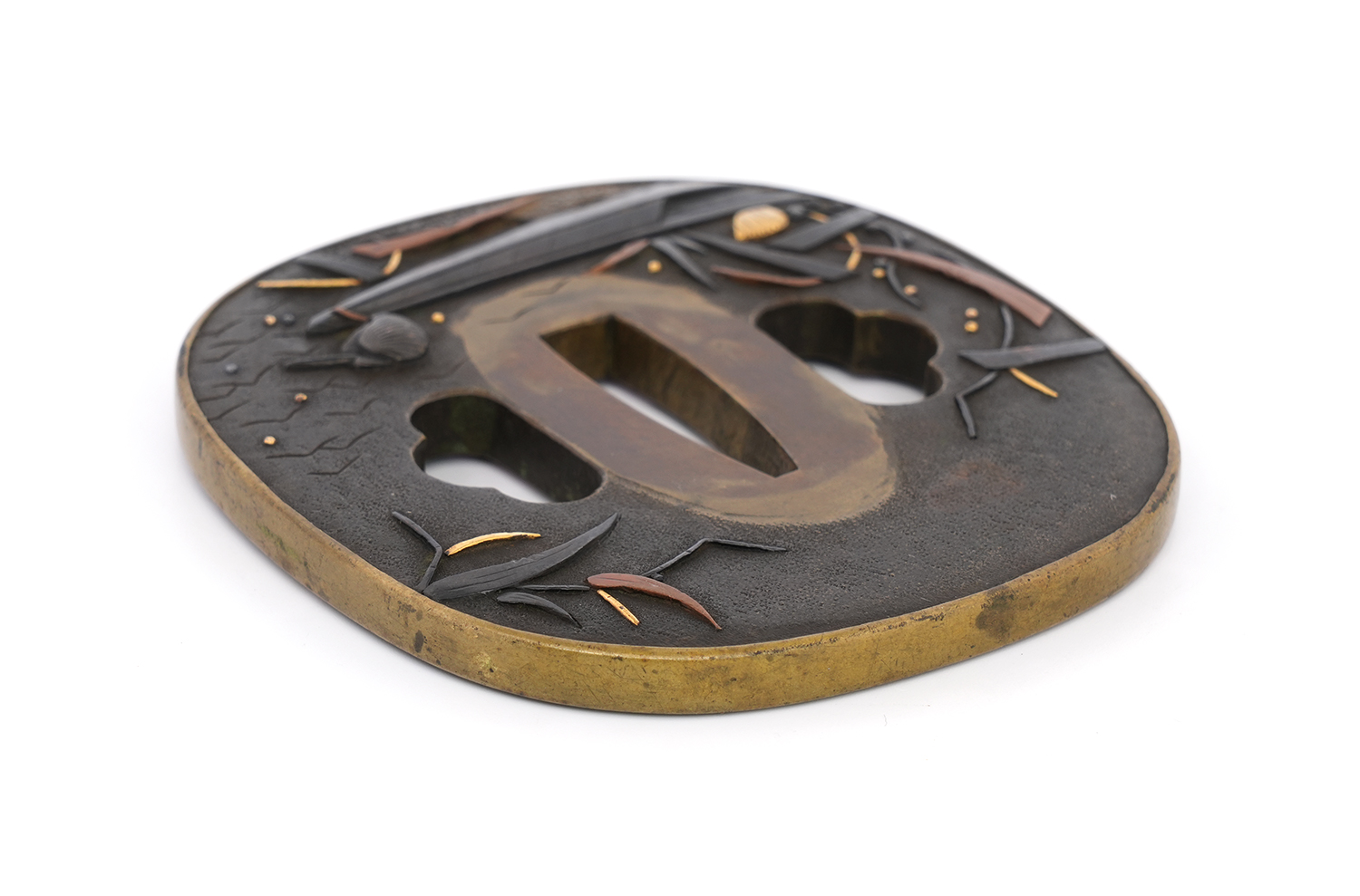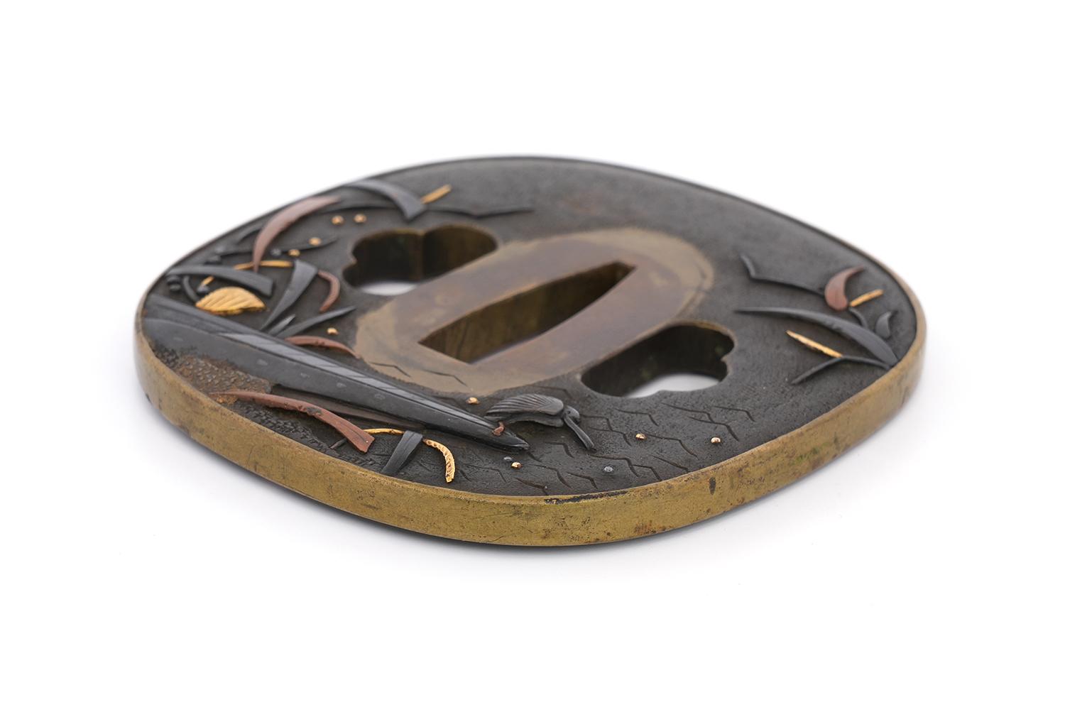 本鐔の画題「一路平安」にも深い意味が込められています。鷺は中国語で「路」と同音であり、一羽の鷺は一路を象徴し、旅路の平安を祈る意があるとされます。本作では、葦が茂る川辺に繋留された舟の舳先に、一羽の鷺が羽を休めている姿が描かれています。旅の途中での休憩か、あるいはこれから舟で旅立つ場面か… そんな情景を、わずか一枚の鐔に巧みに表現しています。