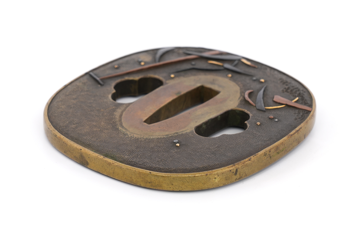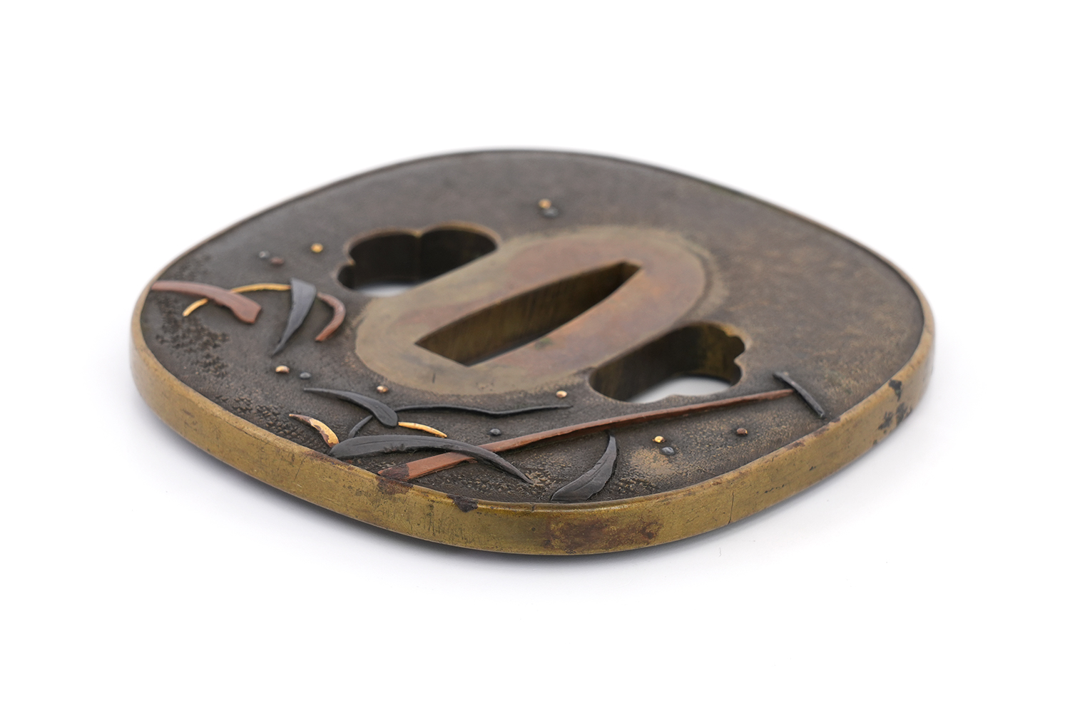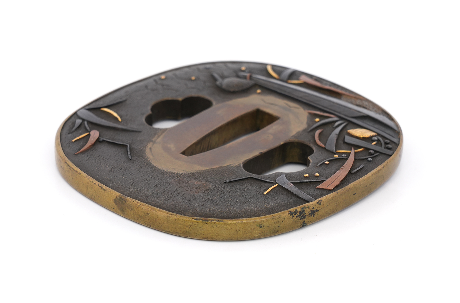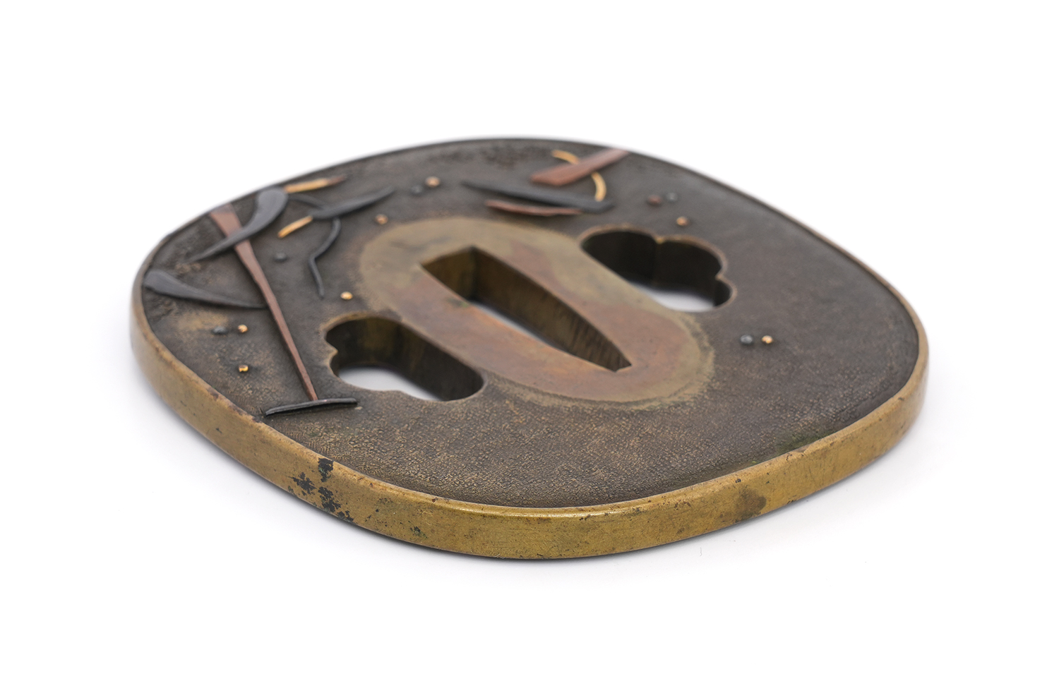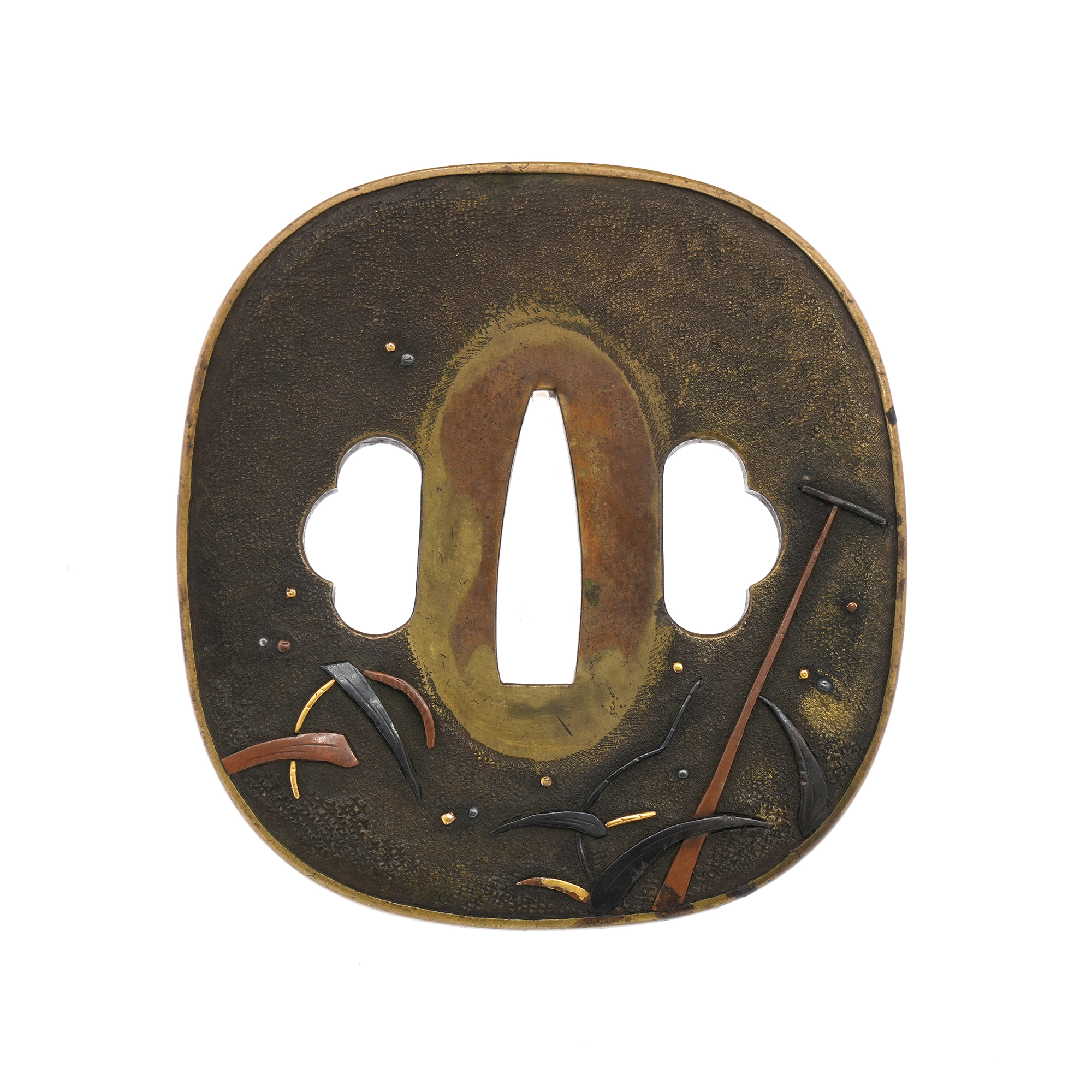 本鐔の画題「一路平安」にも深い意味が込められています。鷺は中国語で「路」と同音であり、一羽の鷺は一路を象徴し、旅路の平安を祈る意があるとされます。本作では、葦が茂る川辺に繋留された舟の舳先に、一羽の鷺が羽を休めている姿が描かれています。旅の途中での休憩か、あるいはこれから舟で旅立つ場面か… そんな情景を、わずか一枚の鐔に巧みに表現しています。