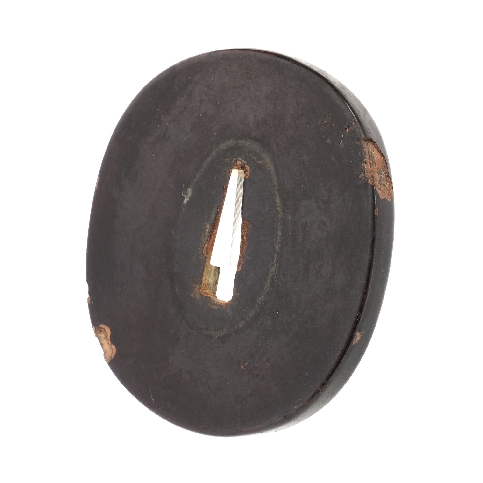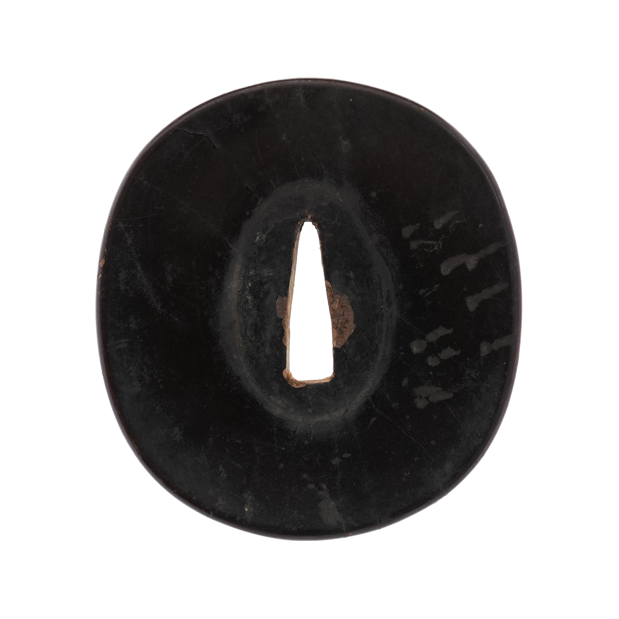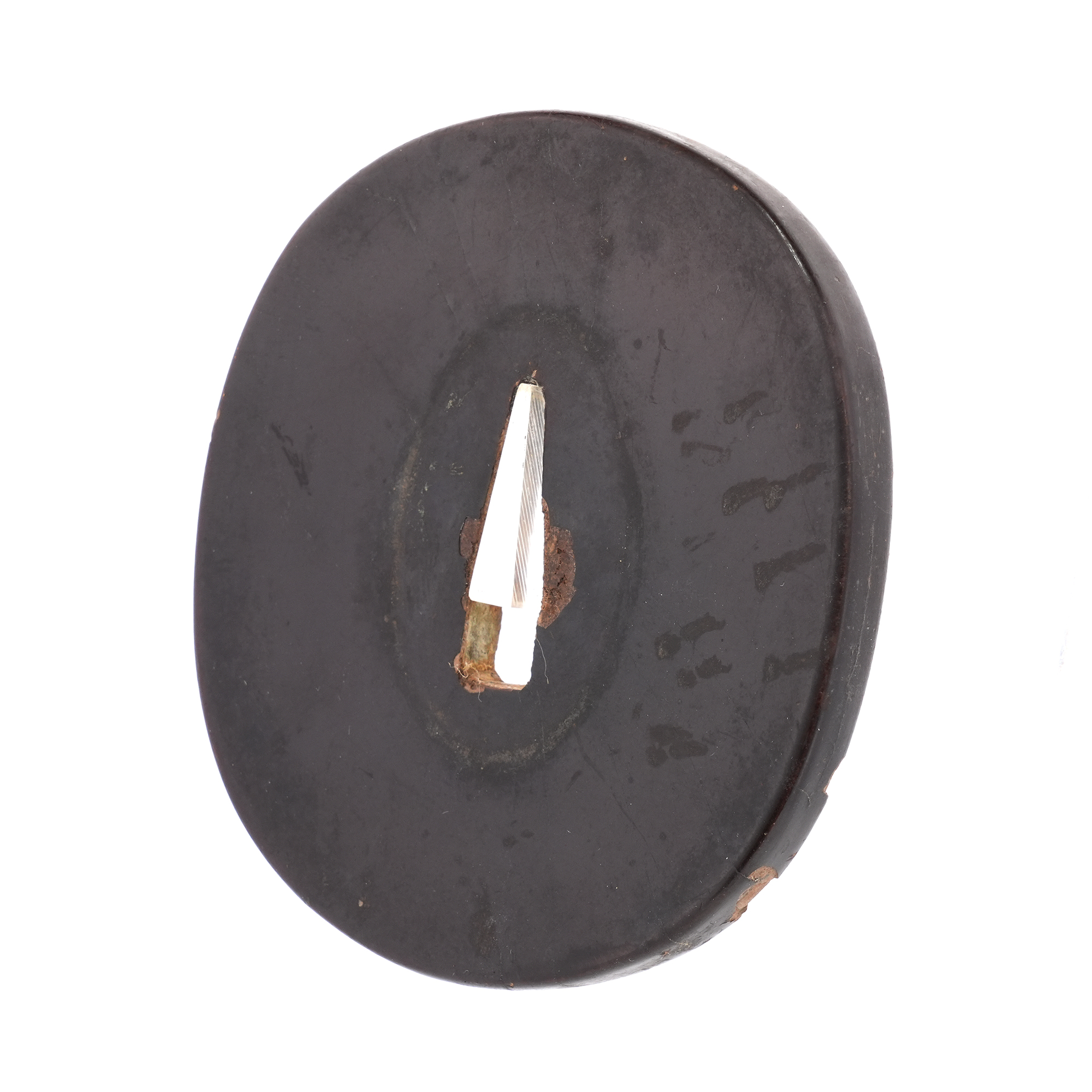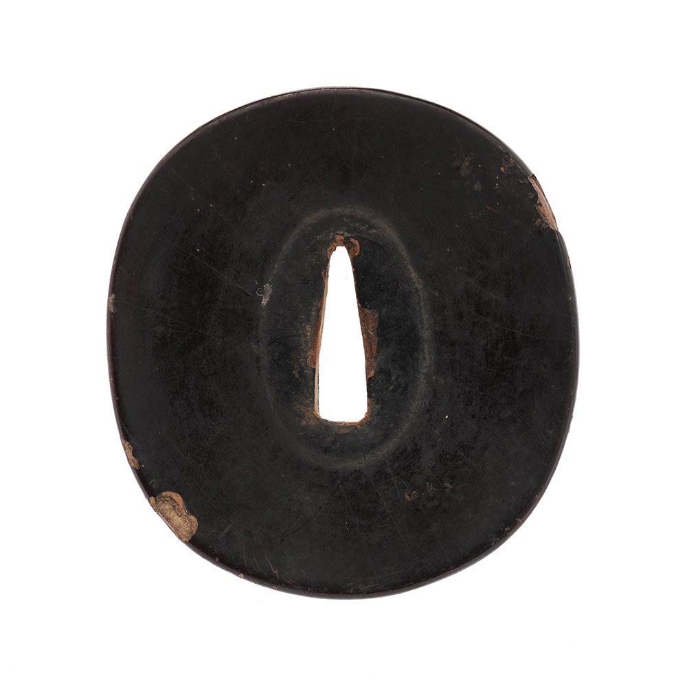 本作は、厚手の革を用いて制作された稀少な革鐔です。黒漆で硬めた革鐔は、耐久性にも優れ、しっかりと手を護る役目も果たすばかりか、軽量で取り回しやすく、長時間の戦闘にも適しています。