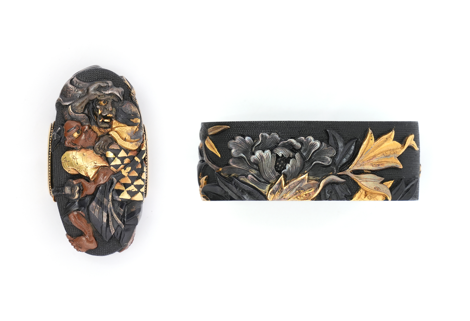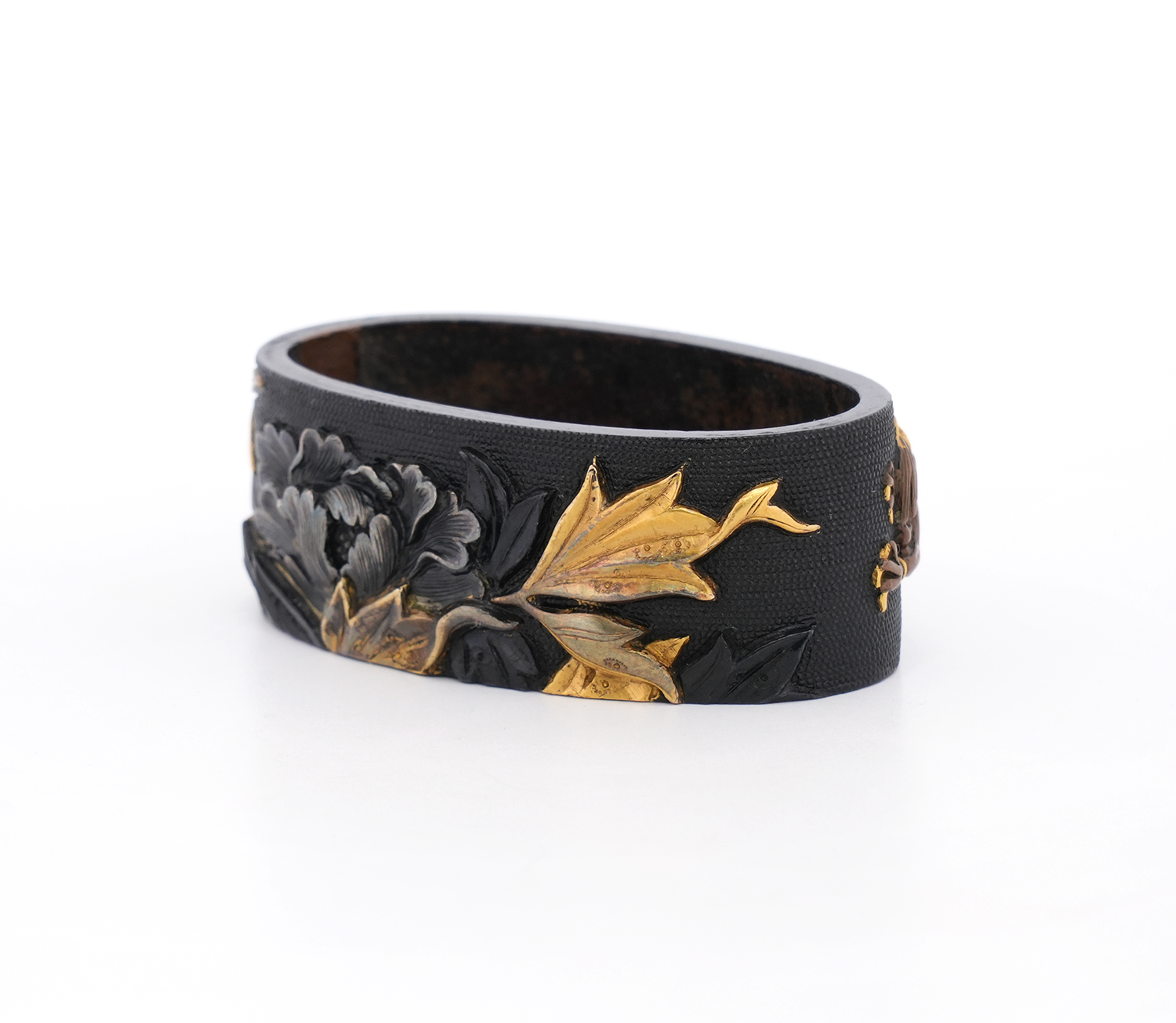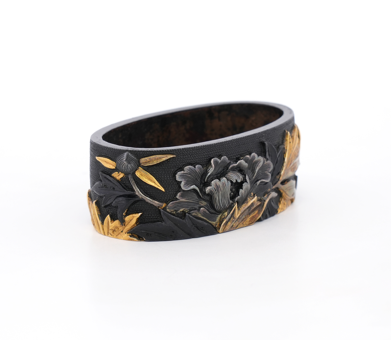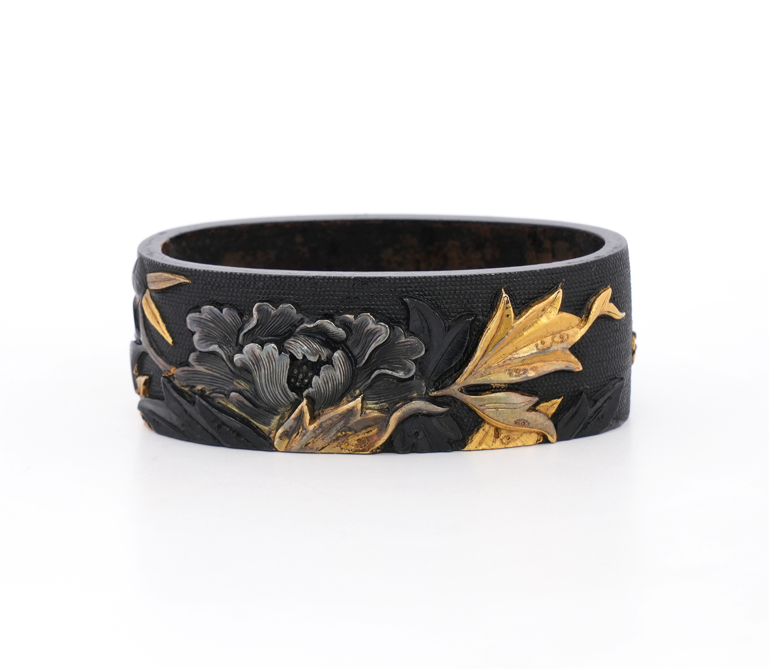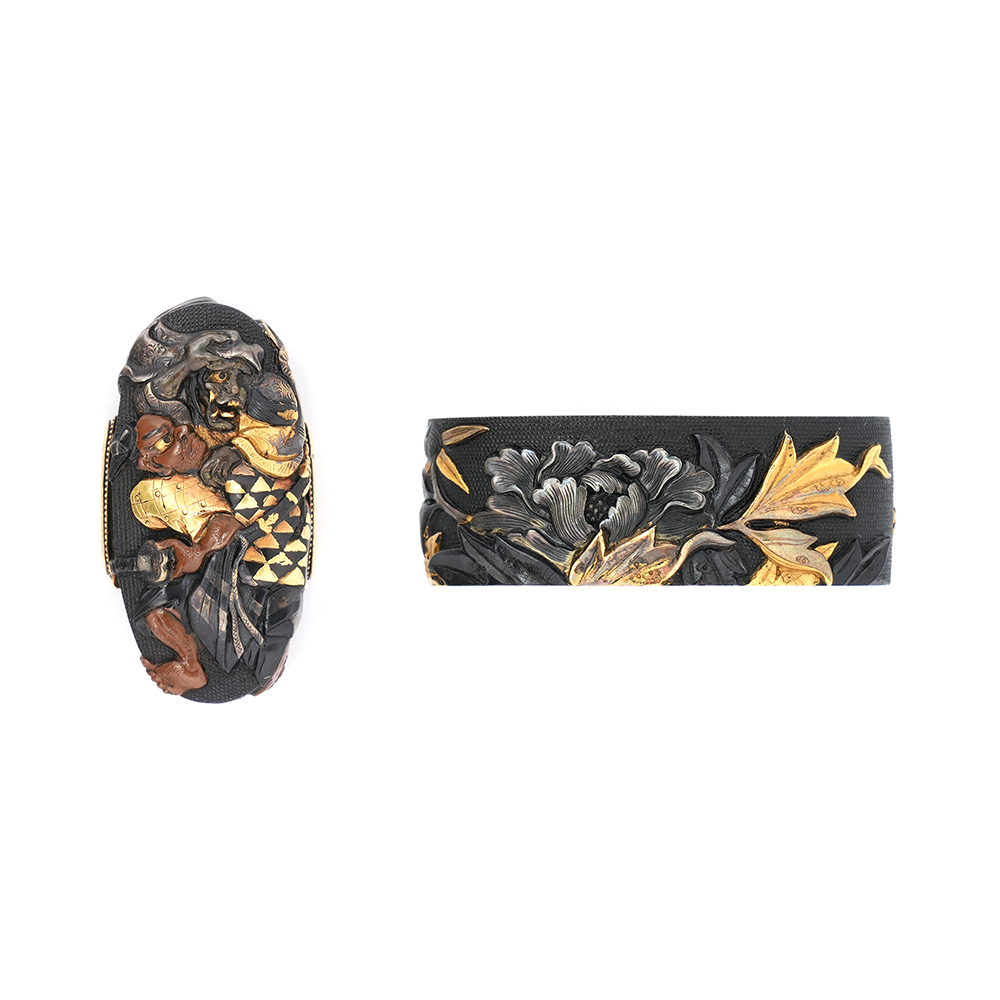 宗與は元禄十三年、江戸にて横谷宗寿の次男として生まれ、男児のなかった宗珉の養子となり、享保十七年に四代目を継ぎました。明和三年、六十七歳にて没。作域は四分一磨地に片切彫の作が多く、赤銅魚子地に高彫象嵌色絵の作も僅かに残されており、宗珉の後継者としての力感と品格を備えた、見事な出来栄えを示しています。