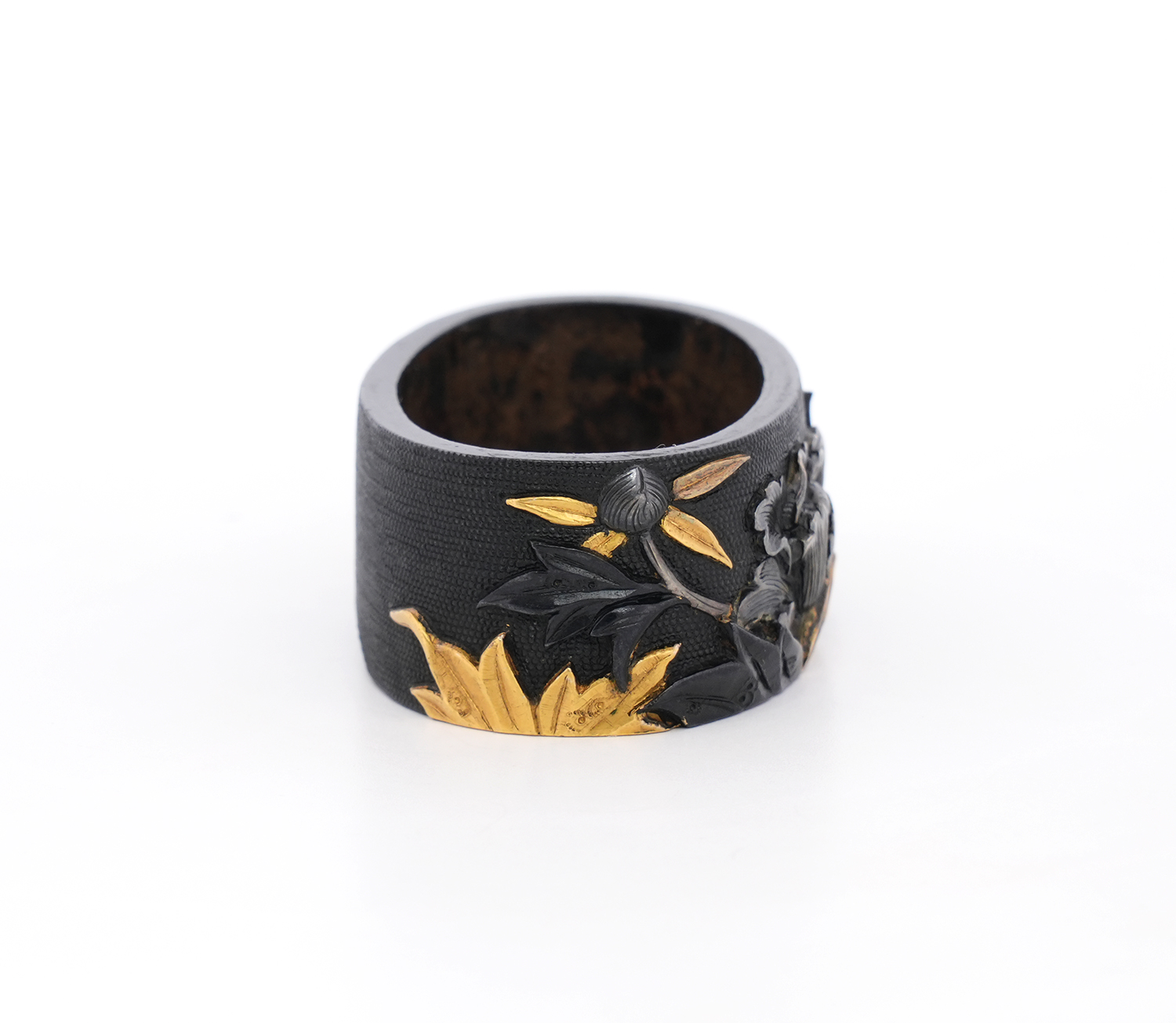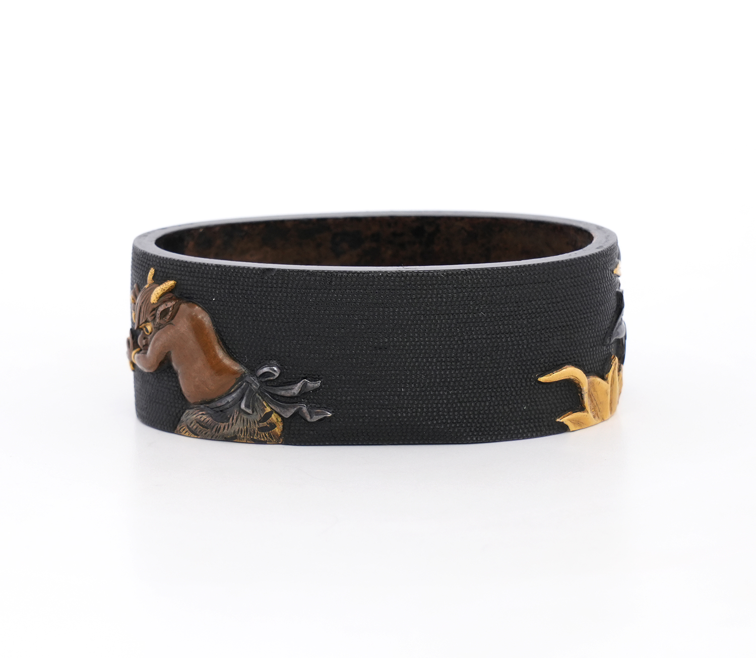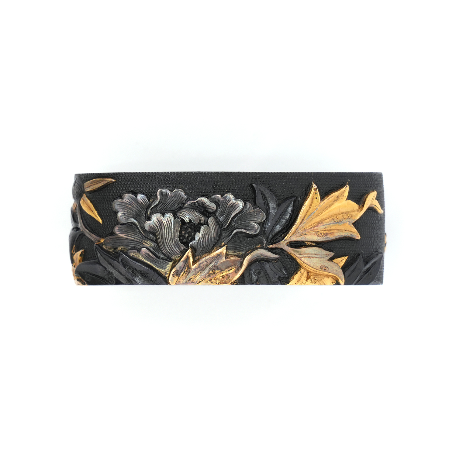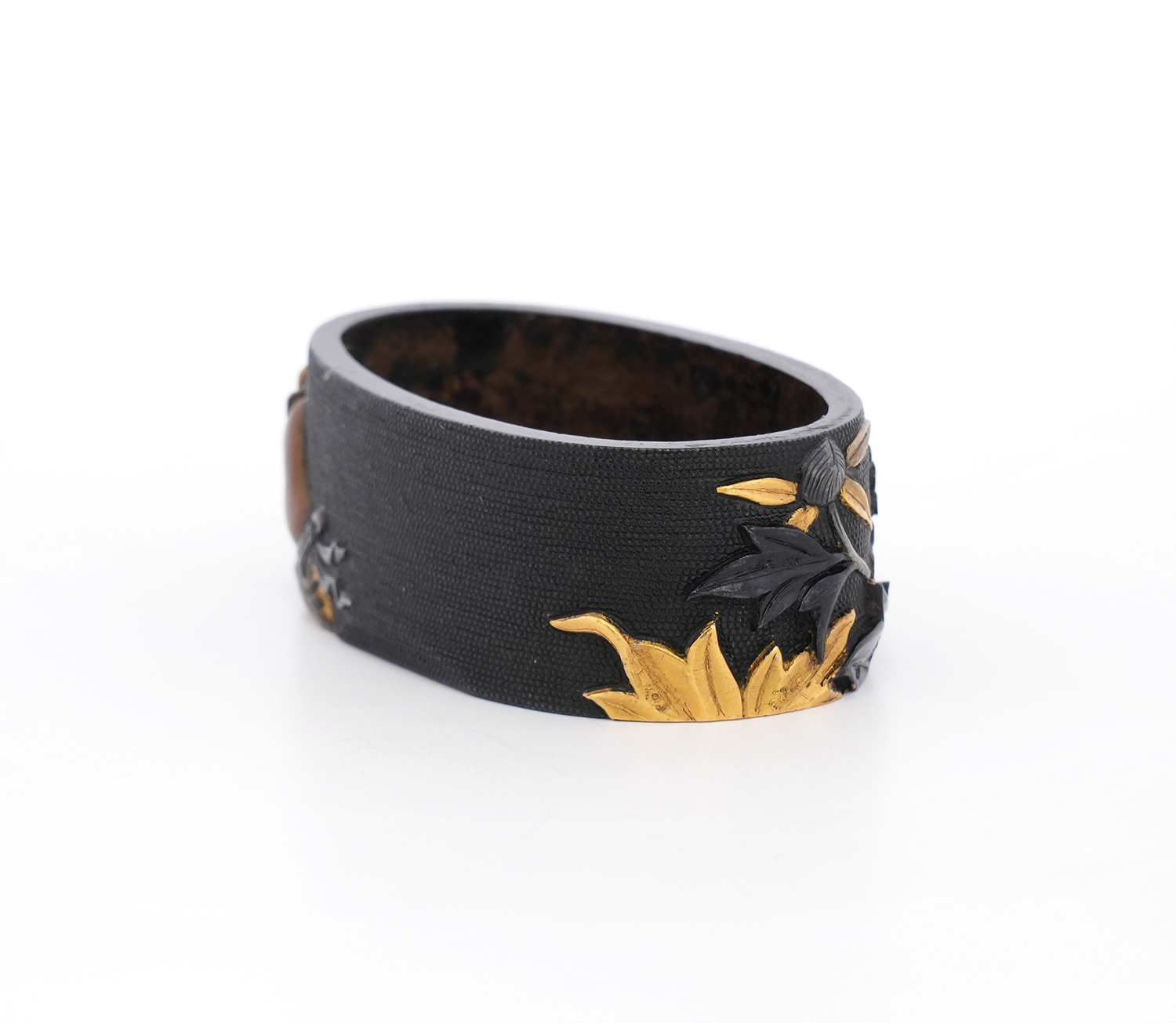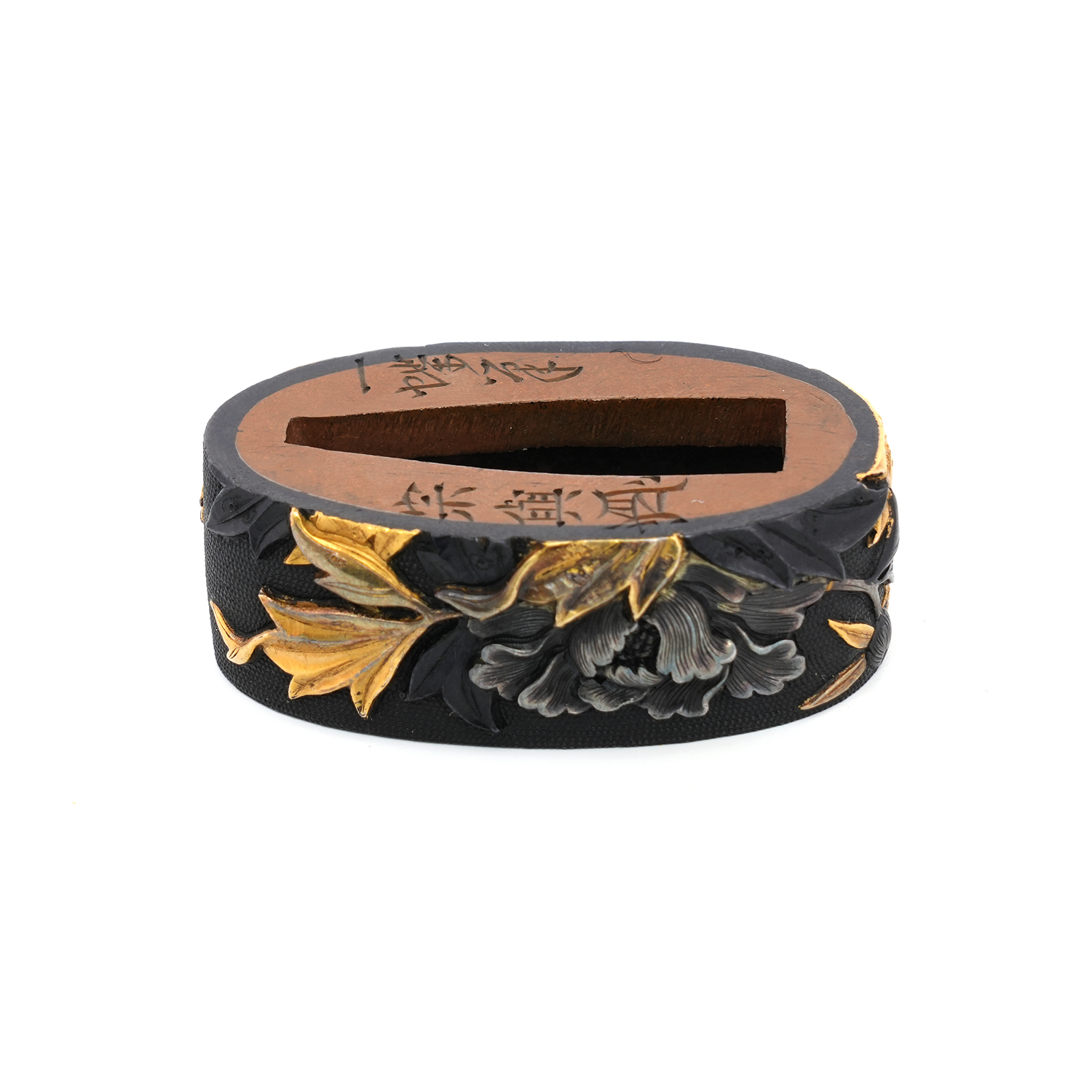宗與は元禄十三年、江戸にて横谷宗寿の次男として生まれ、男児のなかった宗珉の養子となり、享保十七年に四代目を継ぎました。明和三年、六十七歳にて没。作域は四分一磨地に片切彫の作が多く、赤銅魚子地に高彫象嵌色絵の作も僅かに残されており、宗珉の後継者としての力感と品格を備えた、見事な出来栄えを示しています。