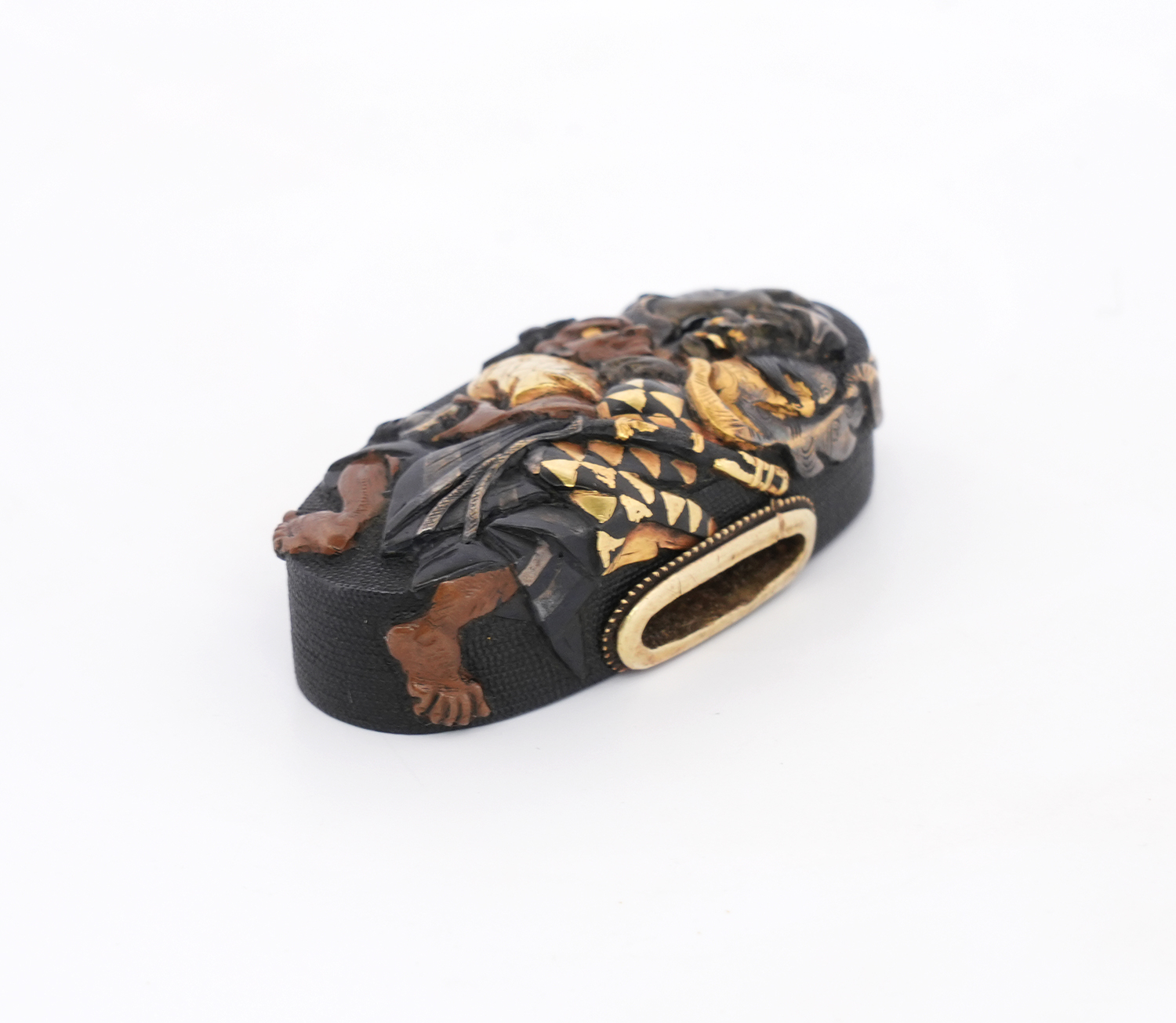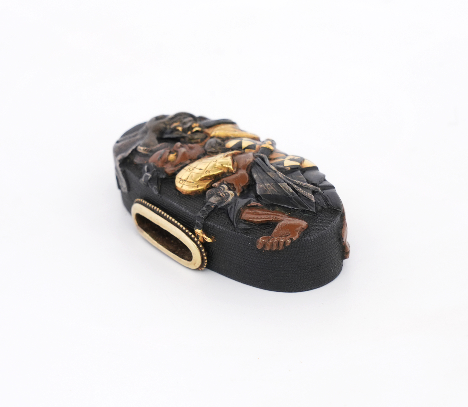 この縁頭は、太平記二十三巻の名場面「大森彦七図」を題材とした作品です。南北朝時代の武将・大森盛長(通称彦七)は、湊川の戦いで楠木正成軍を破った伊予の勇将。