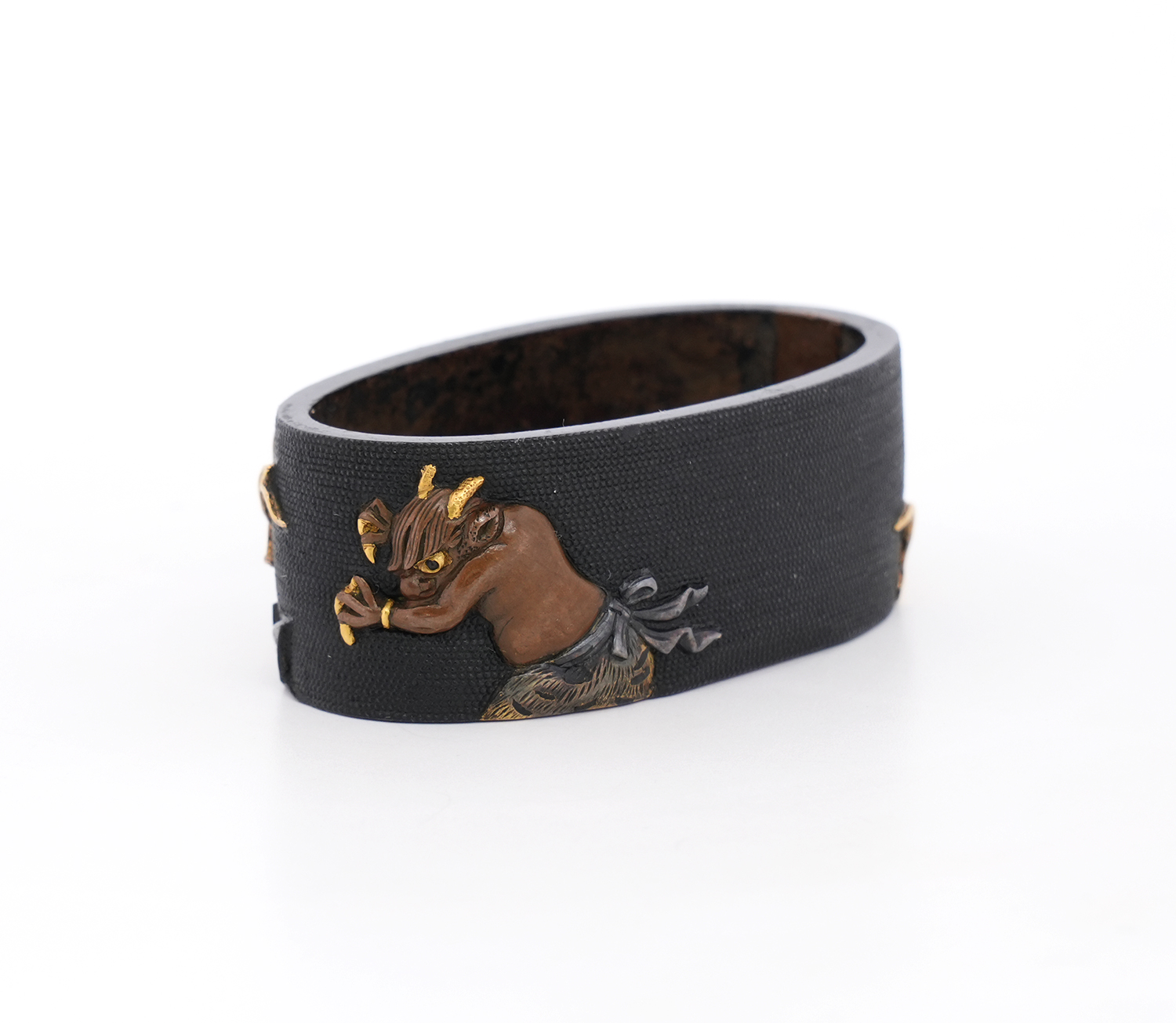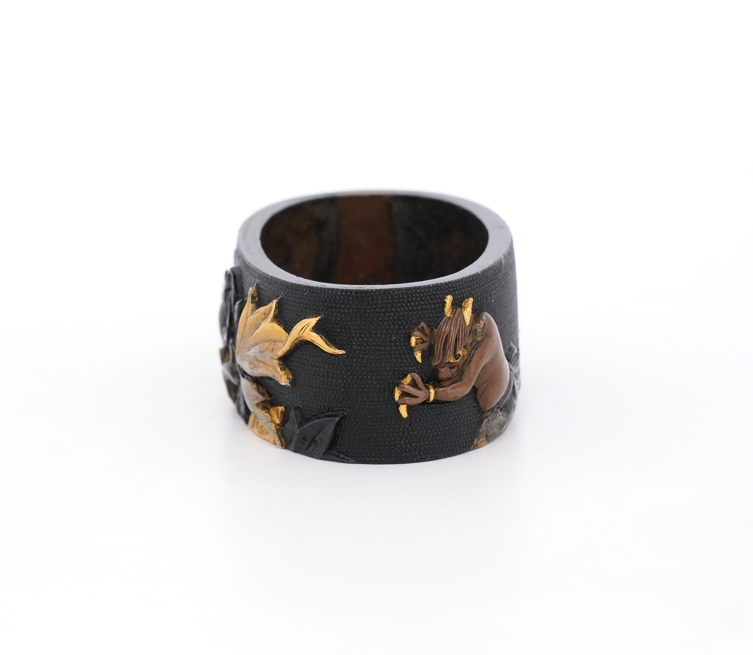 浮世絵や歌舞伎十八番にも描かれる名場面ですが、宗與は独自の図案として、河の流れを廃し、鬼女を睨み付ける彦七を正面から側面に巡らせた高彫で表現しており、迫力と存在感に満ちた佳作。高い技量を余すところなく示す、歴史・物語・技術が一体となった至高の一作です。