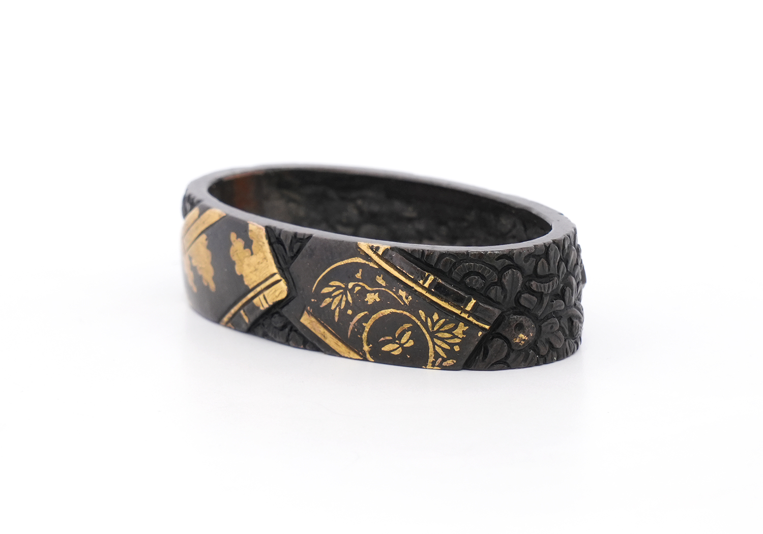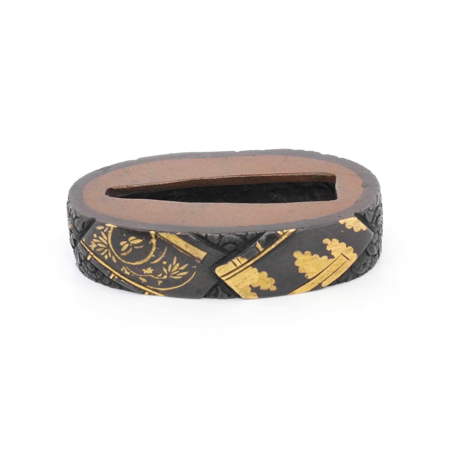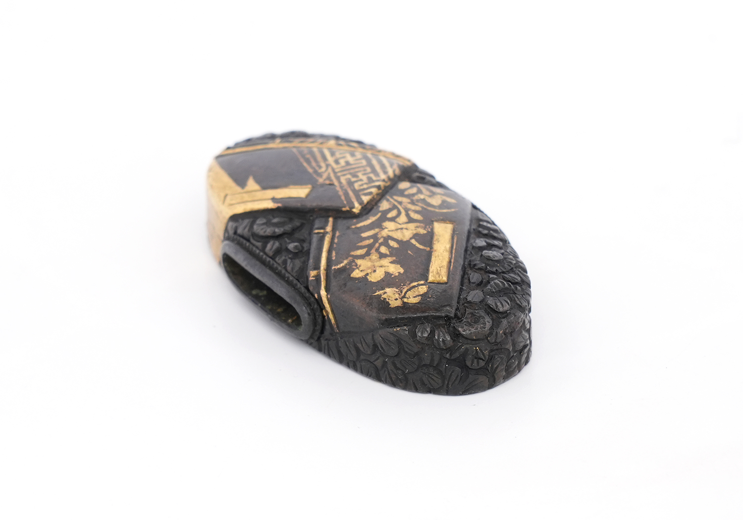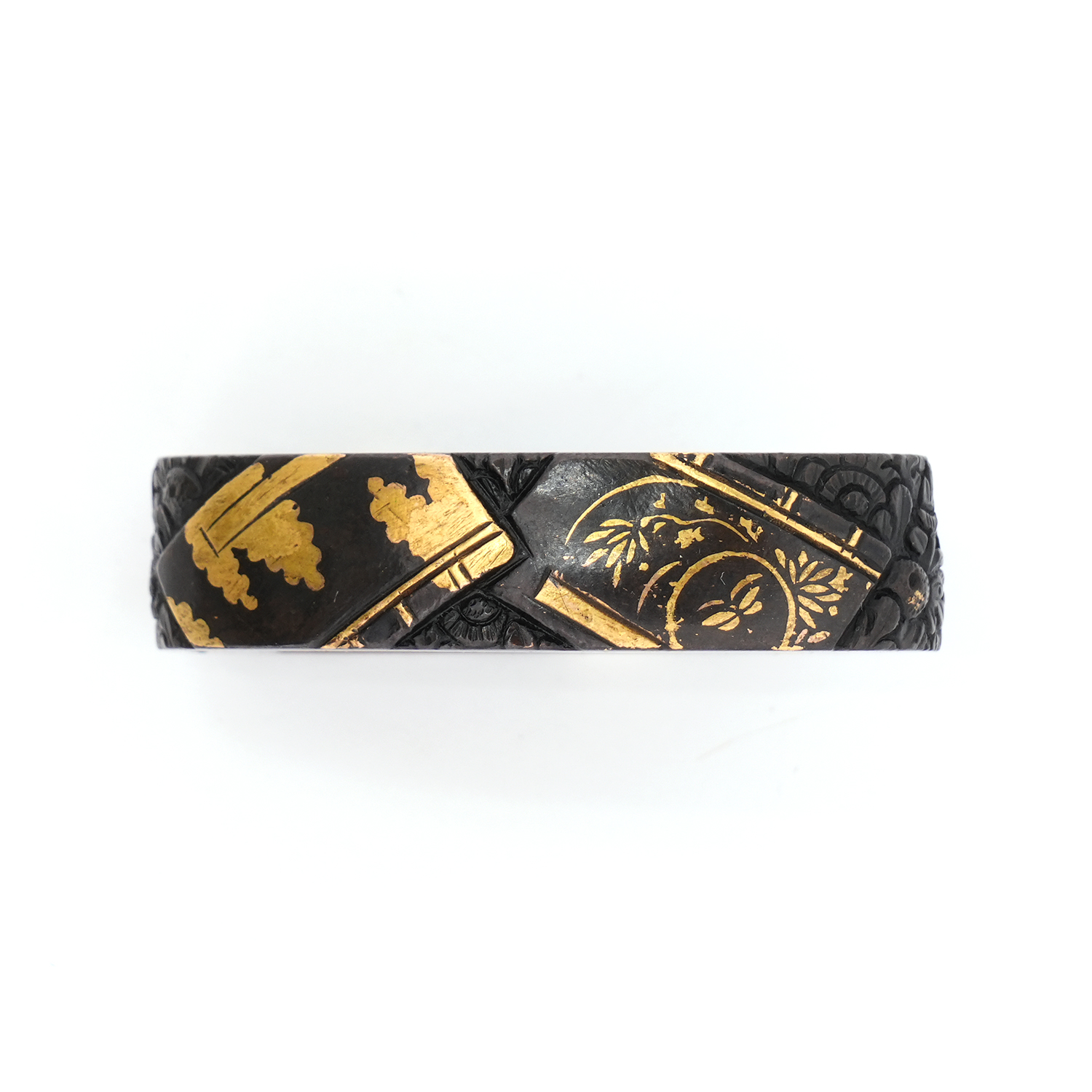 目貫には、まるで物語が今にも始まりそうな開かれた本が、卓越した彫金技術によって立体的に表現されています。その緻密な造形と温かみのある質感は、見る者の心を惹きつけ、思わず微笑みを誘うよう。
