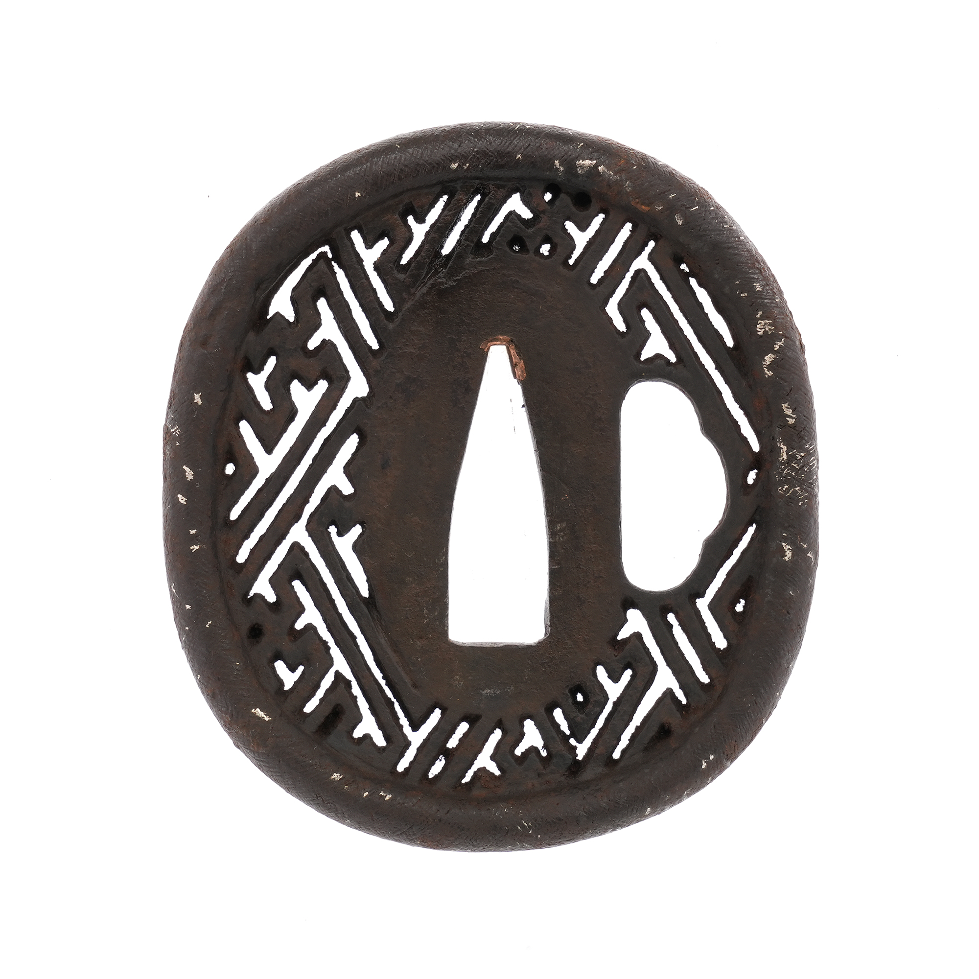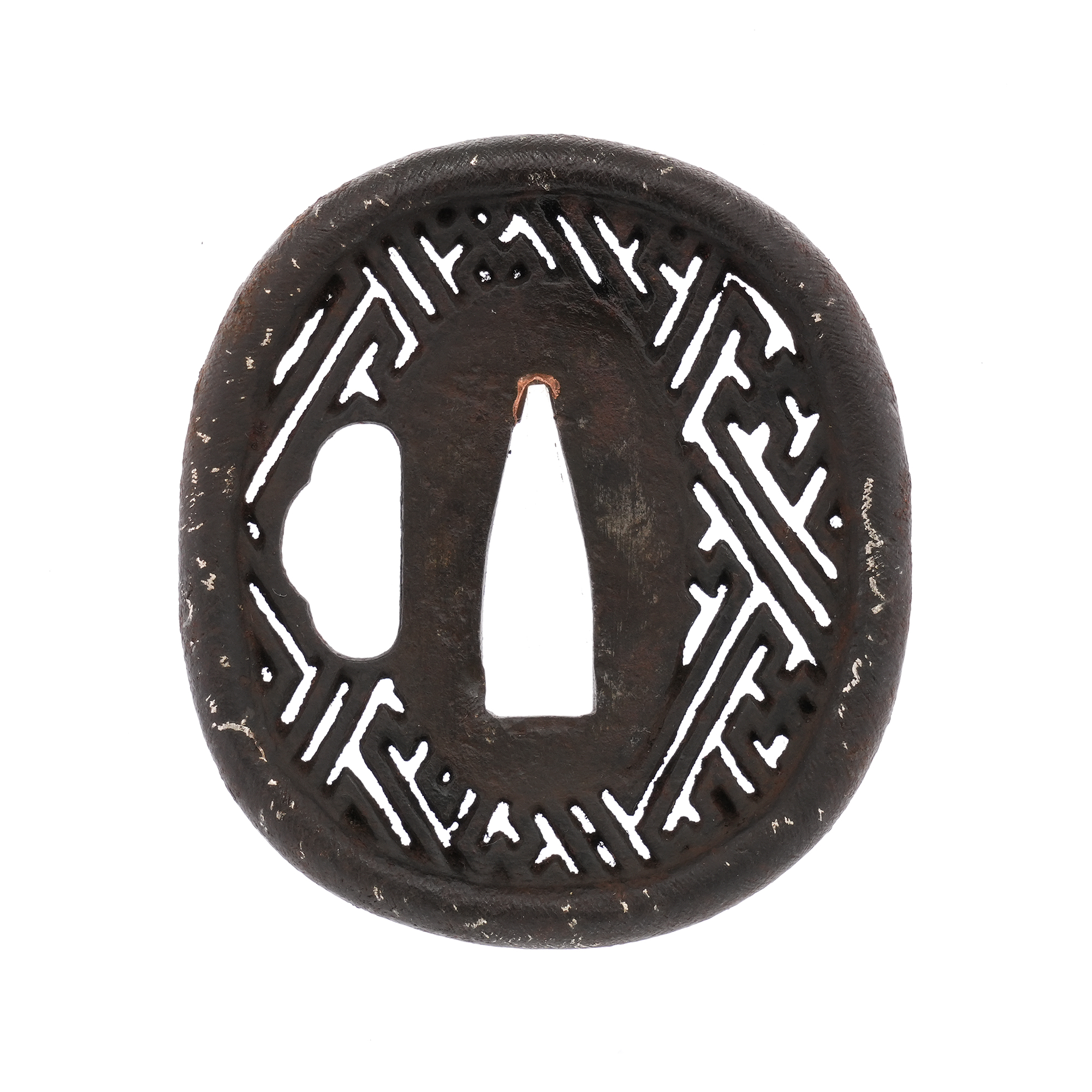 鉄地を縦丸形に整え、沙綾形を丁寧に透かし彫りした優品です。耳は厚みを持って丸く打ち出され、銀象嵌が施されています。経年により現在は象嵌の多くが剥離していますが、制作当時は耳全体が銀色に輝き、眩い光を放っていたことでしょう。技巧の妙と風格が融合した、鑑賞に値する一作です。