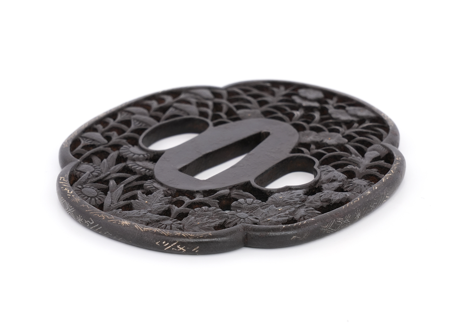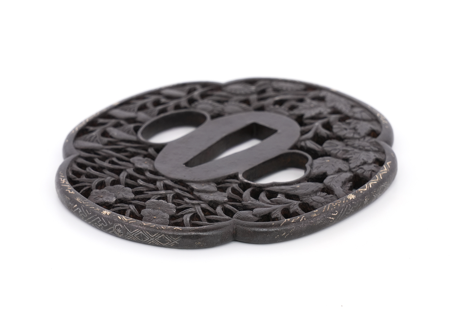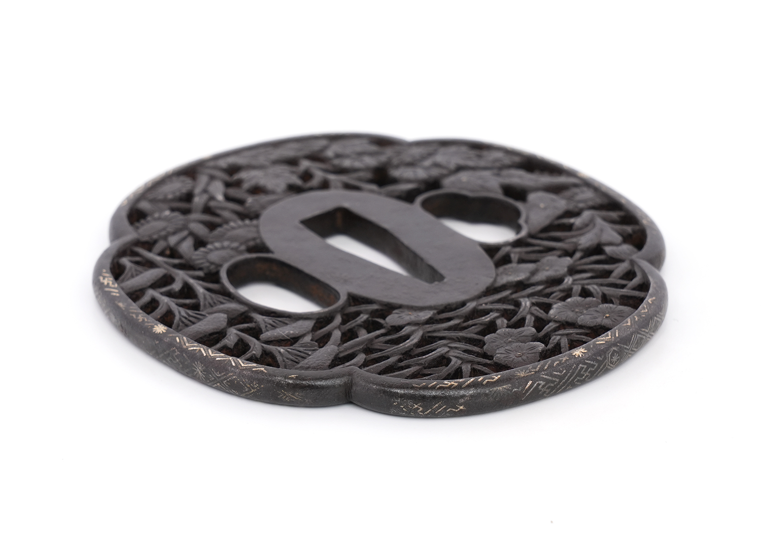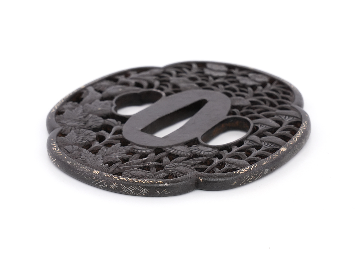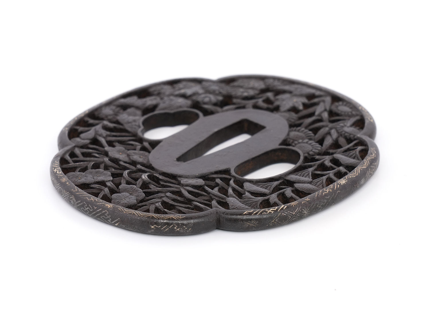 鉄地を木瓜形に整え、秋草を丁寧に透かし彫りした優品です。耳には銀象嵌が施され、絡み合う草の表現が非常に趣深く、季節の風情と技巧の妙を同時に感じさせます。細部まで練り込まれた彫りと象嵌の調和が、鑑賞する者を魅了する一作です。