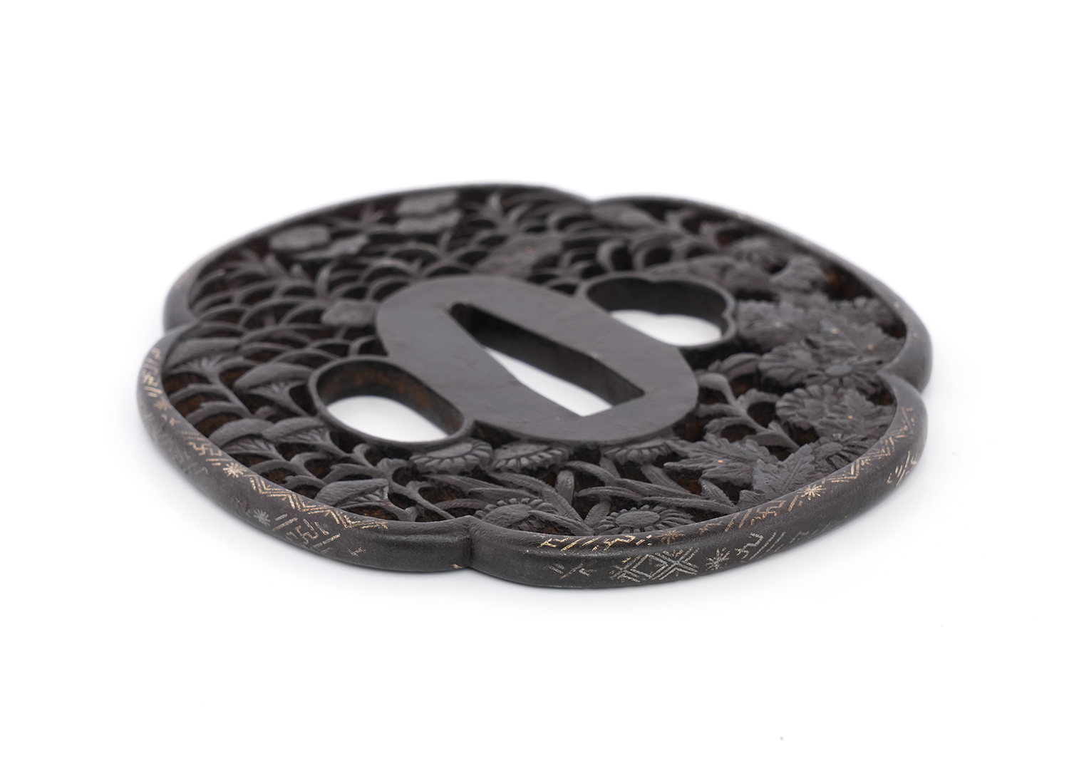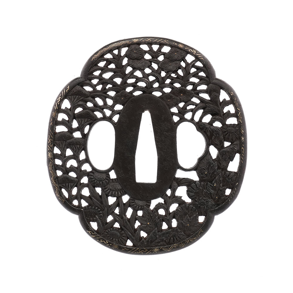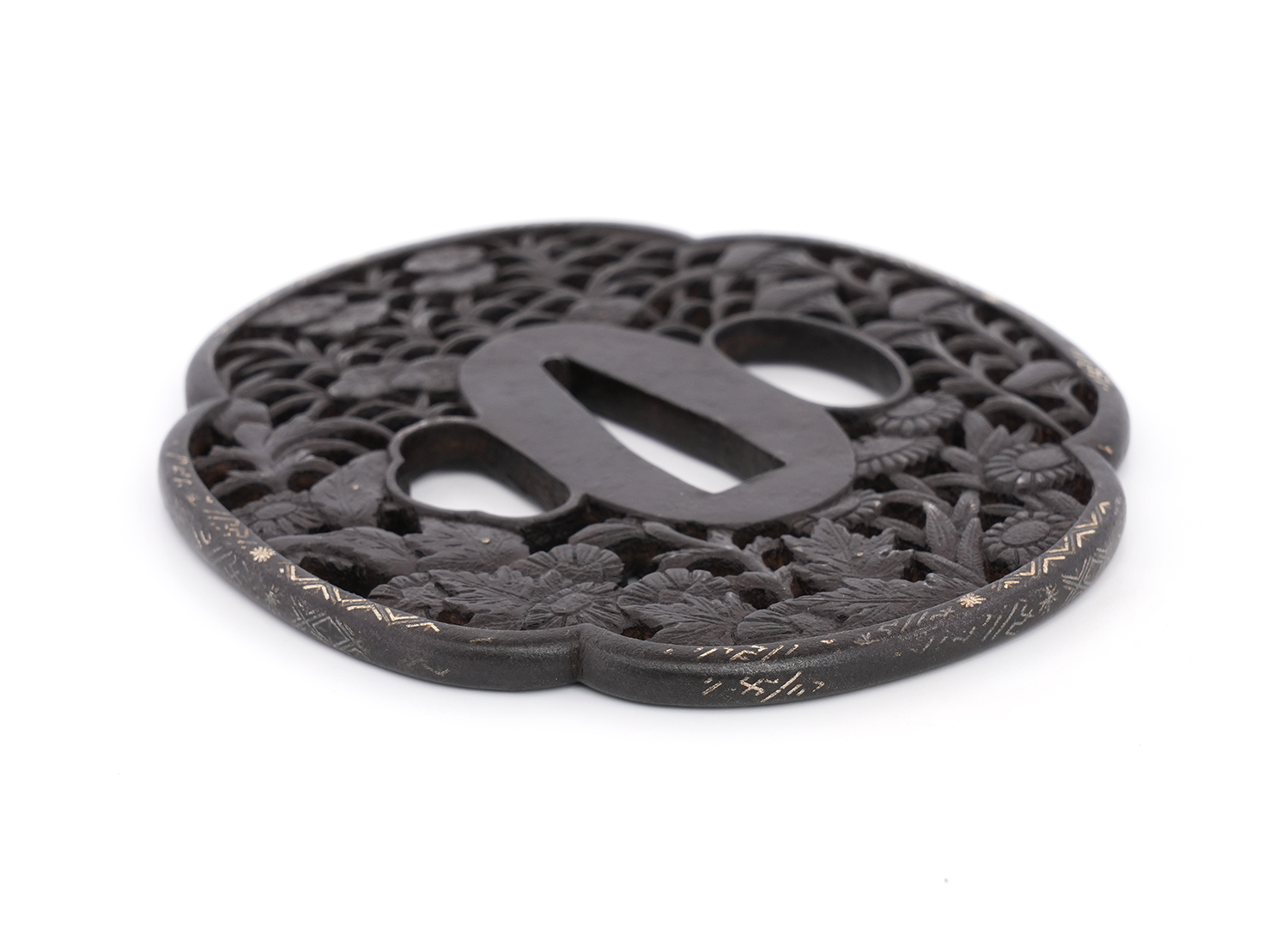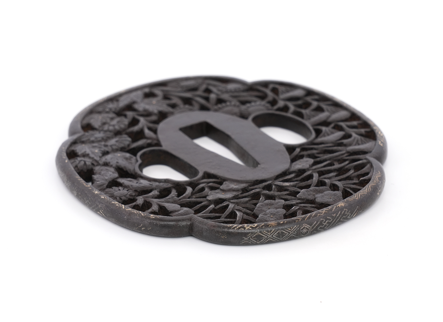 鉄地を木瓜形に整え、秋草を丁寧に透かし彫りした優品です。耳には銀象嵌が施され、絡み合う草の表現が非常に趣深く、季節の風情と技巧の妙を同時に感じさせます。細部まで練り込まれた彫りと象嵌の調和が、鑑賞する者を魅了する一作です。