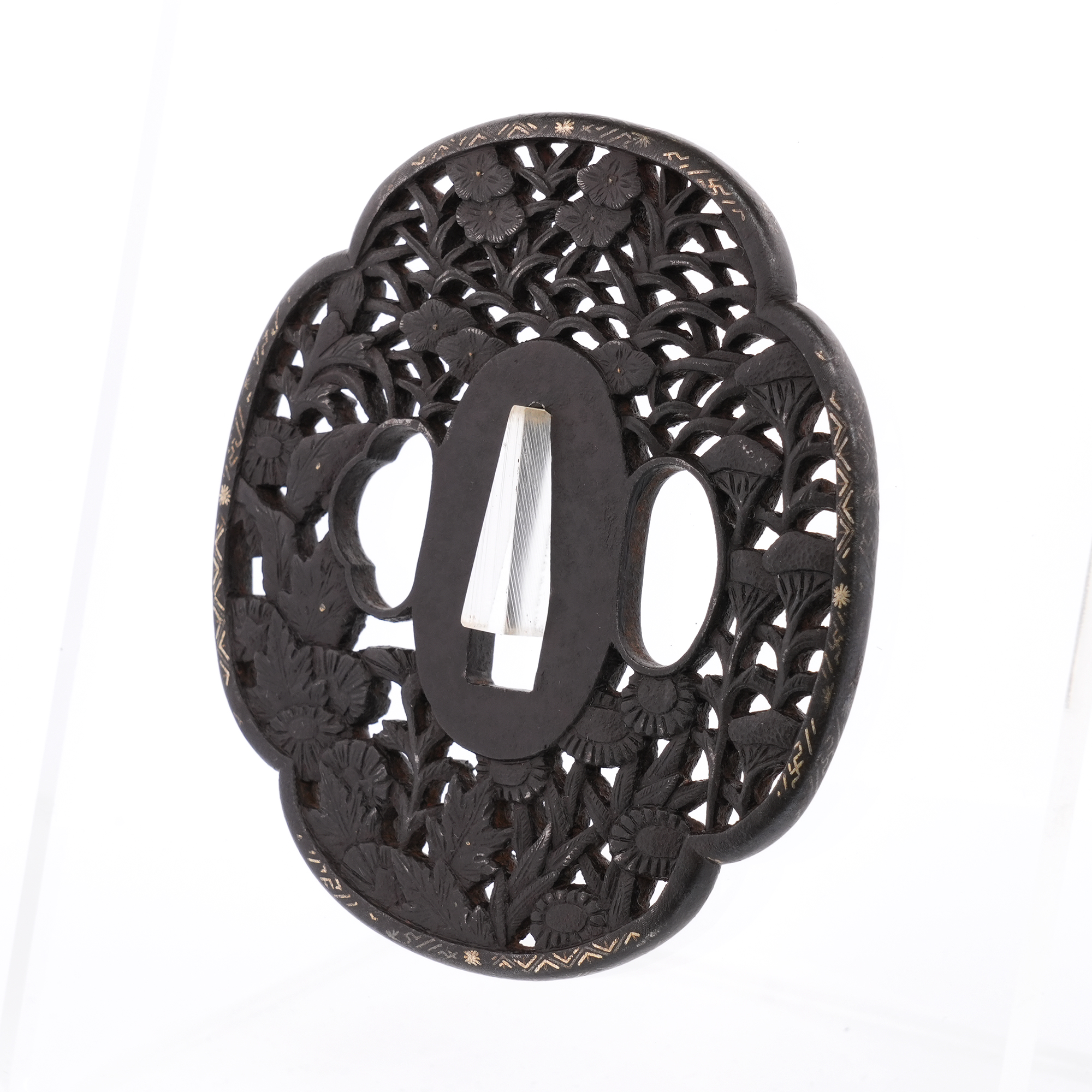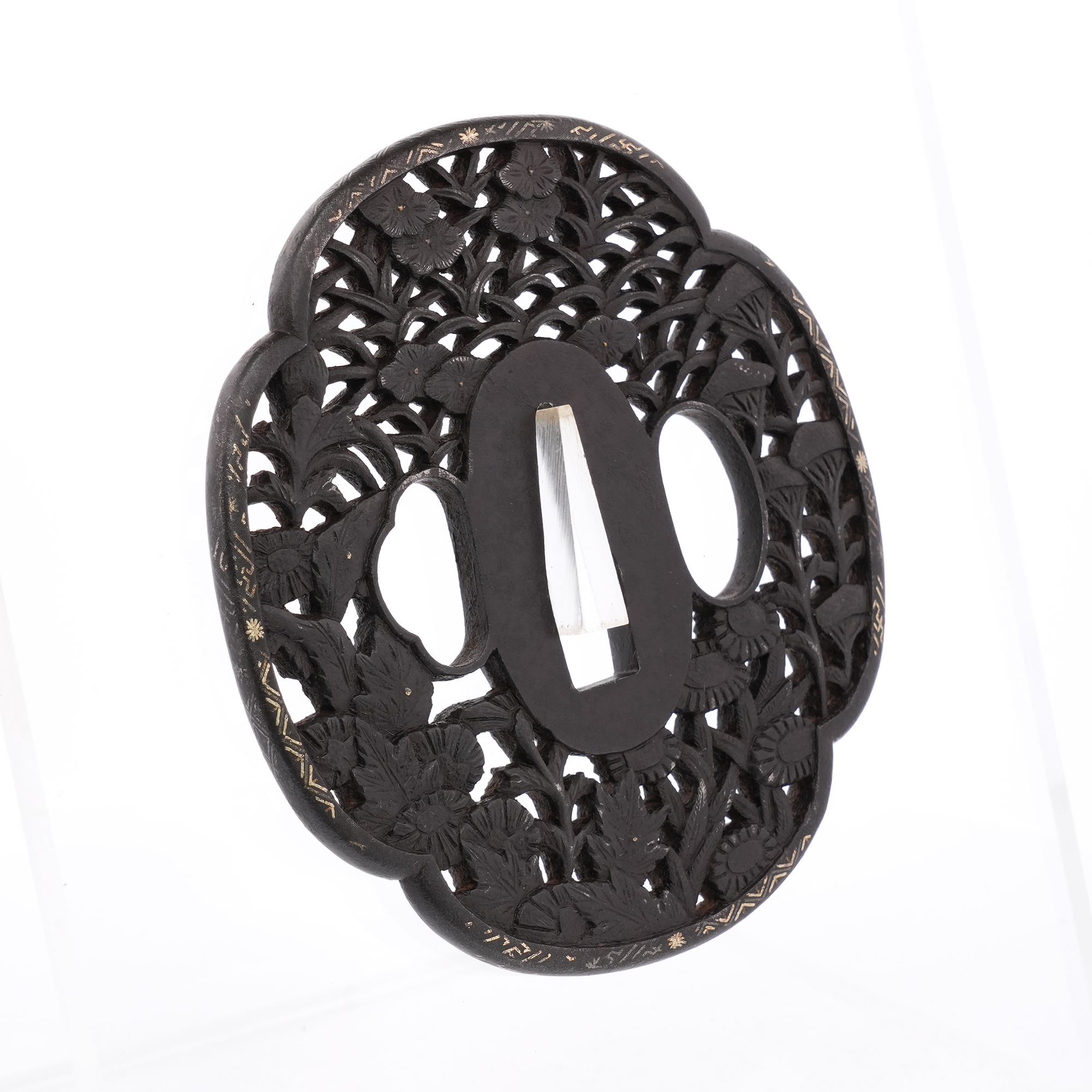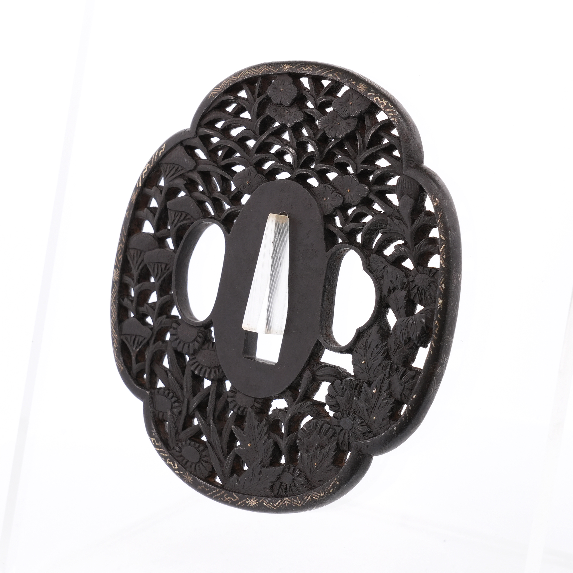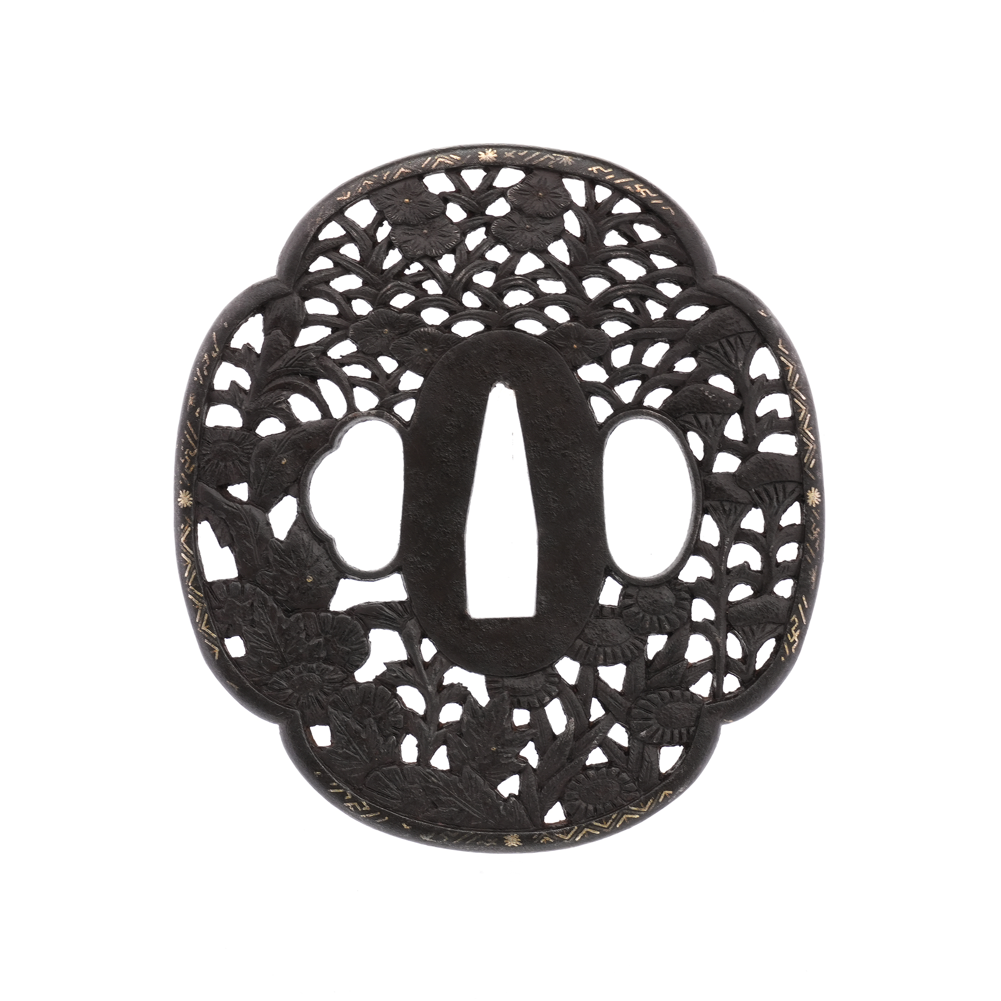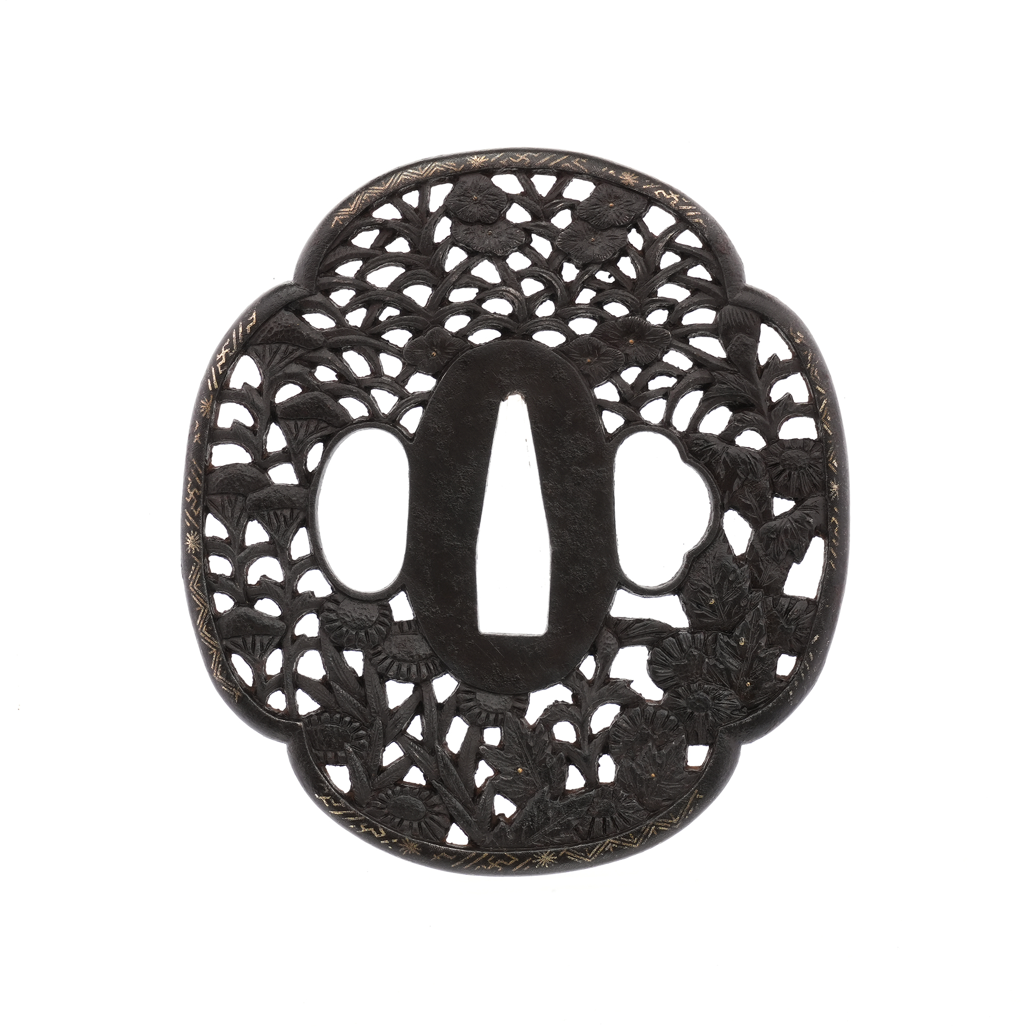 鉄地を木瓜形に整え、秋草を丁寧に透かし彫りした優品です。耳には銀象嵌が施され、絡み合う草の表現が非常に趣深く、季節の風情と技巧の妙を同時に感じさせます。細部まで練り込まれた彫りと象嵌の調和が、鑑賞する者を魅了する一作です。