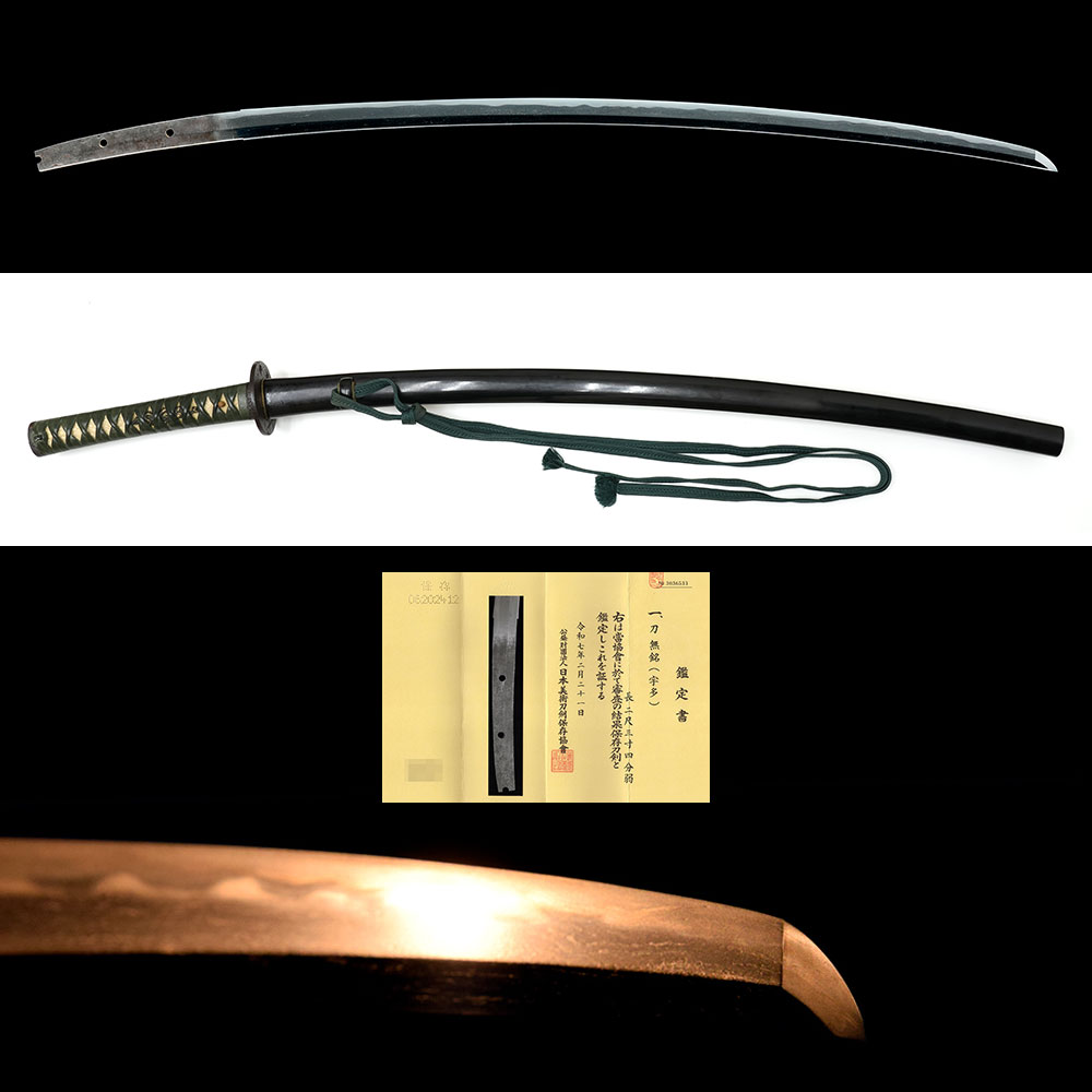 鑑定書上は室町期の宇多作と極められていますが、その出来口や品格からは南北朝末期の古宇多の名作として鑑たい見どころ多き逸品です。静謐の中に潜む迫力、時代を超えて響く匠の魂。古の美を今に映す一振が、あなたのコレクションに確かな価値を添えることでしょう。
