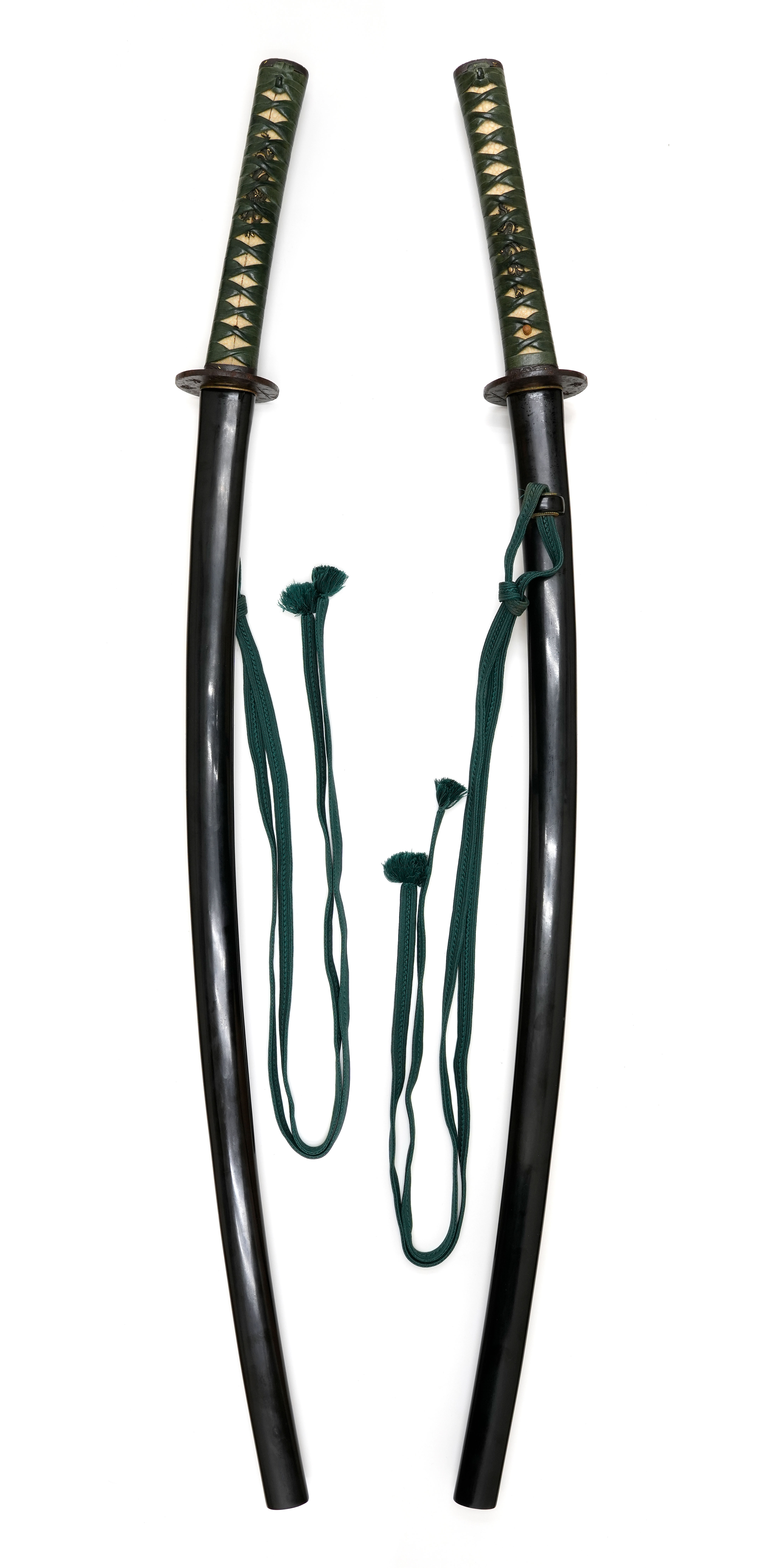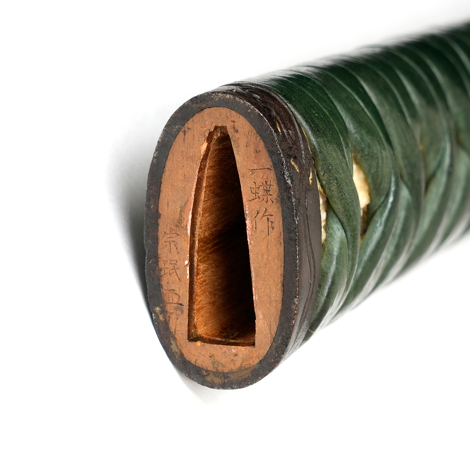 附属の拵は、実用と美を兼ね備えた見事な仕立てです。柄は革を片撮みで力強く巻き上げ、手にしっかりと馴染む握り心地を実現。堅牢かつ実戦的な印象を与えつつも、上品な落ち着きを感じさせます。鞘は鯉口付近をふっくらと膨らませ、他の部分を細身に仕上げることで、腰骨への負担を軽減する工夫が施されています。携行性と機能美を兼ね備えた、職人の気配りが光る造り込みです。
