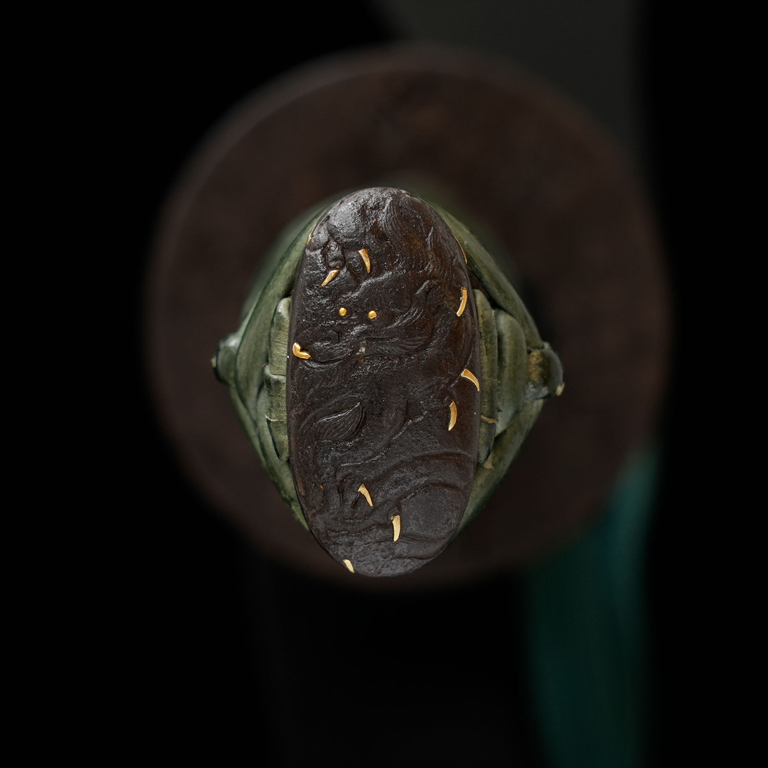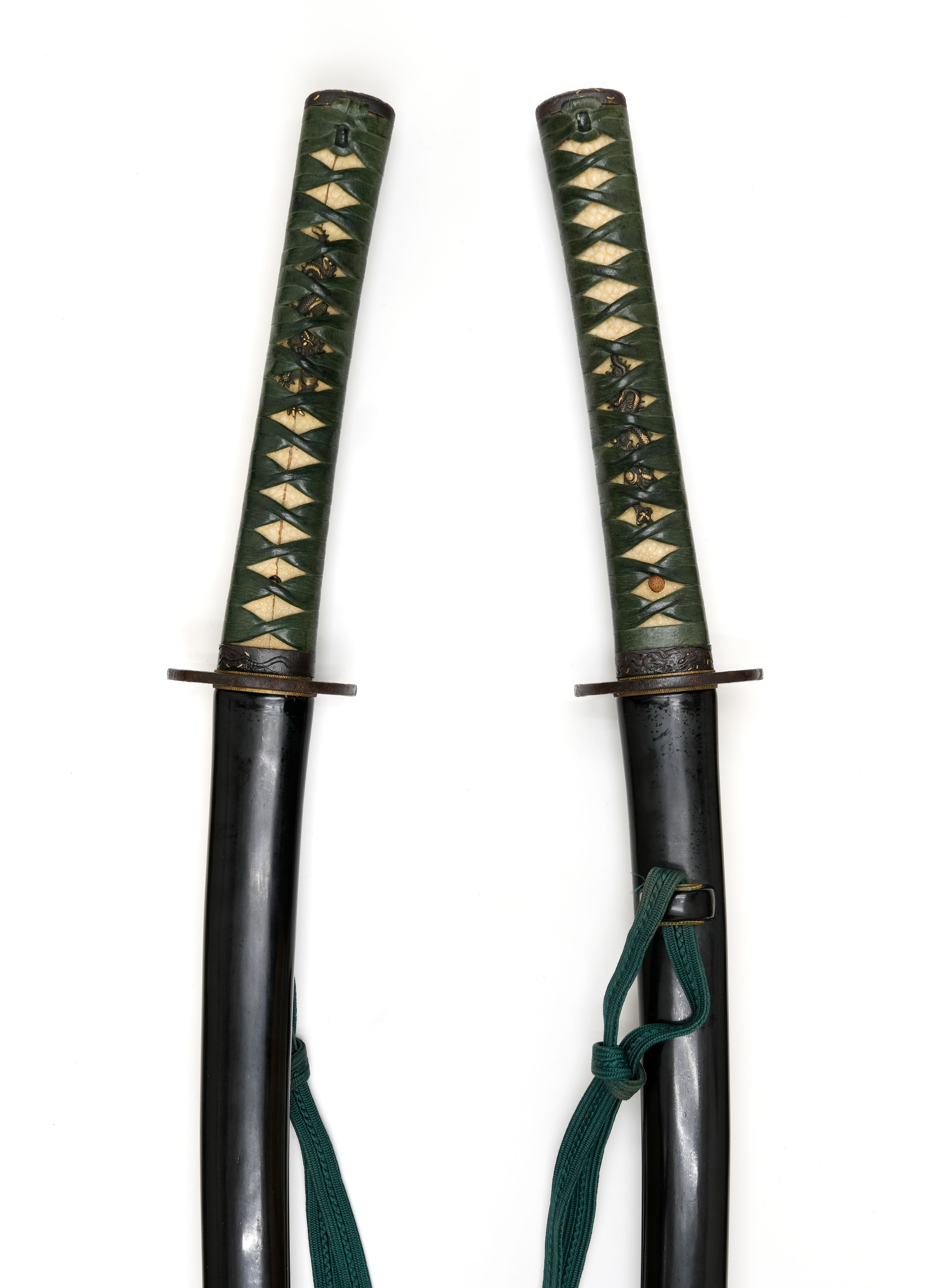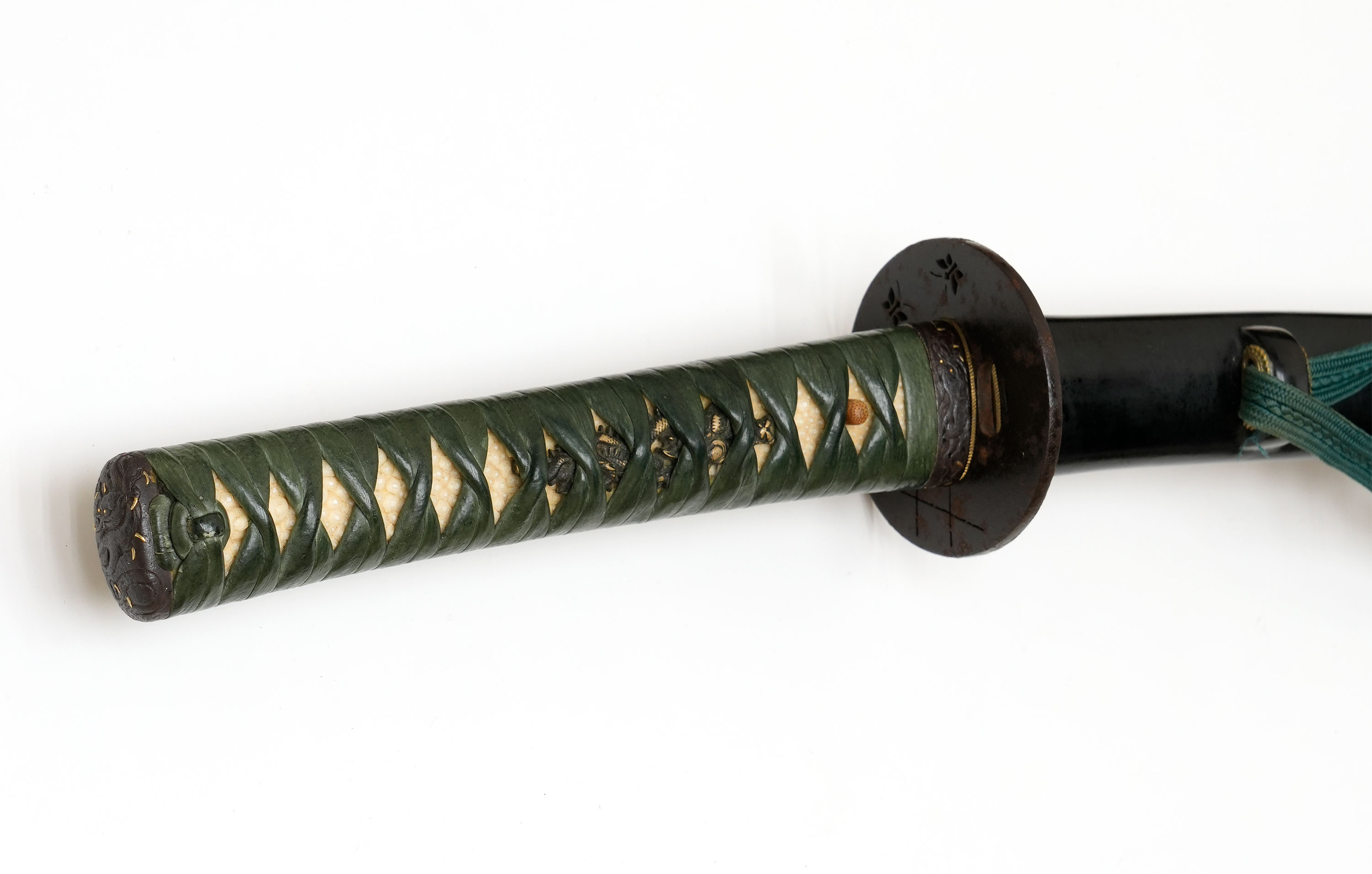 なお、鯉口は堅牢でしっかりとしておりますので、無理に納めず、わずかに鯉口を空けた状態での保管をおすすめいたします。柄には緩みやがたつきは見られず、鐔鳴りは僅か。全体に引き締まった印象を保つ良好な状態です。 武と美、用と雅。その両面を見事に調和させた拵が、刀身の風格を一層引き立てます。