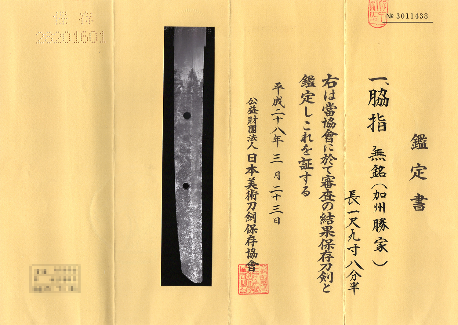 | 登録 | 素銅はばき、黒蝋塗鞘打刀拵 |