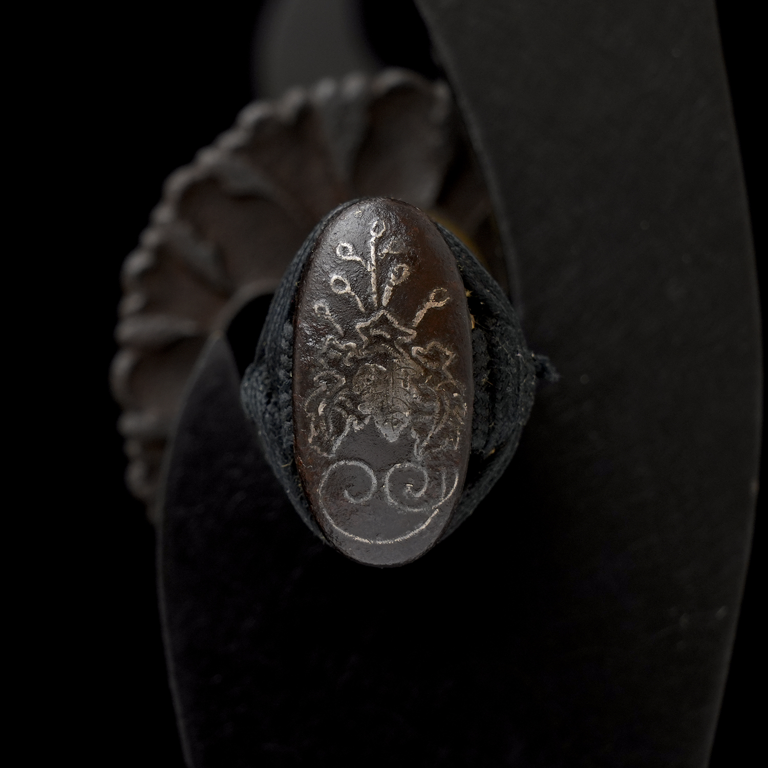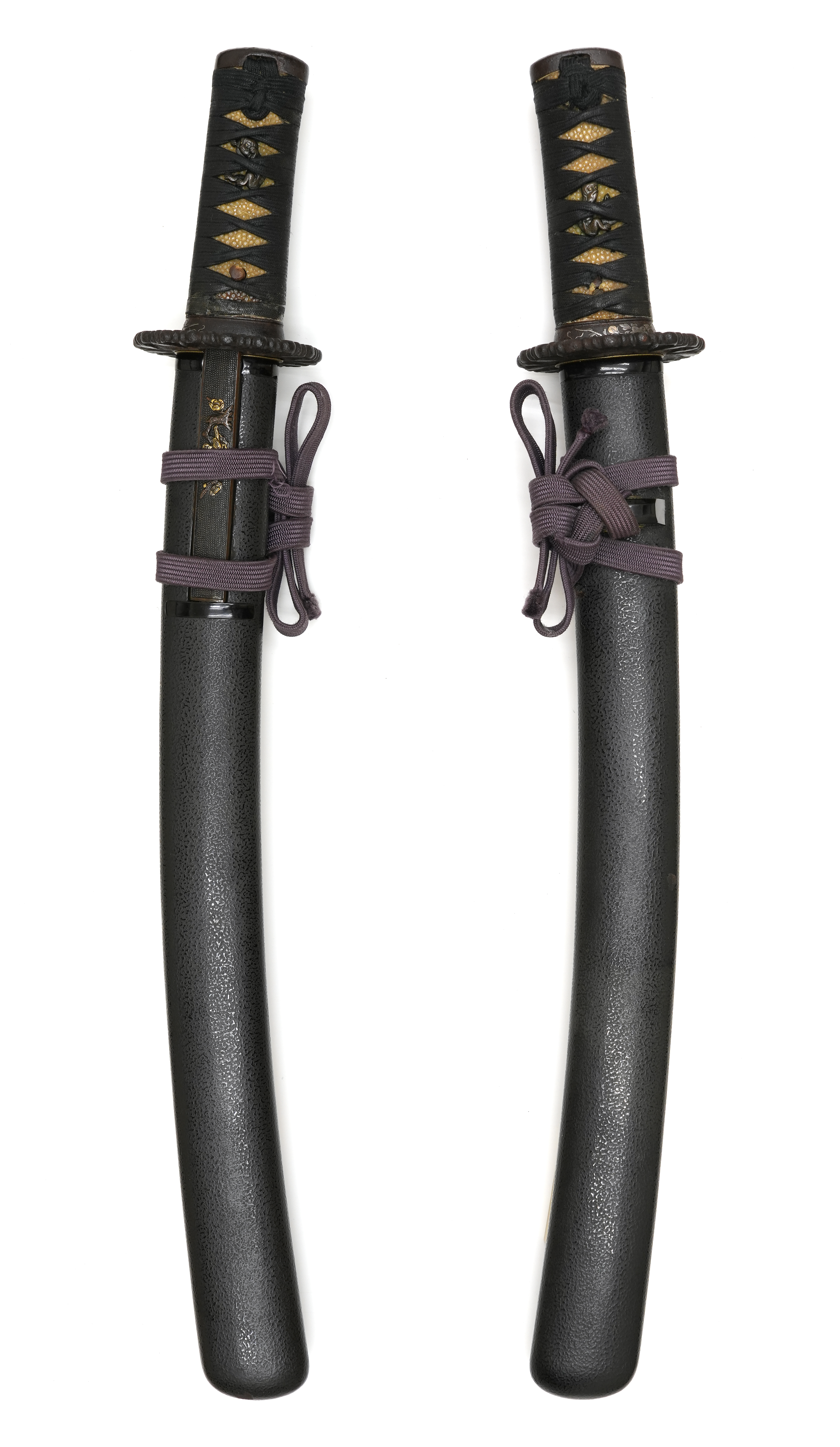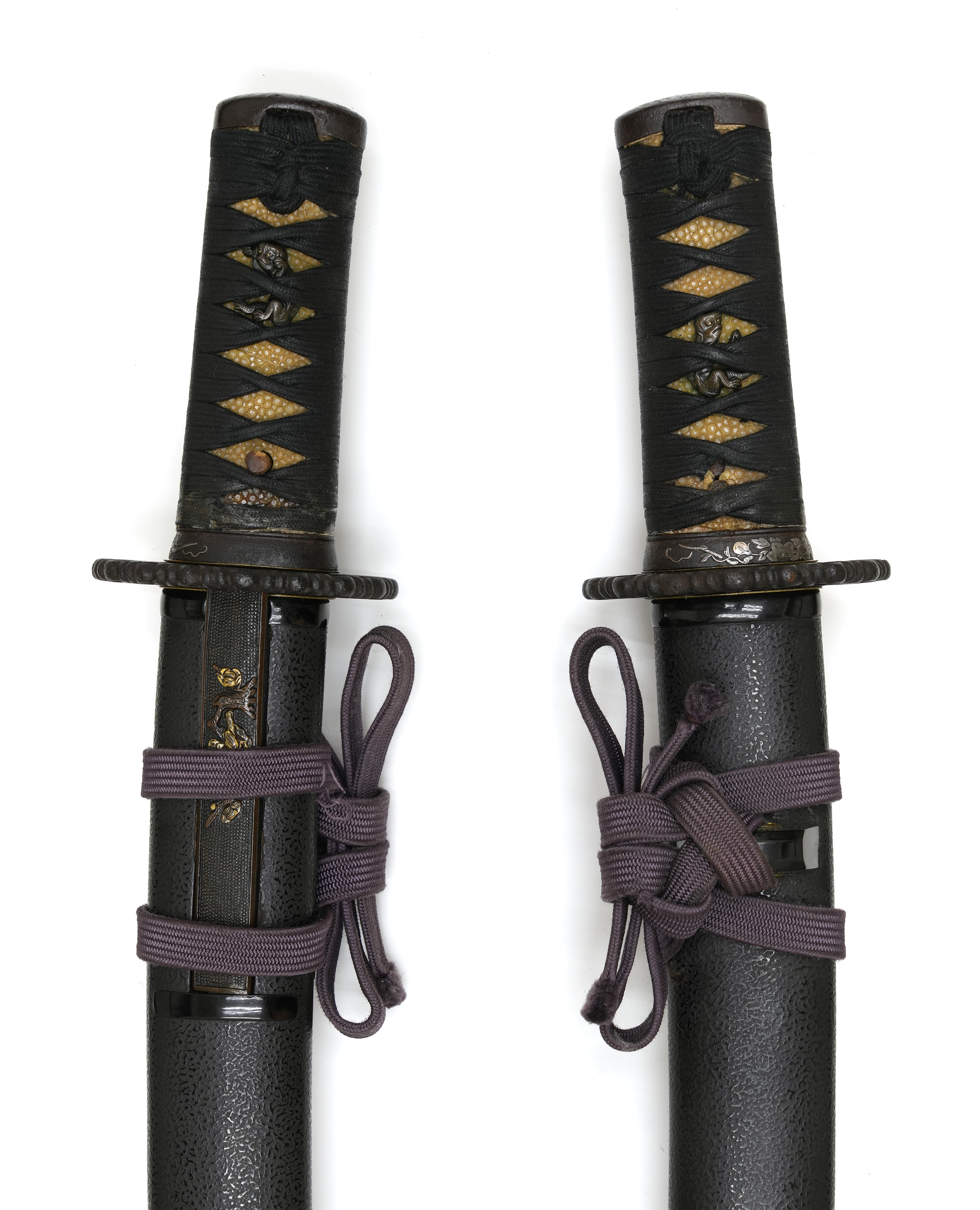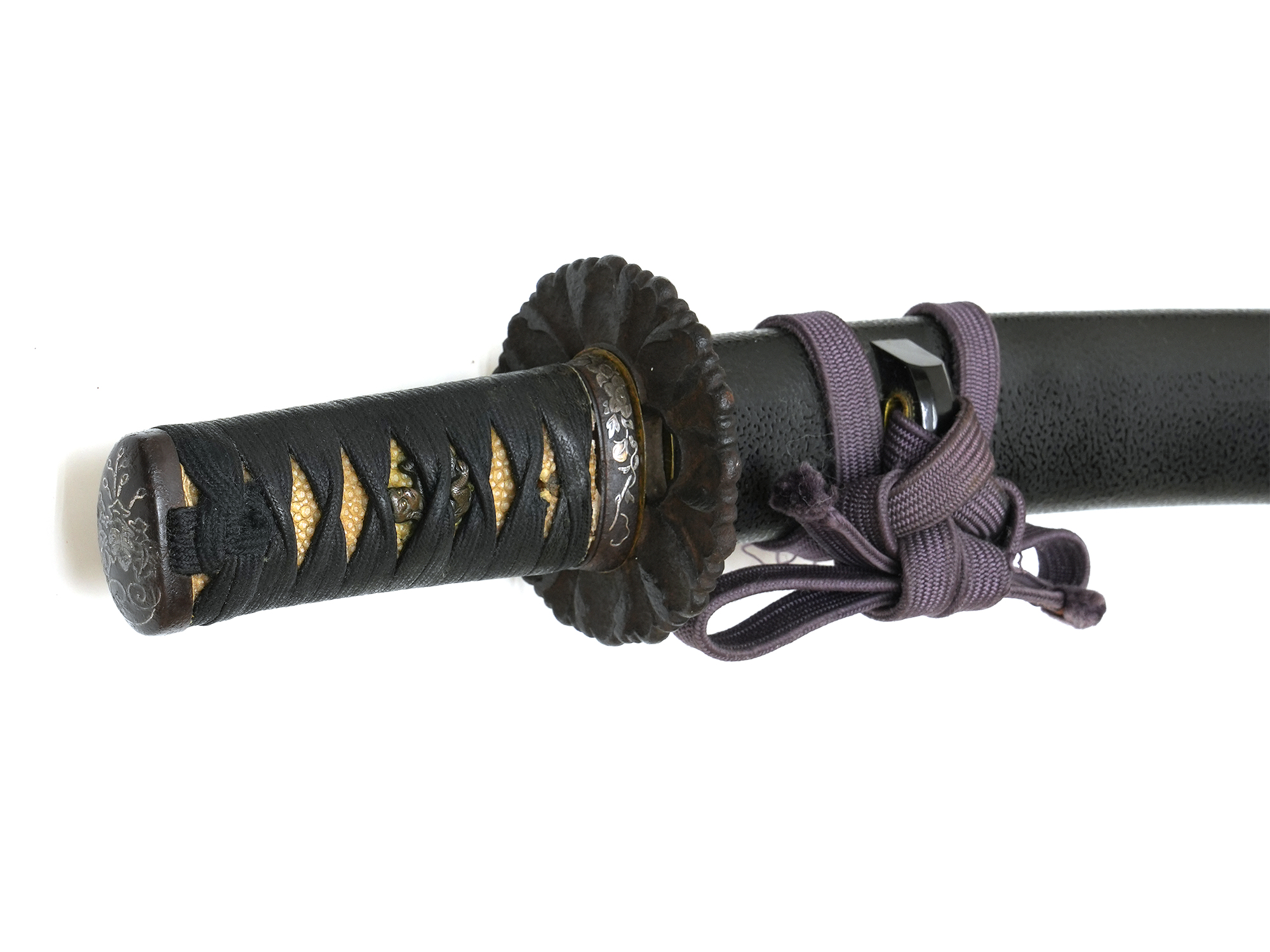 附属の拵は、鞘を皺革塗りとし、柄には愛らしい河童の目貫を配しています。河童は古来、水を司る霊的存在として信仰され、水難避けや航海安全の護符として武士に重宝されました。そのため、川辺や港町に縁のある武士が縁起物として刀装具に取り入れた例も多く、本作もその趣を色濃く残しています。両手を上げ背中を丸めた河童の姿勢は、生き生きとした表情と相まって、思わず微笑みを誘います。