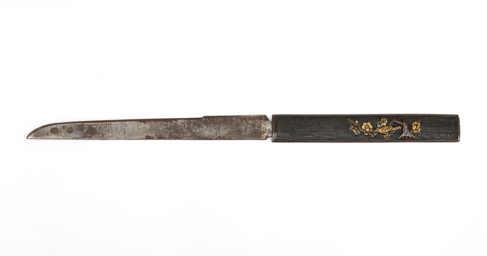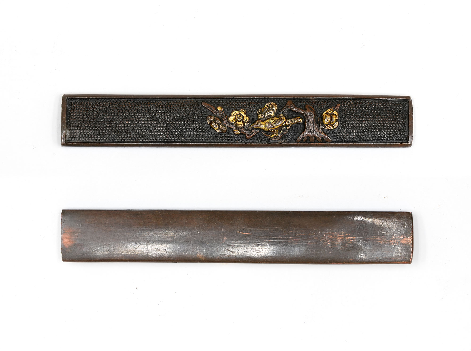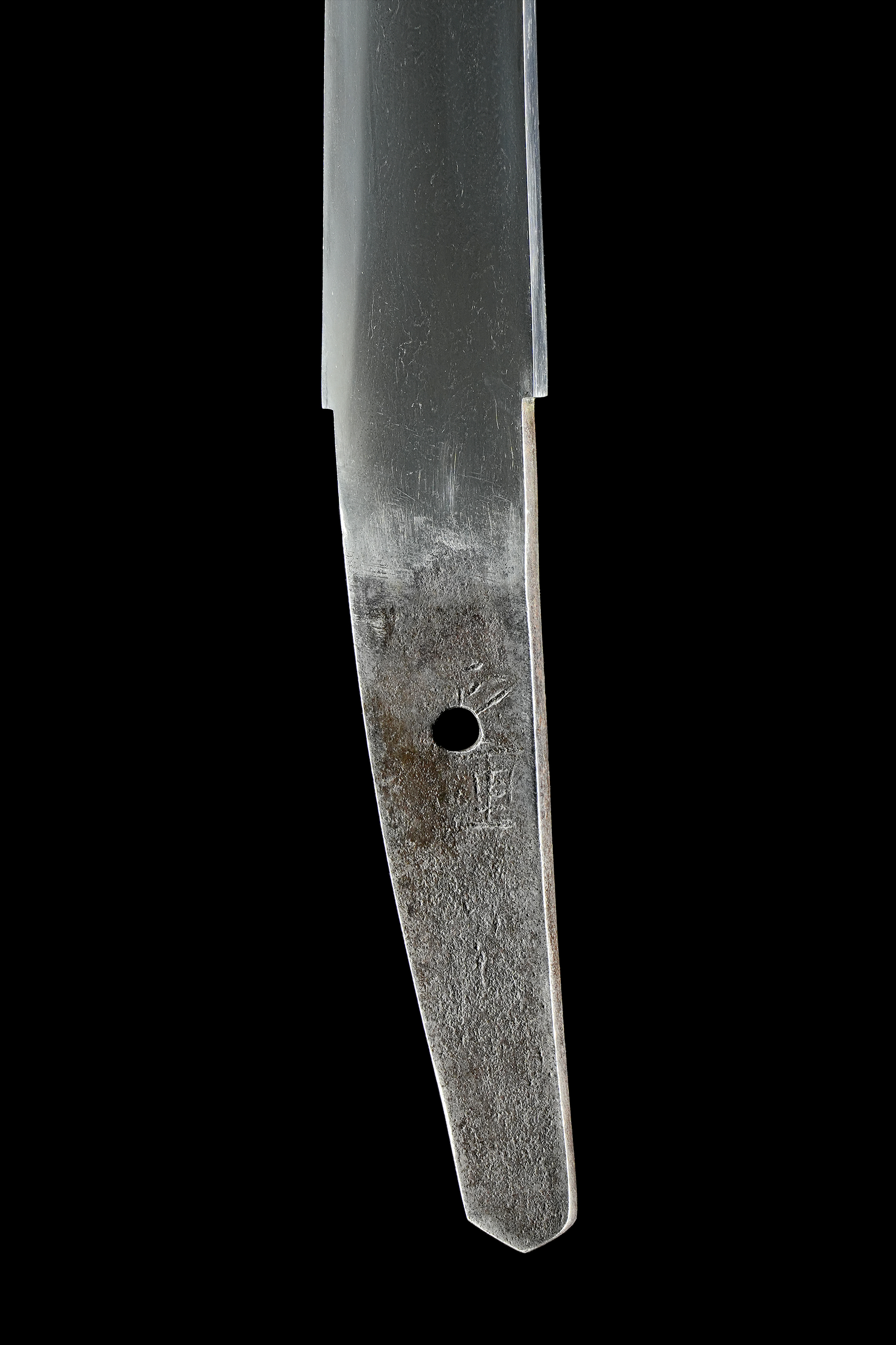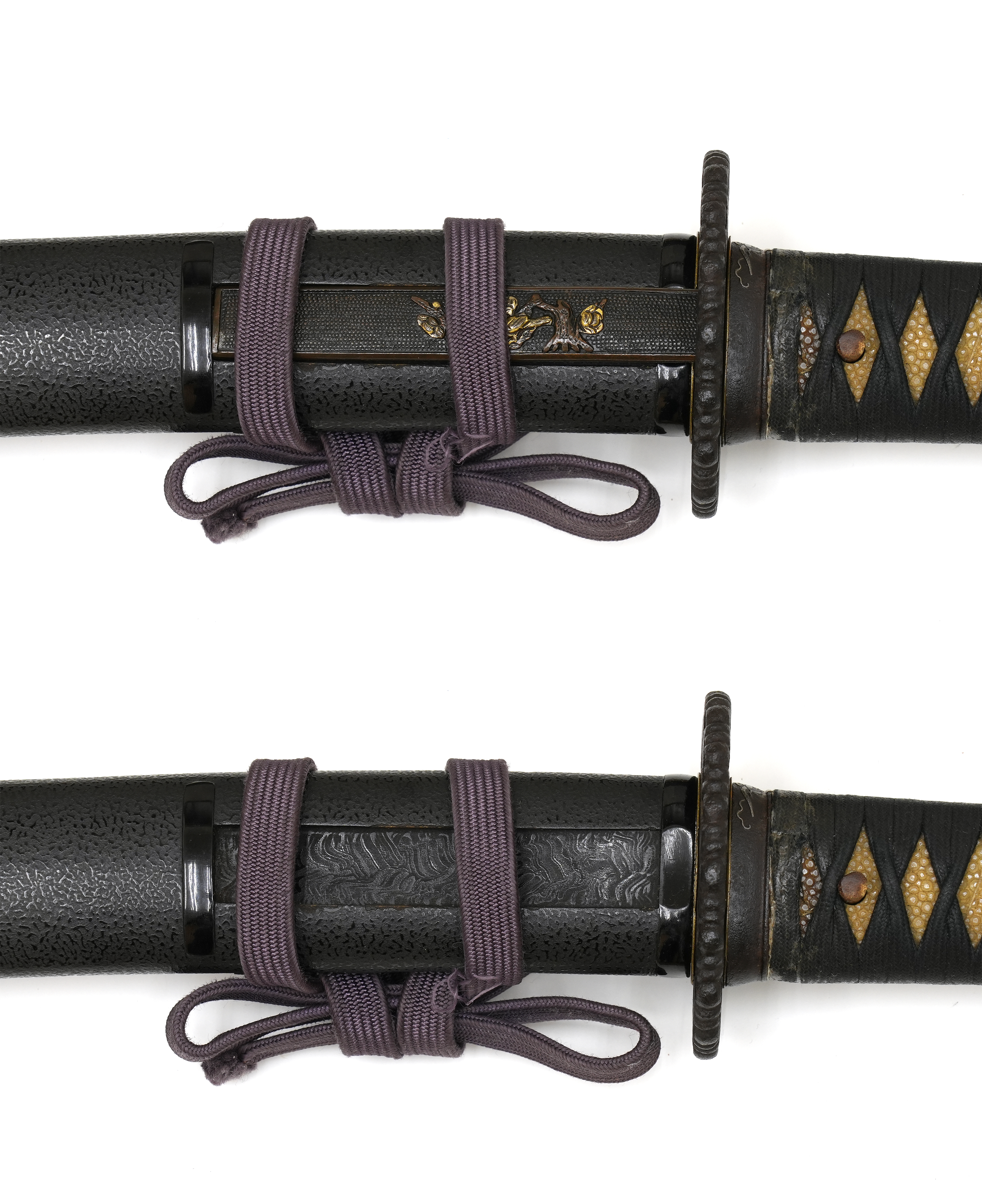 附属の拵は、鞘を皺革塗りとし、柄には愛らしい河童の目貫を配しています。河童は古来、水を司る霊的存在として信仰され、水難避けや航海安全の護符として武士に重宝されました。そのため、川辺や港町に縁のある武士が縁起物として刀装具に取り入れた例も多く、本作もその趣を色濃く残しています。両手を上げ背中を丸めた河童の姿勢は、生き生きとした表情と相まって、思わず微笑みを誘います。
