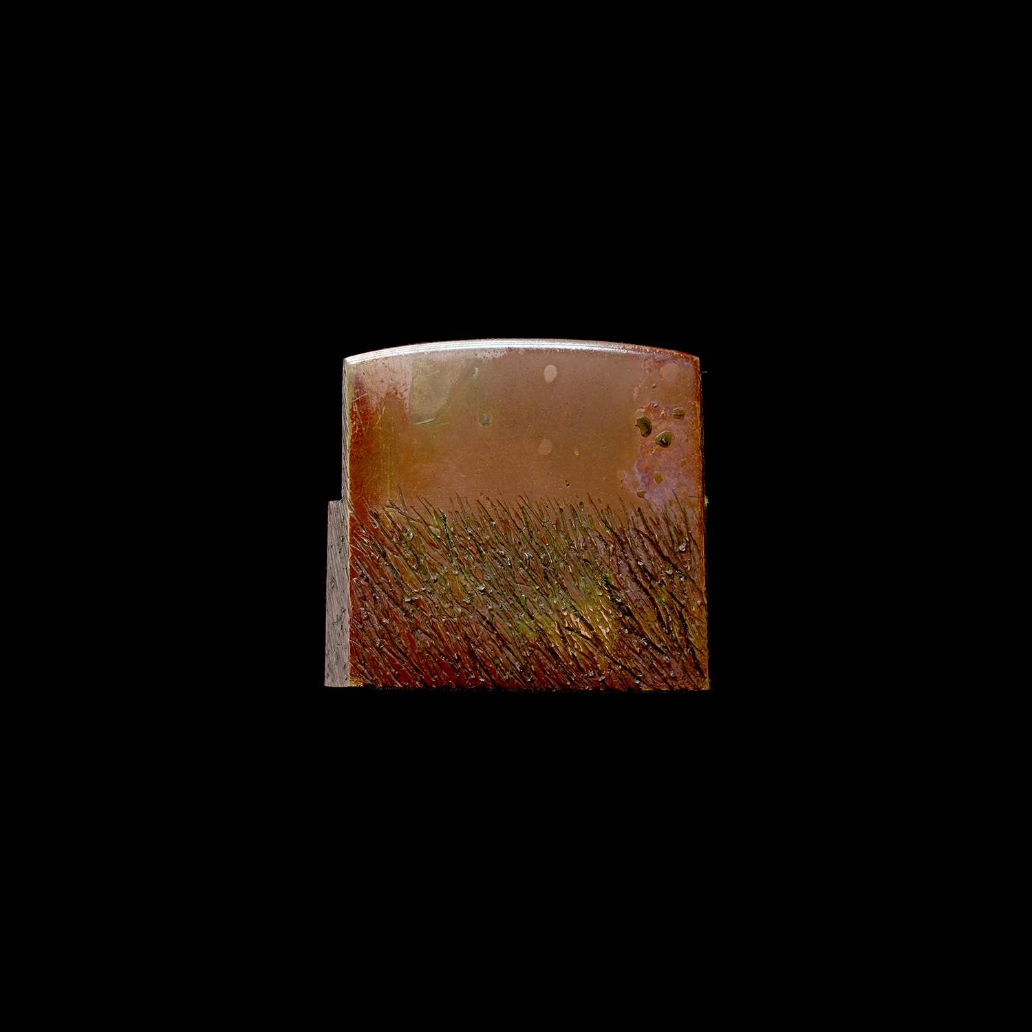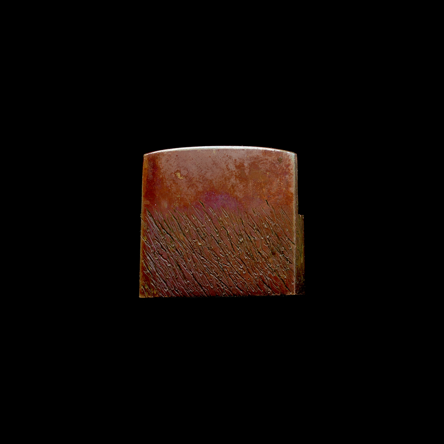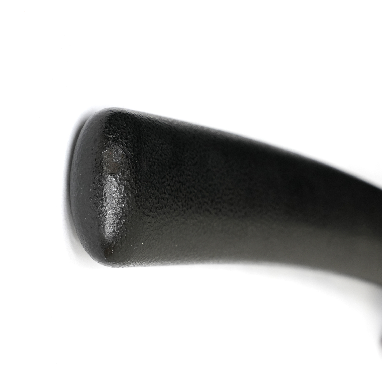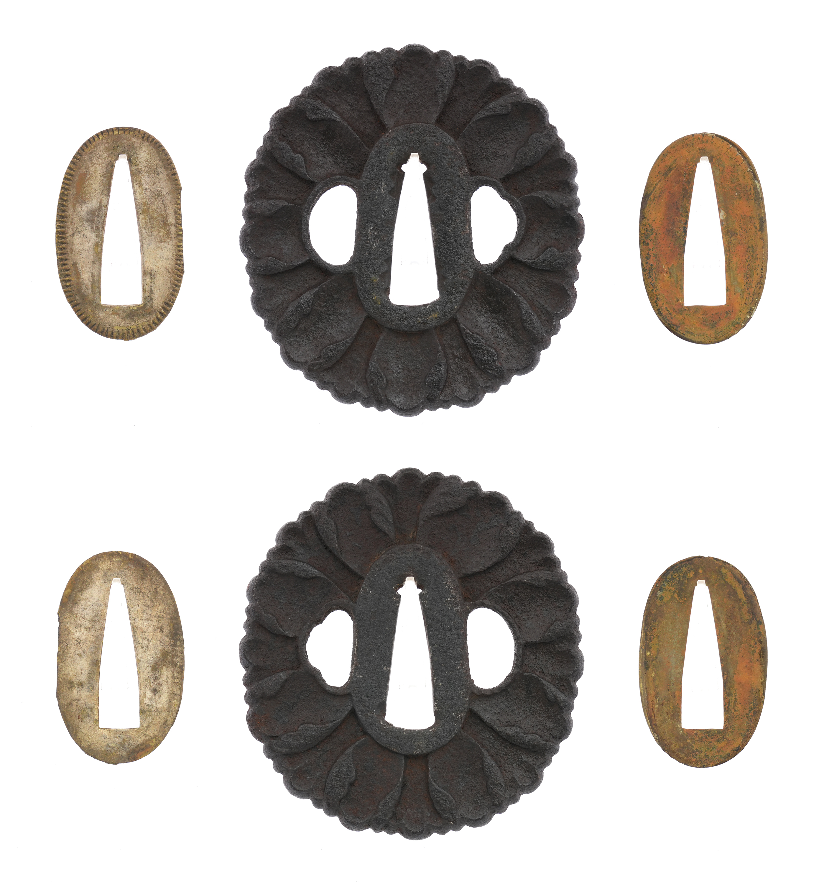 附属の拵は、鞘を皺革塗りとし、柄には愛らしい河童の目貫を配しています。河童は古来、水を司る霊的存在として信仰され、水難避けや航海安全の護符として武士に重宝されました。そのため、川辺や港町に縁のある武士が縁起物として刀装具に取り入れた例も多く、本作もその趣を色濃く残しています。両手を上げ背中を丸めた河童の姿勢は、生き生きとした表情と相まって、思わず微笑みを誘います。