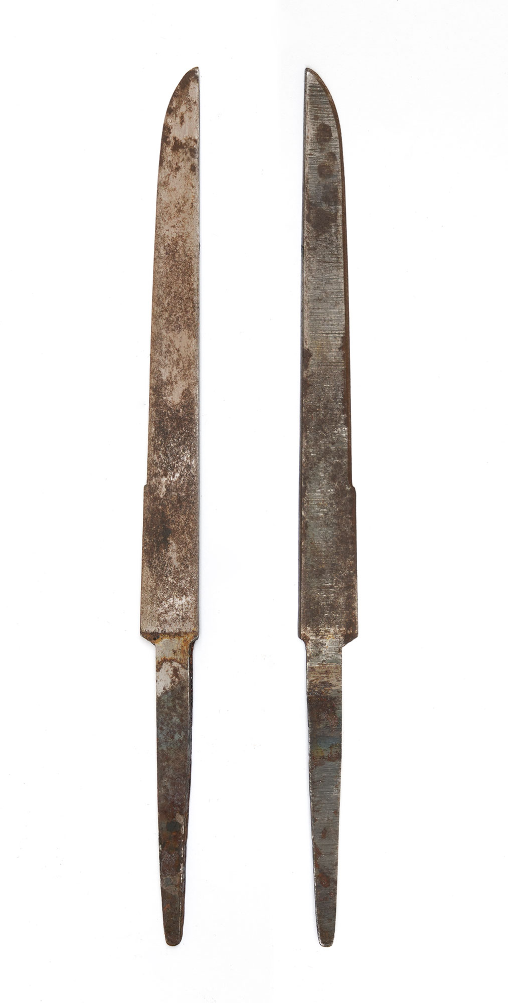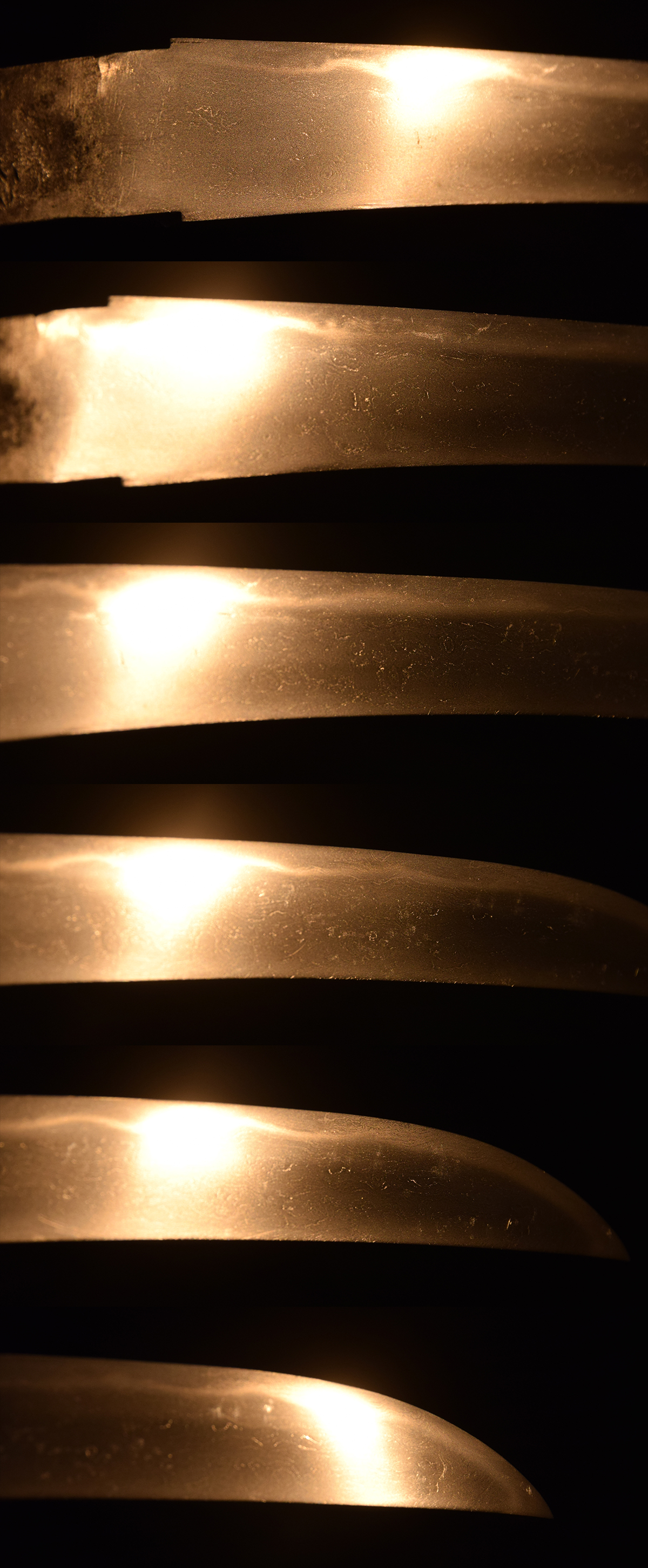 平造。身幅重ねしっかりとして豪壮。小板目杢交じりの地鉄が良く錬れる。刃文は直刃調に極浅く湾れ、刃中には葉が入り、細かな砂流も顕著に見られ、刃中の肌に絡んだ緻密で複雑な景色が見られる。鋩子は直ぐ調に先丸く返る。