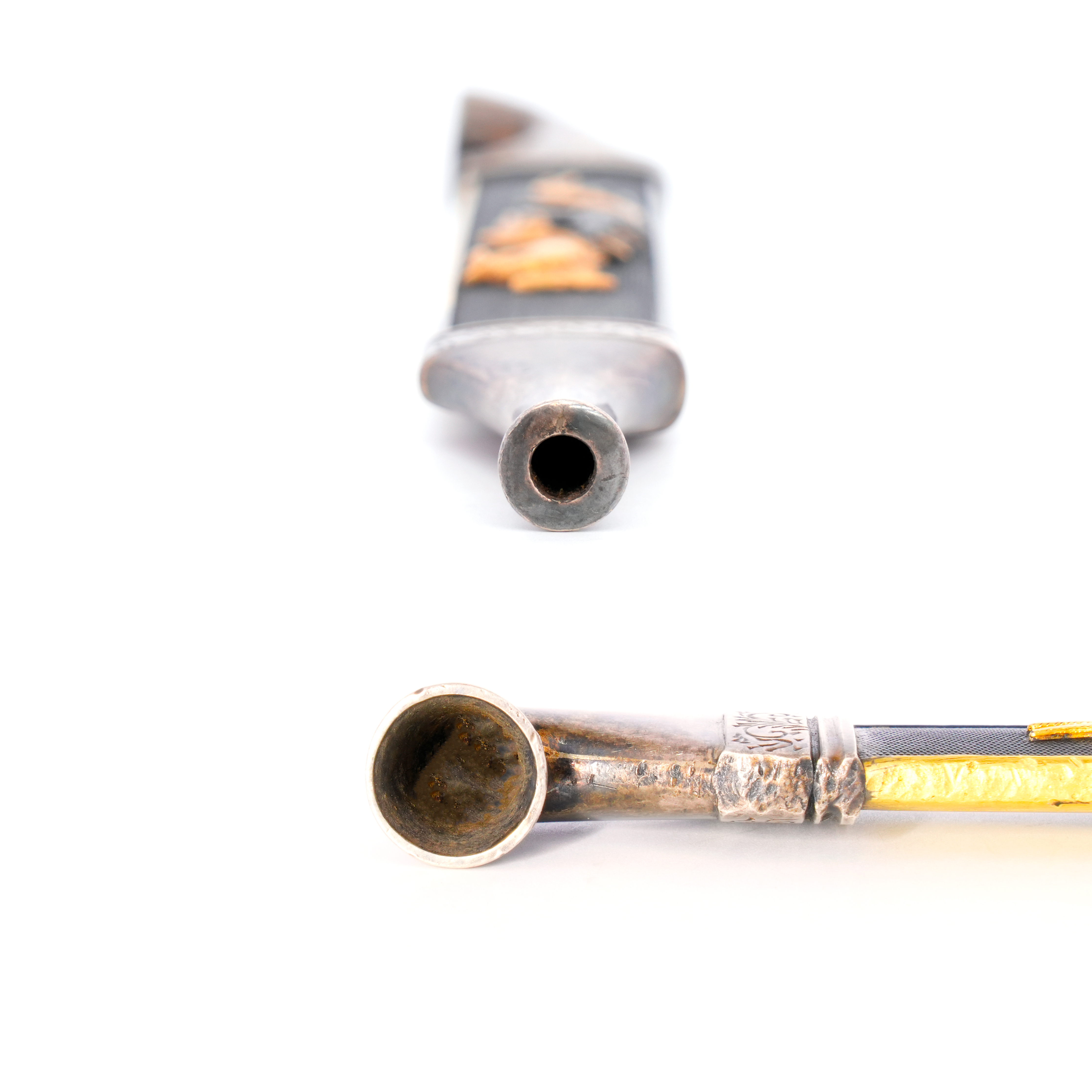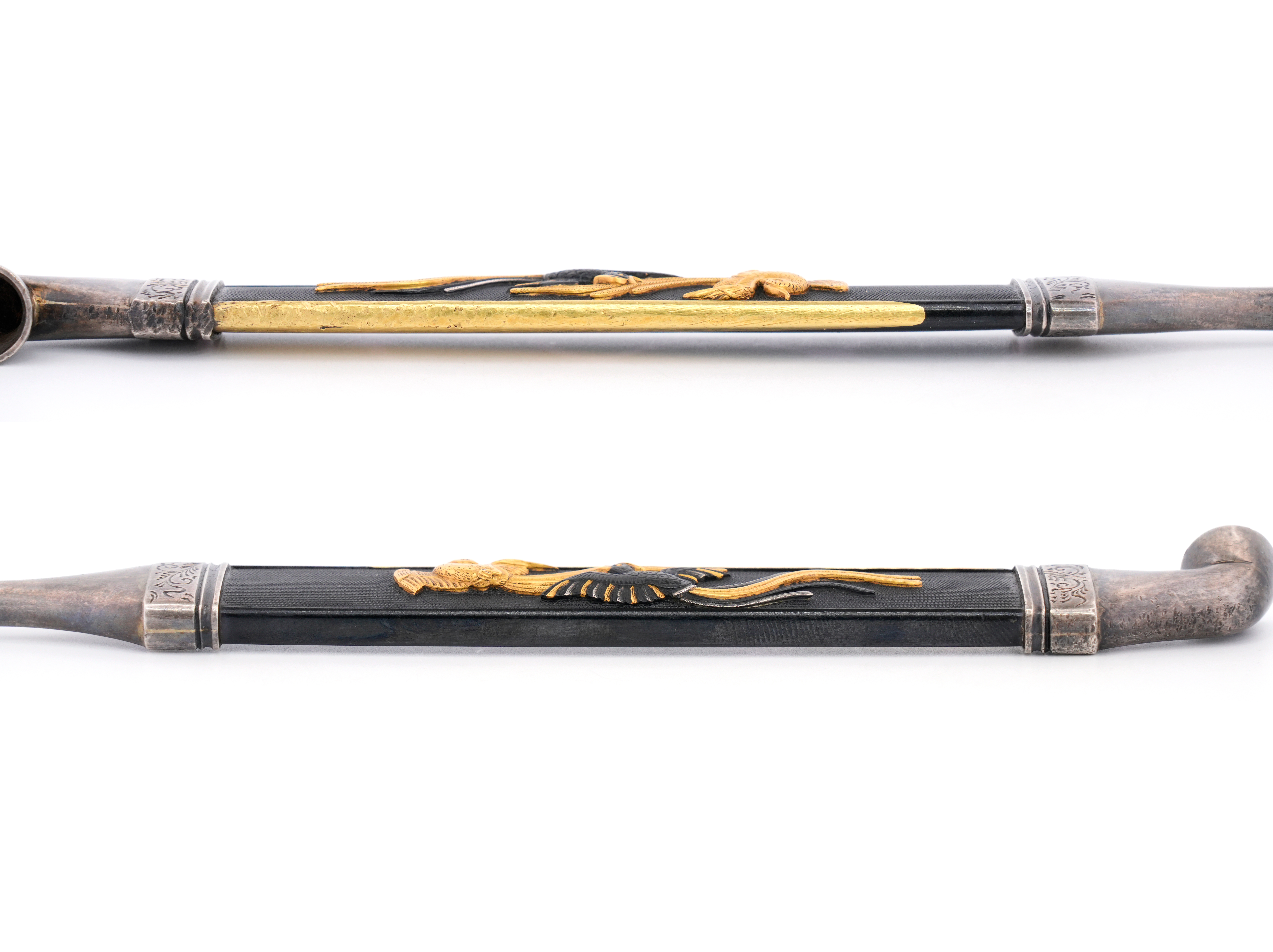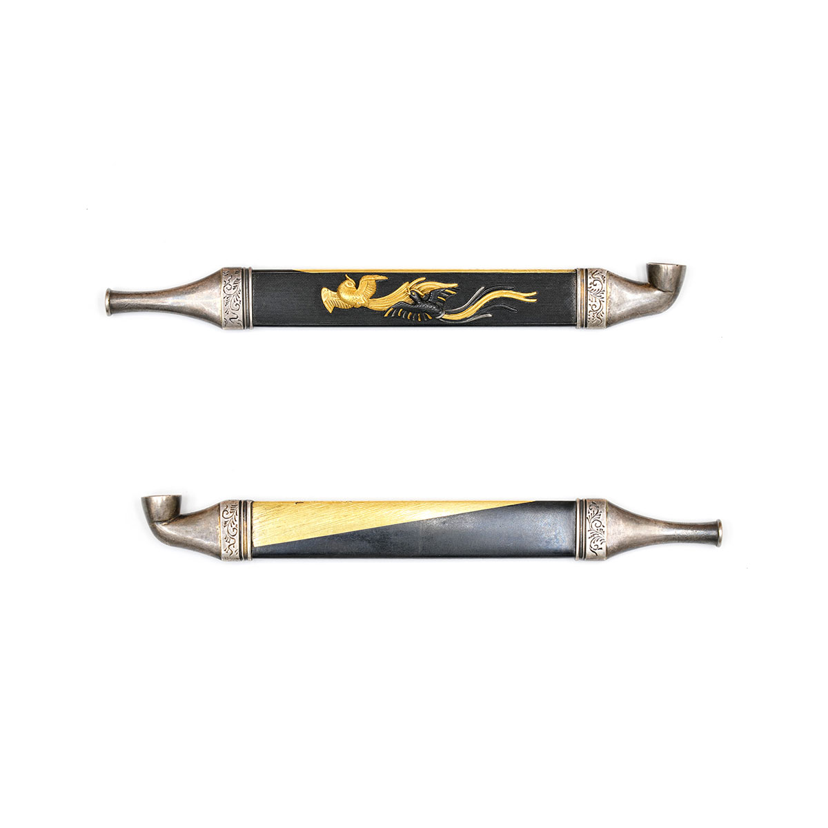 赤銅地に魚子を丁寧に打ち、その上に雌雄の鳳凰を巧緻な鏨使いで活き活きと彫り表した見事な作。元は小柄として製作されたものだが、幕末から明治にかけての頃、洒脱な意匠の煙管へと造り直されたものと見られる。吸口と羅宇先端には銀を用い、上品さと風格を兼ね備えた逸品。