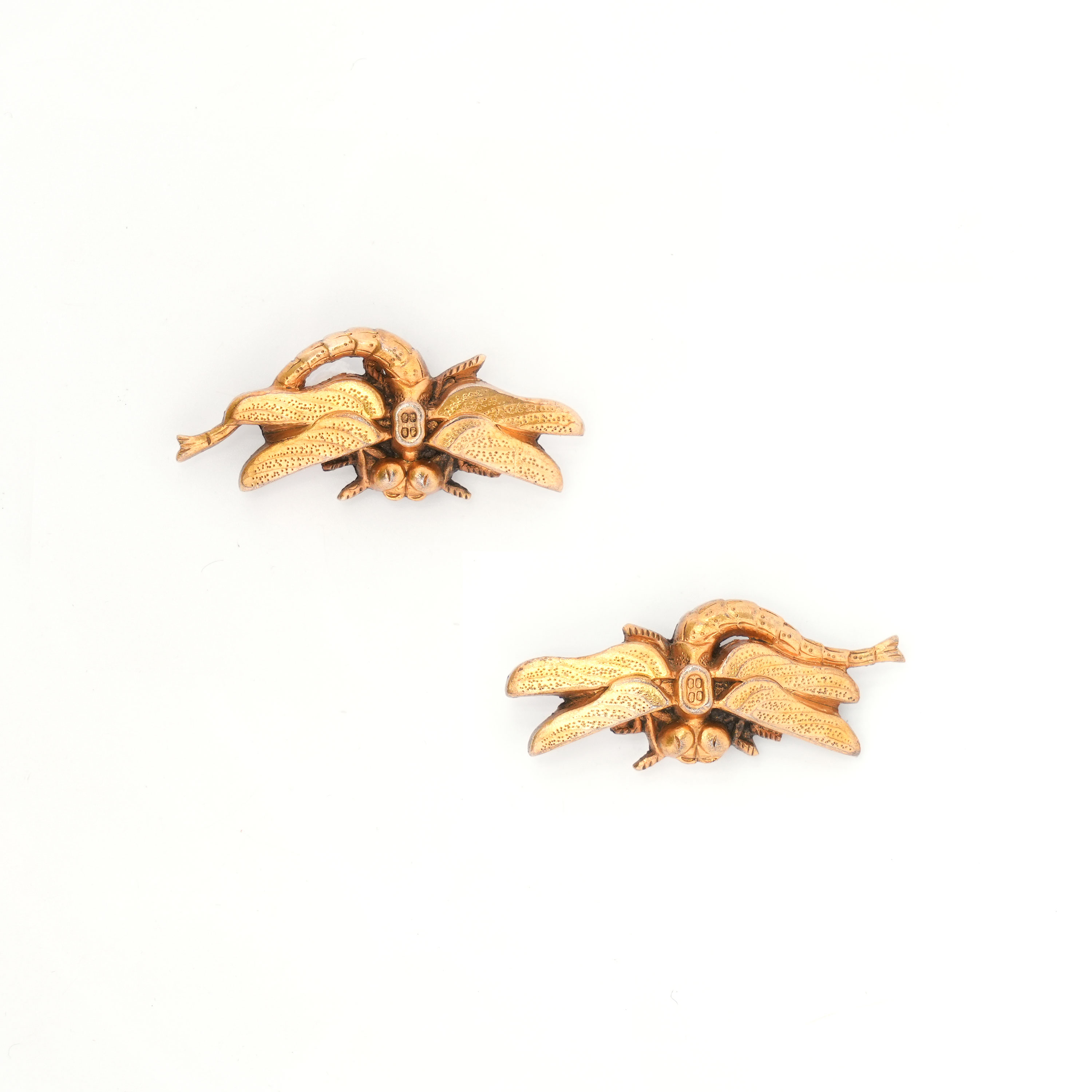 小振りながらも、勝虫の生命力と躍動感を力強く彫り上げた一作。勝虫(蜻蛉)は、前にしか進まず退かないことから「不退の精神」を象徴し、古来より武士に好まれた吉祥の図である。戦勝祈願や不屈の心の象徴として用いられ、武家文化の中で特に尊ばれた意匠。素材は金無垢と思われ、格調と気品を兼ね備えている。