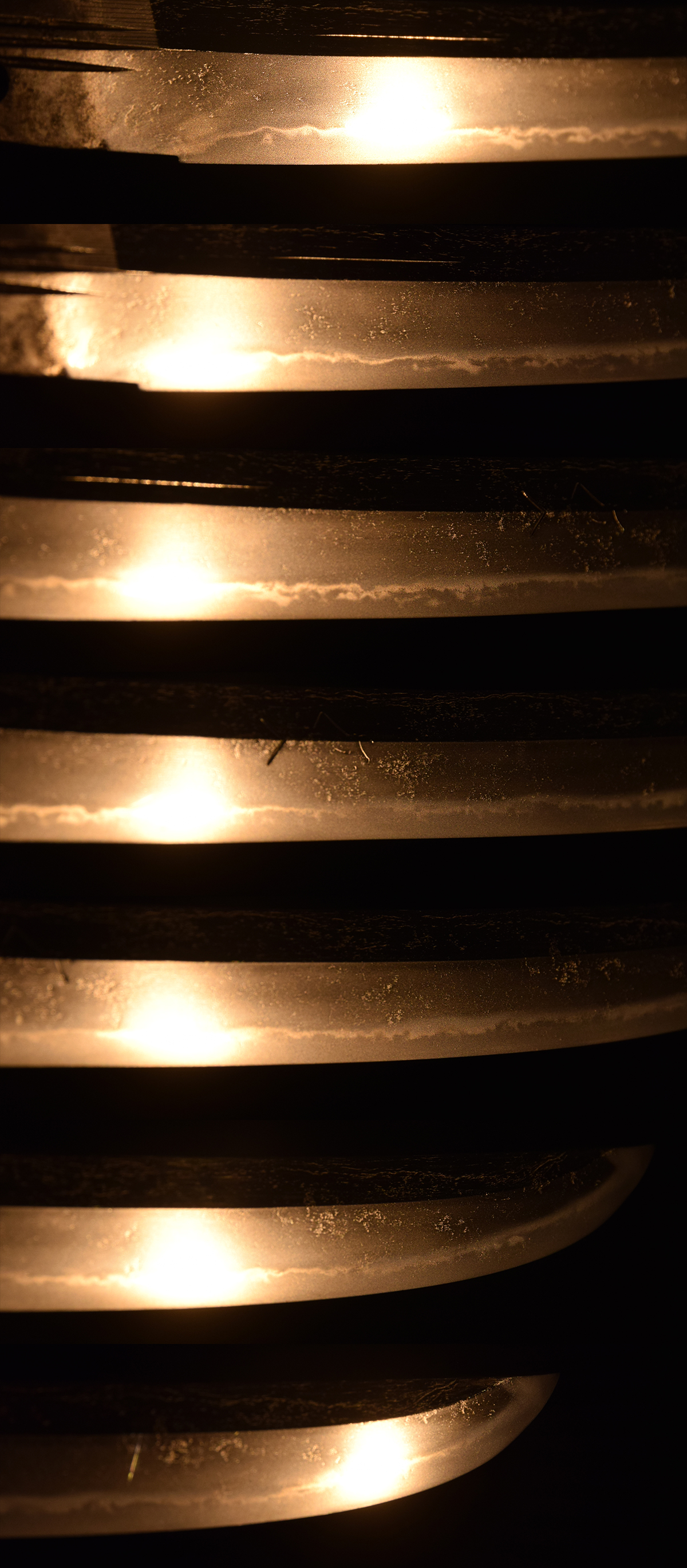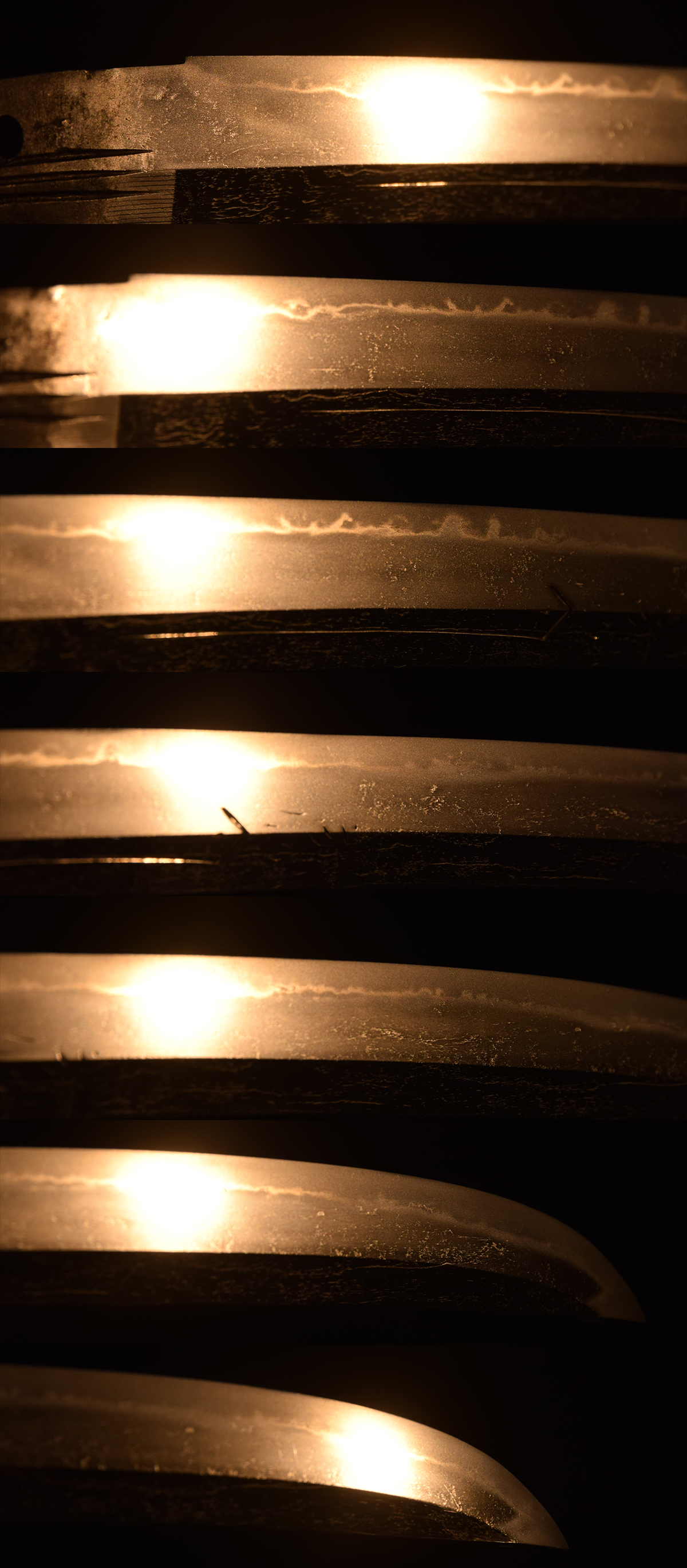 初代信國の作風は京物の伝統を示した直刃と貞宗風を承けた湾れ刃の二様が主でしたが、南北朝末期の代替わりの信國から「應永信國」にかけては、上記の作風のほかに互の目調の乱れ刃の作域が新たに加わります。