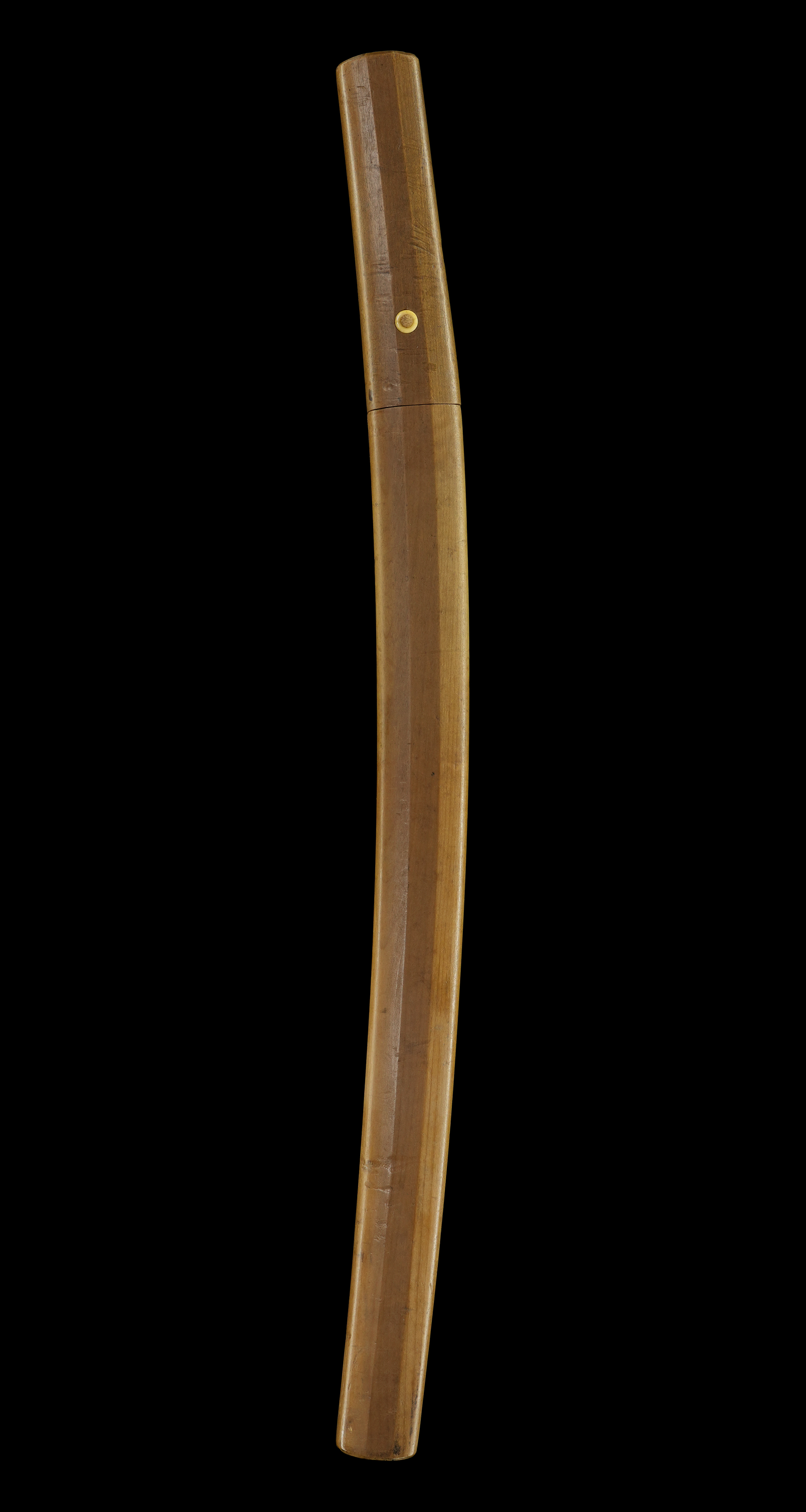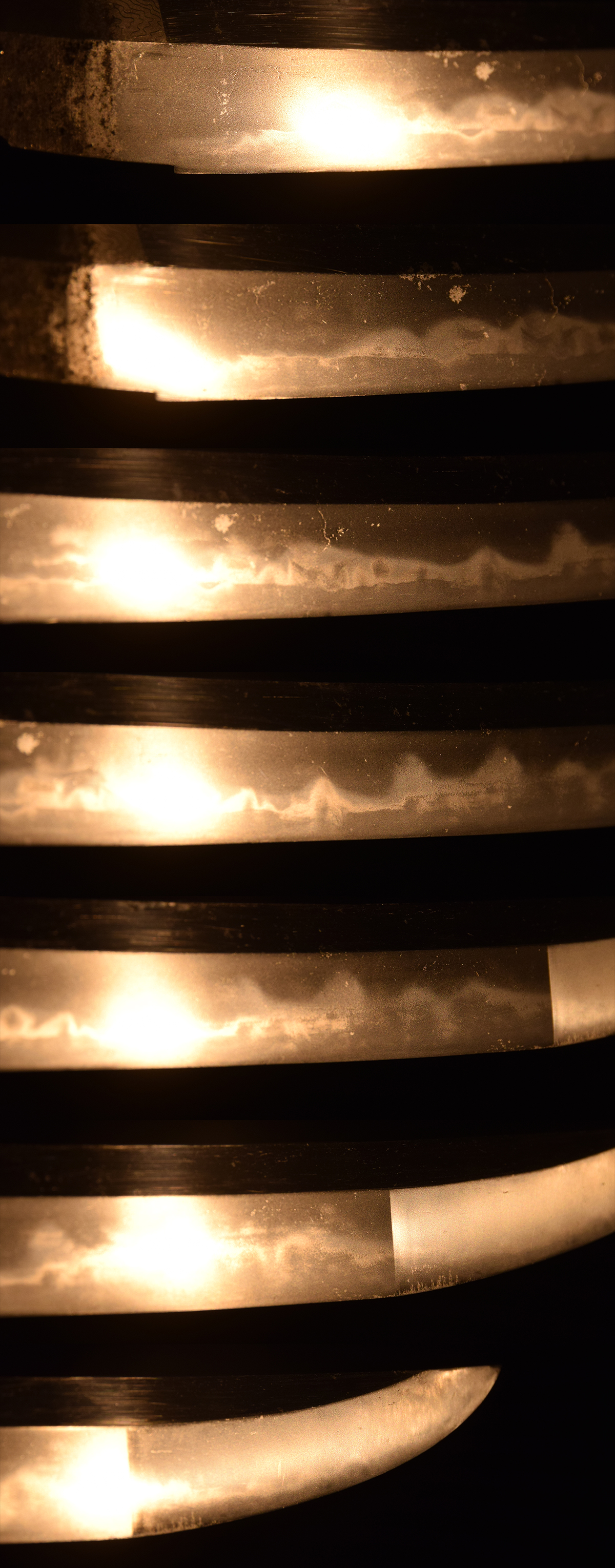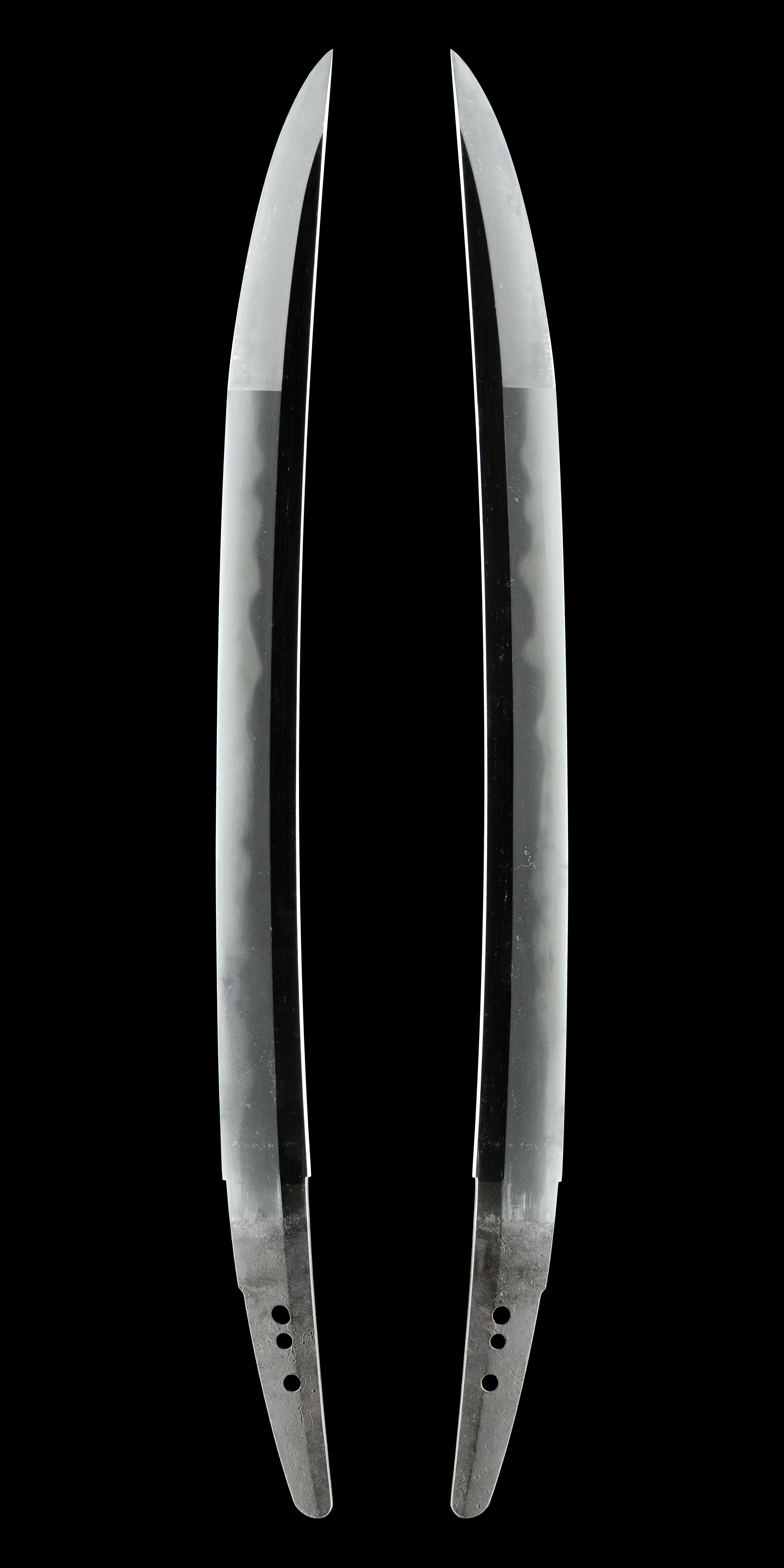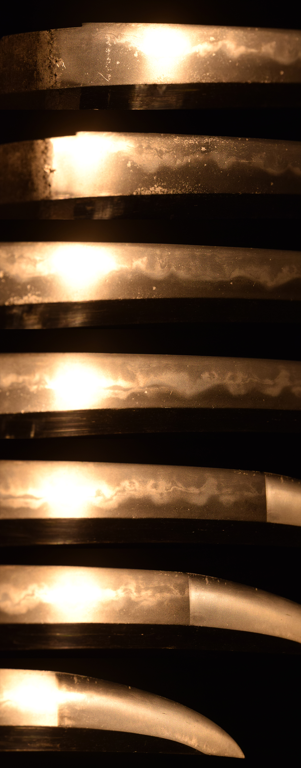 元先の幅差目立たず、大切先に結ぶ堂々たる姿。地鉄は板目肌がよく錬れて詰み、地沸ついて精美。刃文は匂口明るく冴えた互ノ目を焼き、刃中には金筋・砂流が頻りにかかり、複雑な働きを多々見せ、大粒の沸が刃縁に絡み、それが地に溢れて強い湯走りを見せ、鋩子は乱れ込んで先丸く返っています。