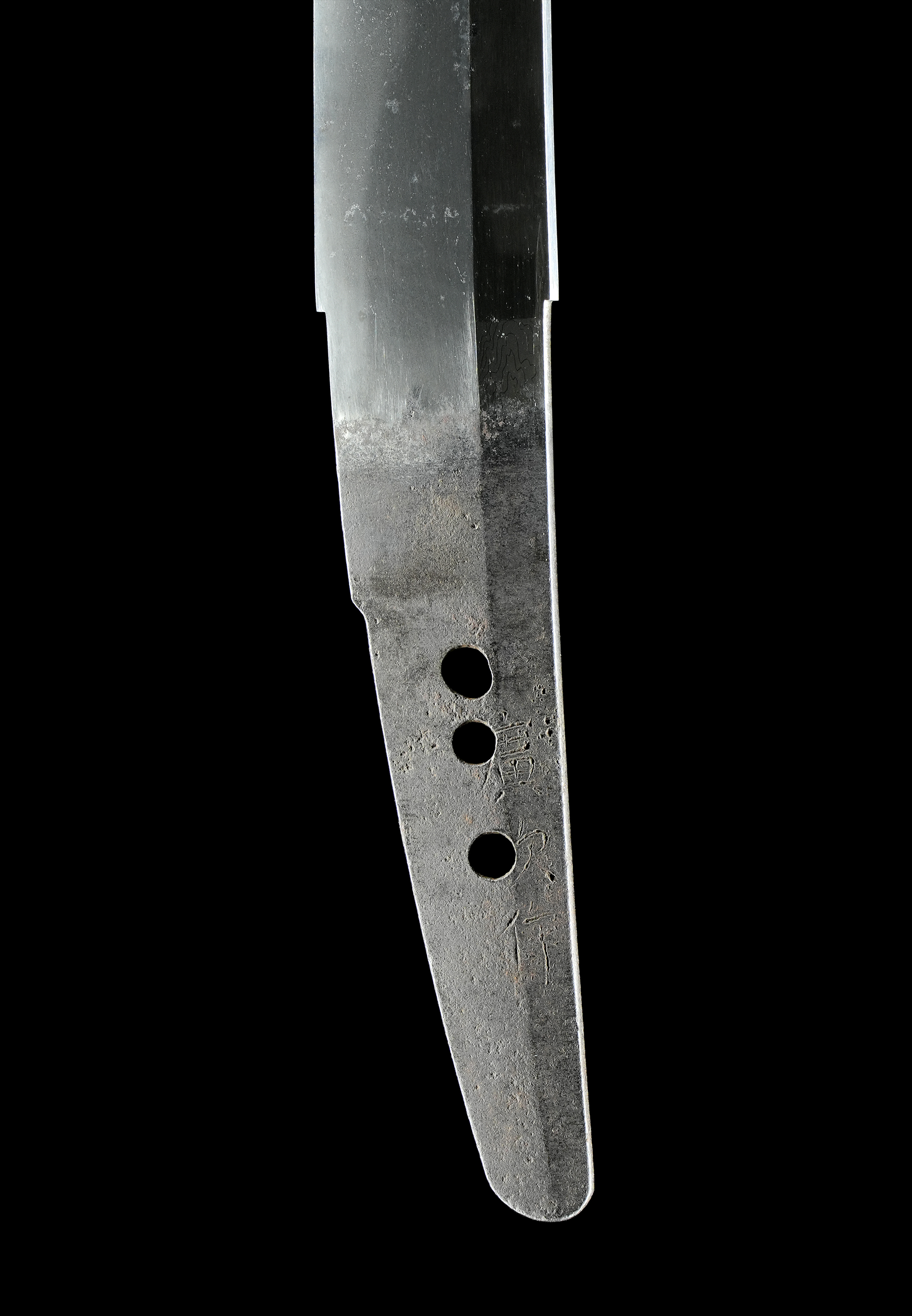 未鑑定刀につき銘の真贋は断じかねますが、出来ぶりから見て末相州物と鑑てよいでしょう。迫力ある体配と雉腿茎が相俟って、見る者を魅了する一振です。はばきを見るに元来は着せの高級品であったと推測され、昭和26年3月と、かなり早い時期の大名登録刀であることからも、伝来の良さが覗える逸品です。