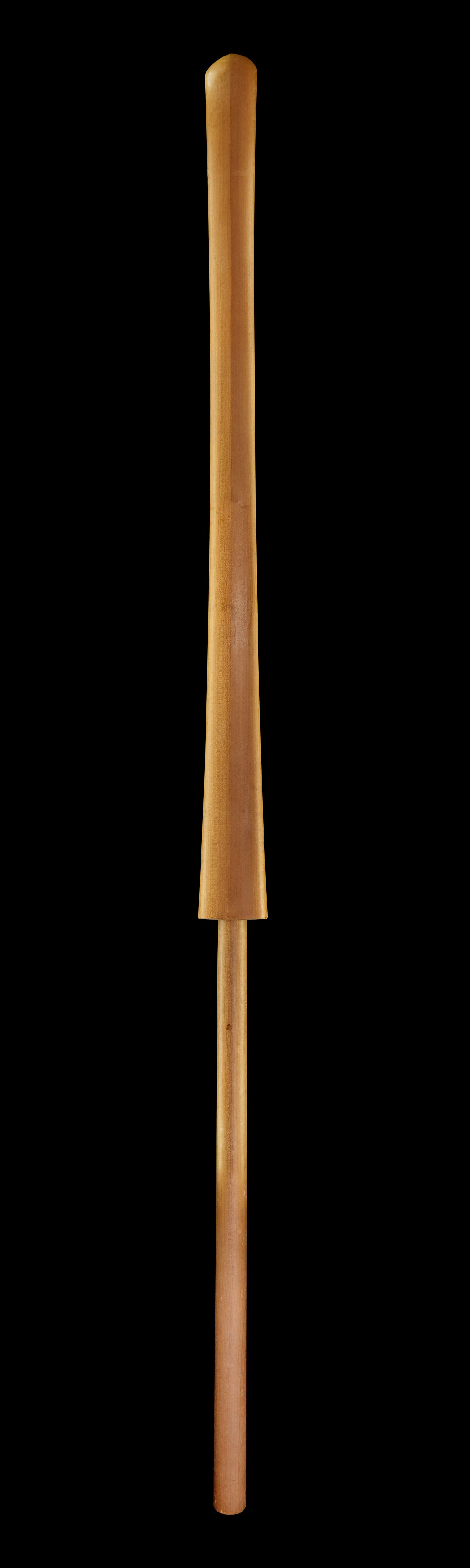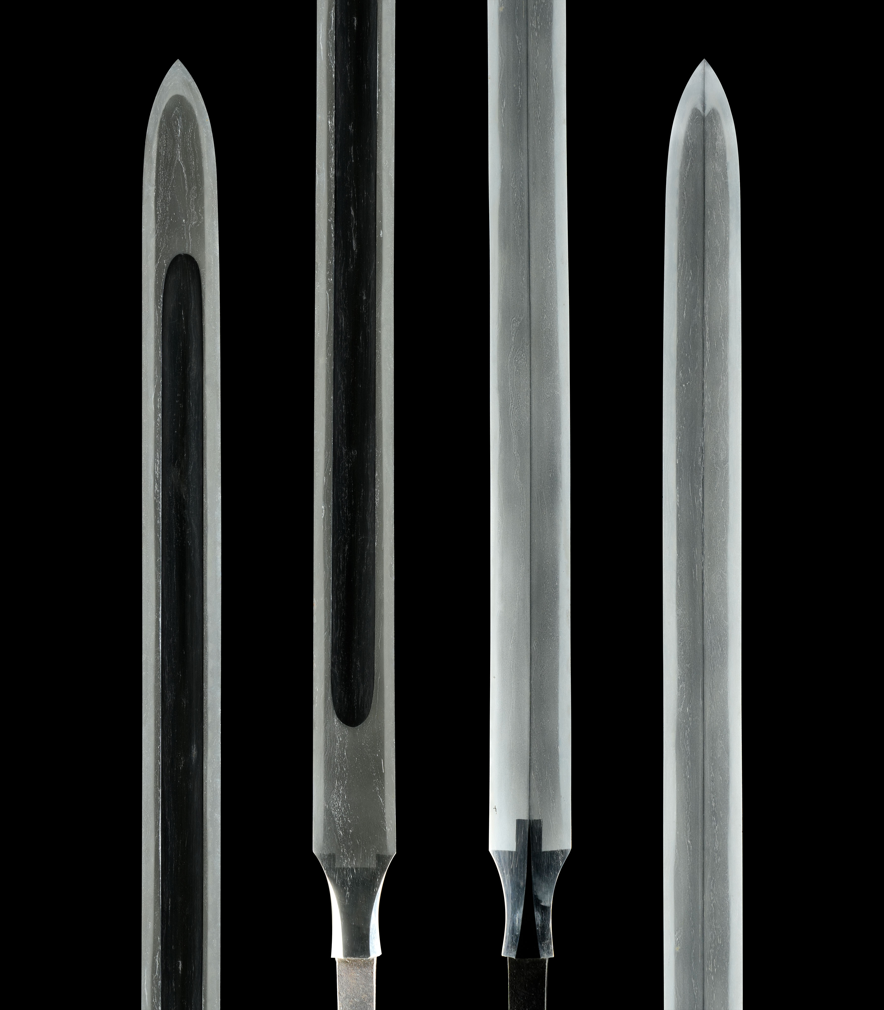 本作は二尺五寸五分強の長大な大身槍で、平三角造。螻蛄首を八角形とし、螻蛄首がやや長い造り込みであることから、天正二十年以降の室町末期の間に鍛えられた一筋と考えられます。表面には太く長く双頭の樋を力強く掻き、地鉄は板目が柾に流れて杢交じり、地景入り、少しく肌立ち、刃文は互ノ目を焼き上げており、下の方では特に働きが盛んで、連なる互ノ目の中にもう一段連なる互ノ目が一際明るく現れ、そうした働きを伴う刃取り全体が、大きく食い違った感じの箇所があり、砂流かかり、刃中には足や葉が入って金筋現れ、小さな打除風の刃や湯走風の働きも見られる。鋩子は直ぐに先丸く返る。