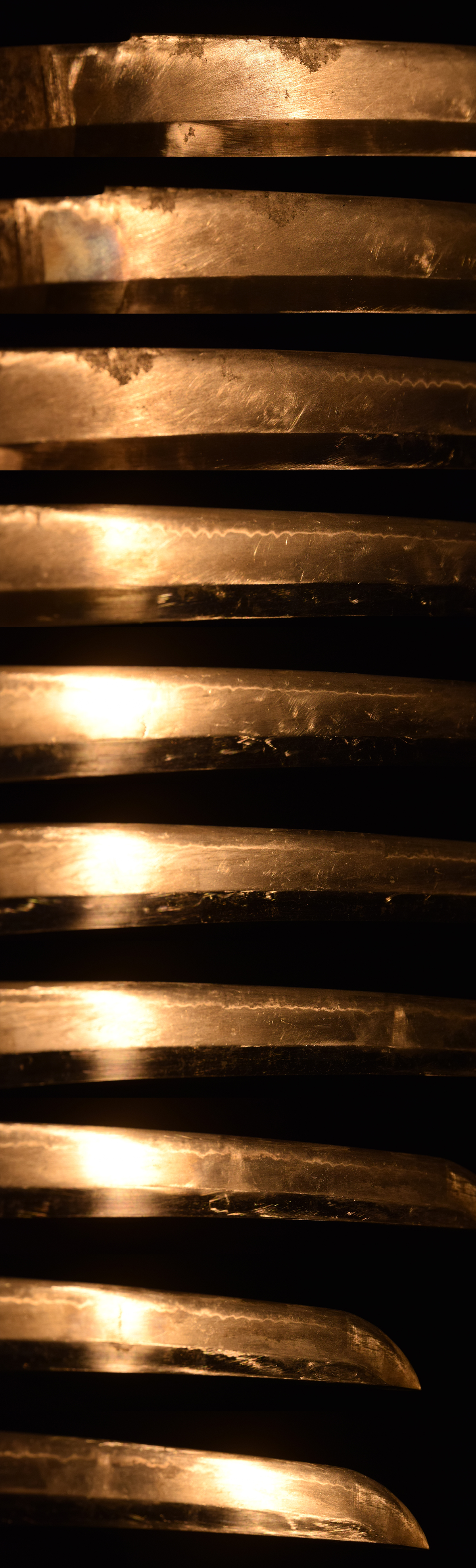 この刀は元先の幅差頃好く開いて中切先が延びた豪壮な姿で、現状では素人の手によって錆落としされている都合上、地鉄の判別が難しいが、古式鍛錬法にて鍛えられた刀であろうと思われる。刃文は匂口明るく冴えた小互ノ目乱れで、尖りごころを交え、足、葉入り、鋩子は直ぐに先丸く返っている。