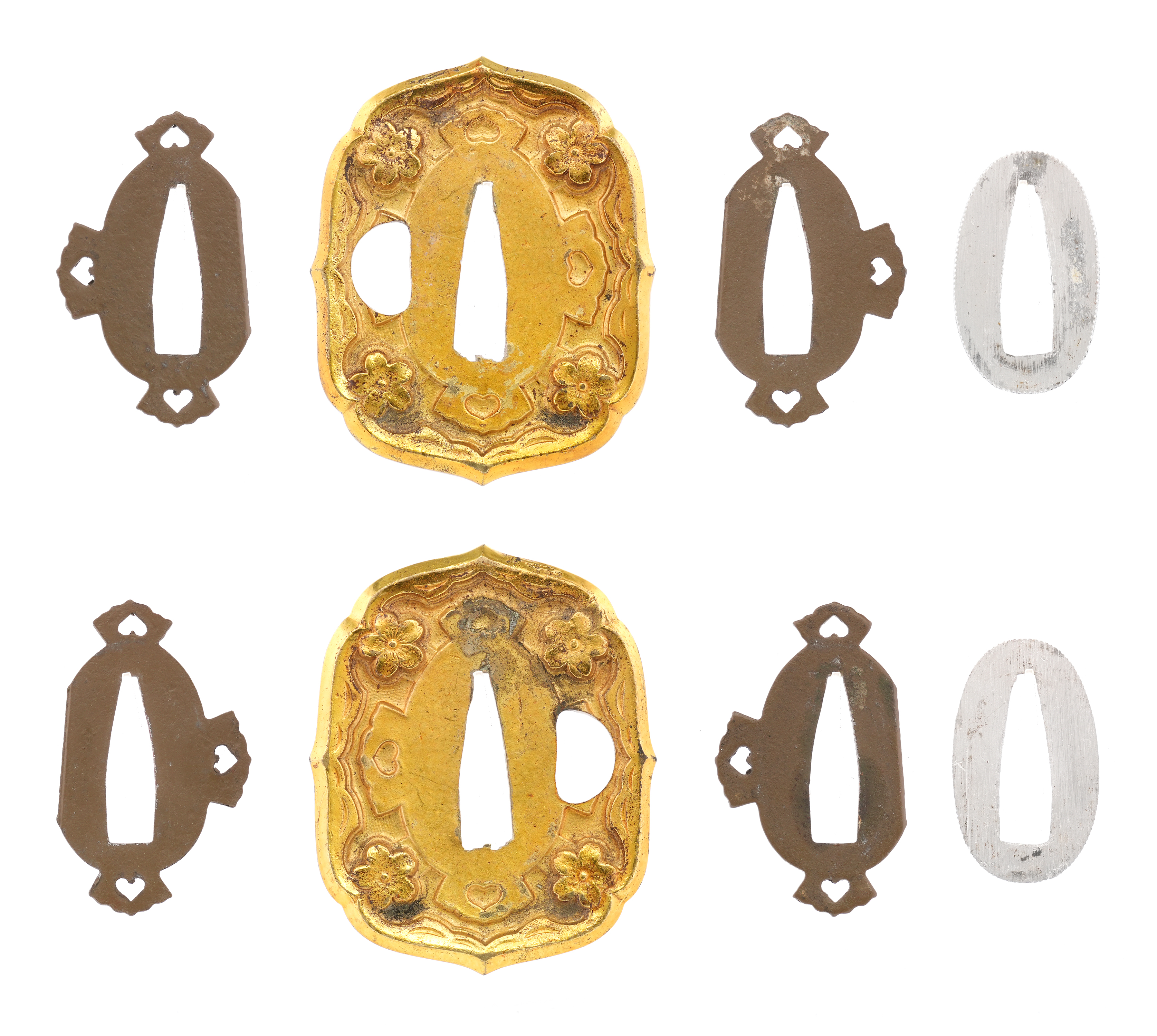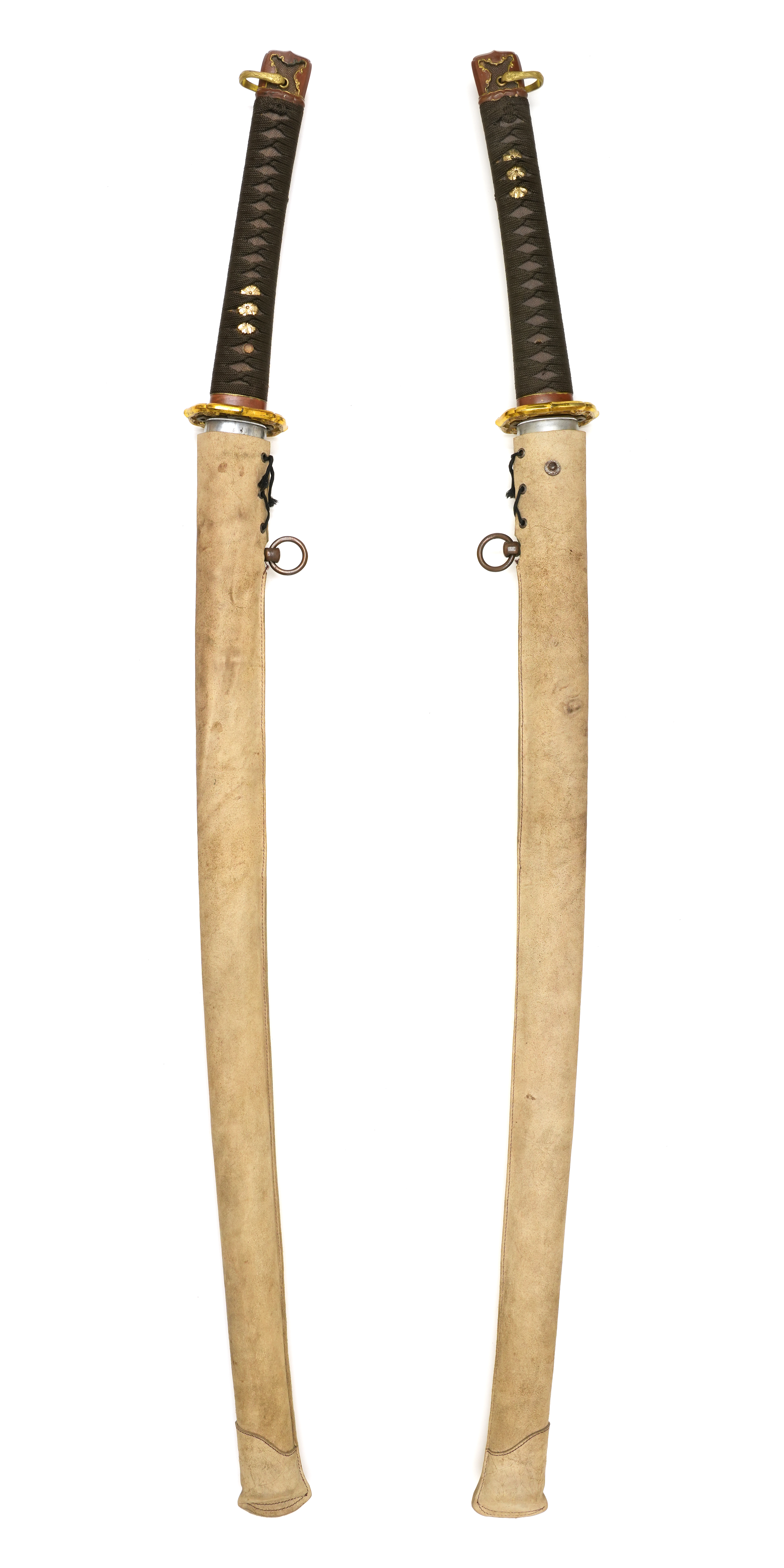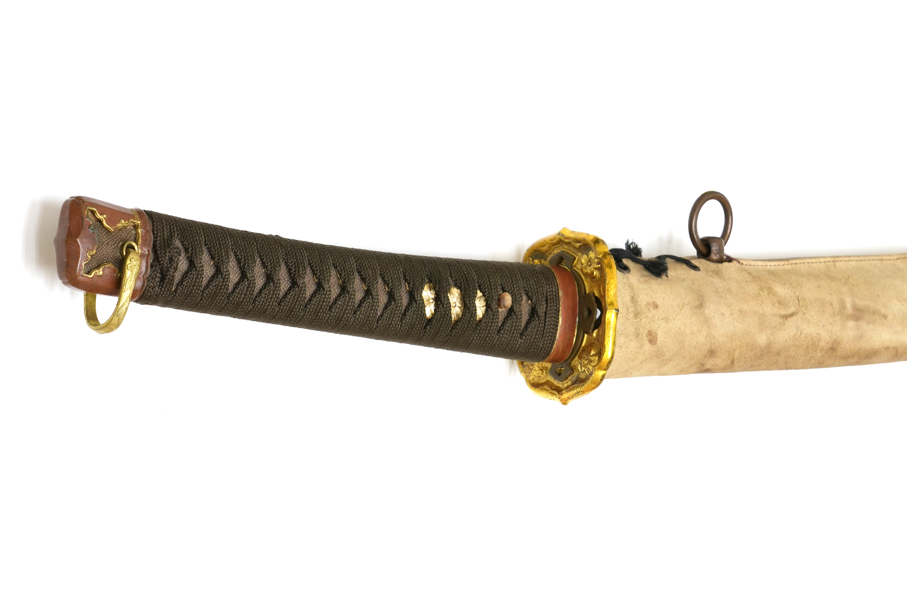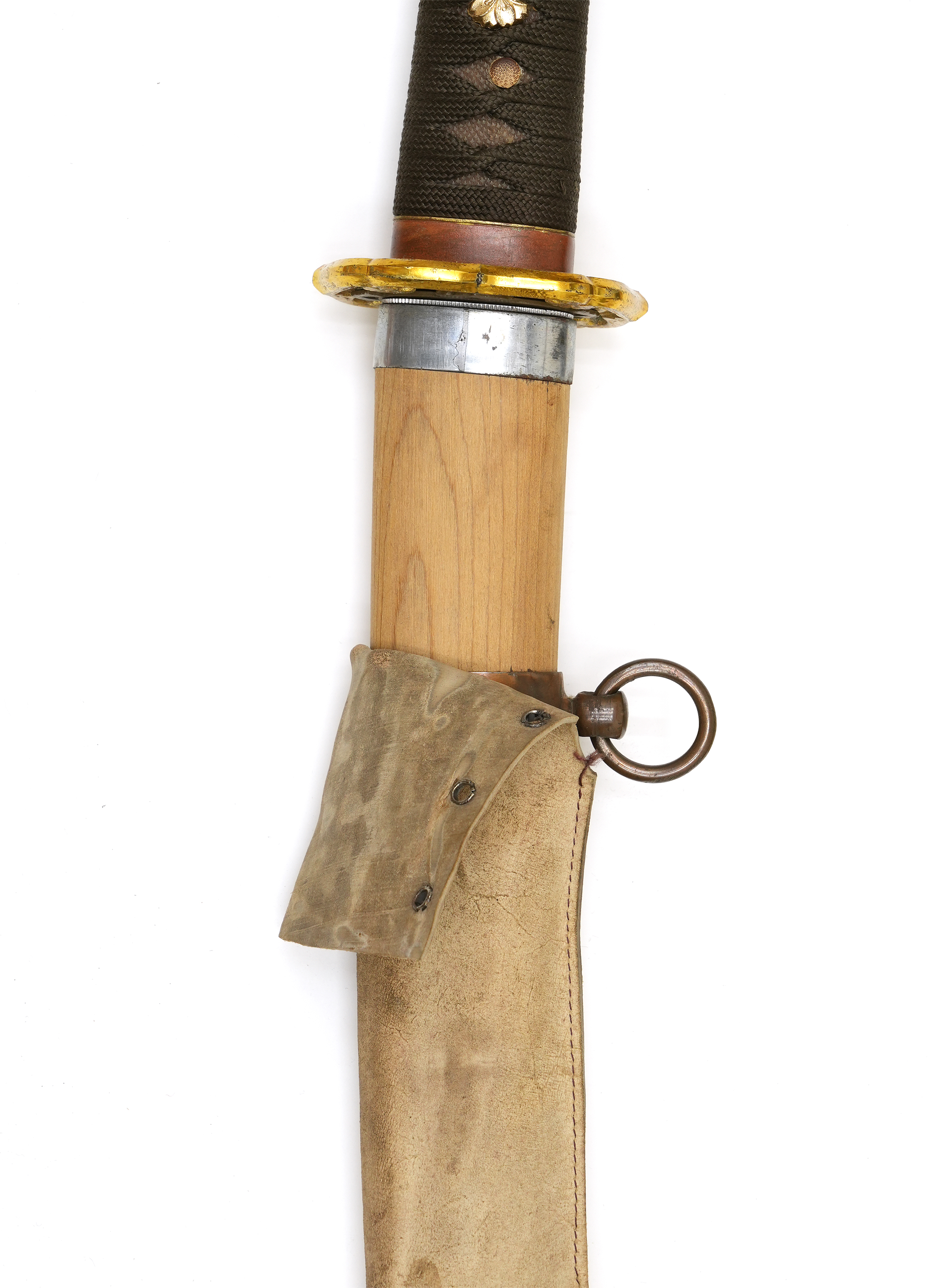 附属の拵は九八式陸軍略式軍刀拵で、縁頭には桜花葉の刻しは無く、磨地仕上げの素朴ながら実用的な金具が添えられています。柄には藍鮫が用いられ、鐔の桜花の角がややだれている点から見て、昭和十九年頃から終戦直前にかけて誂えられ、また、目釘穴が二つ穿たれていることと焼き出し位置の関係から、当時の所有者の希望により区送りが行われたものと推察されます。鐔鳴りは見られますが、柄にがたつきは無くしっかりとしています。本来はホック付きの革切羽が附属していたはずですが、現在は失われていますので、頃合いの厚さの切羽を一枚加算して頂ければ、鐔の上下のがたつきは無くなります。