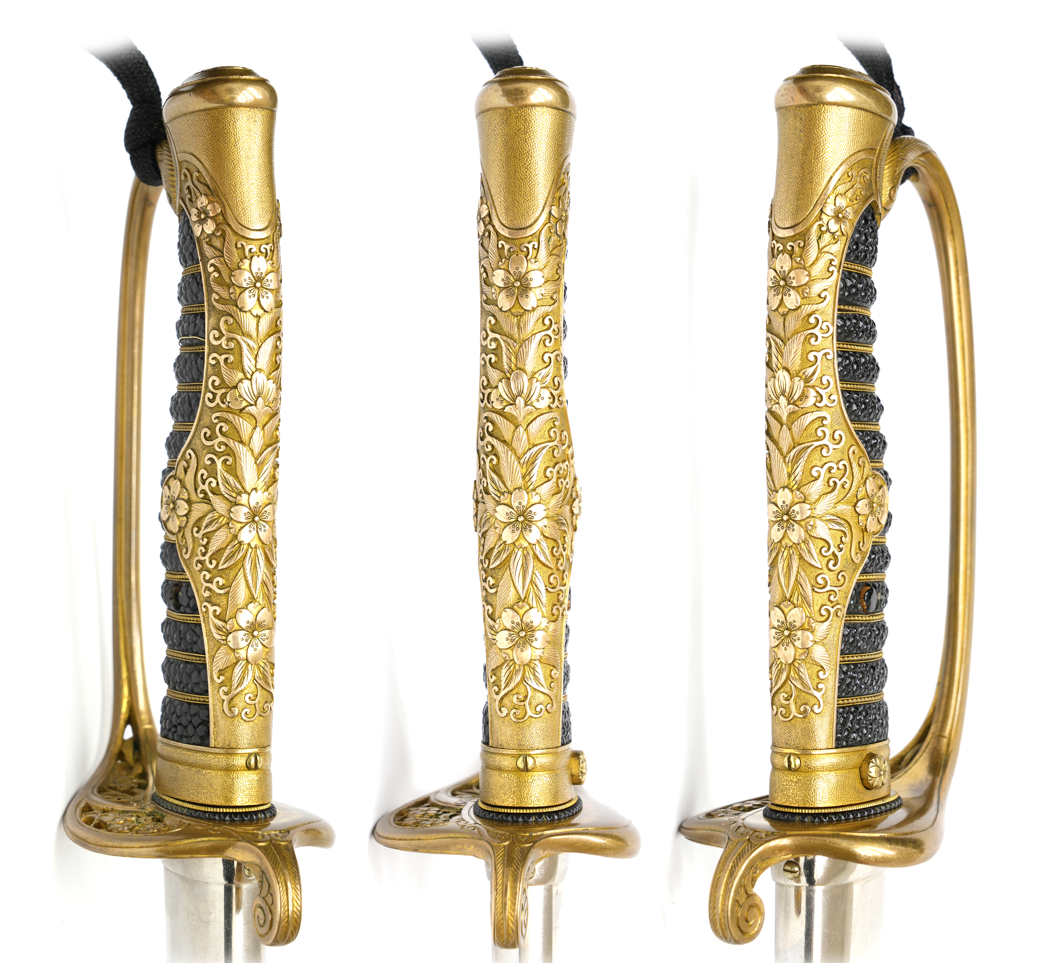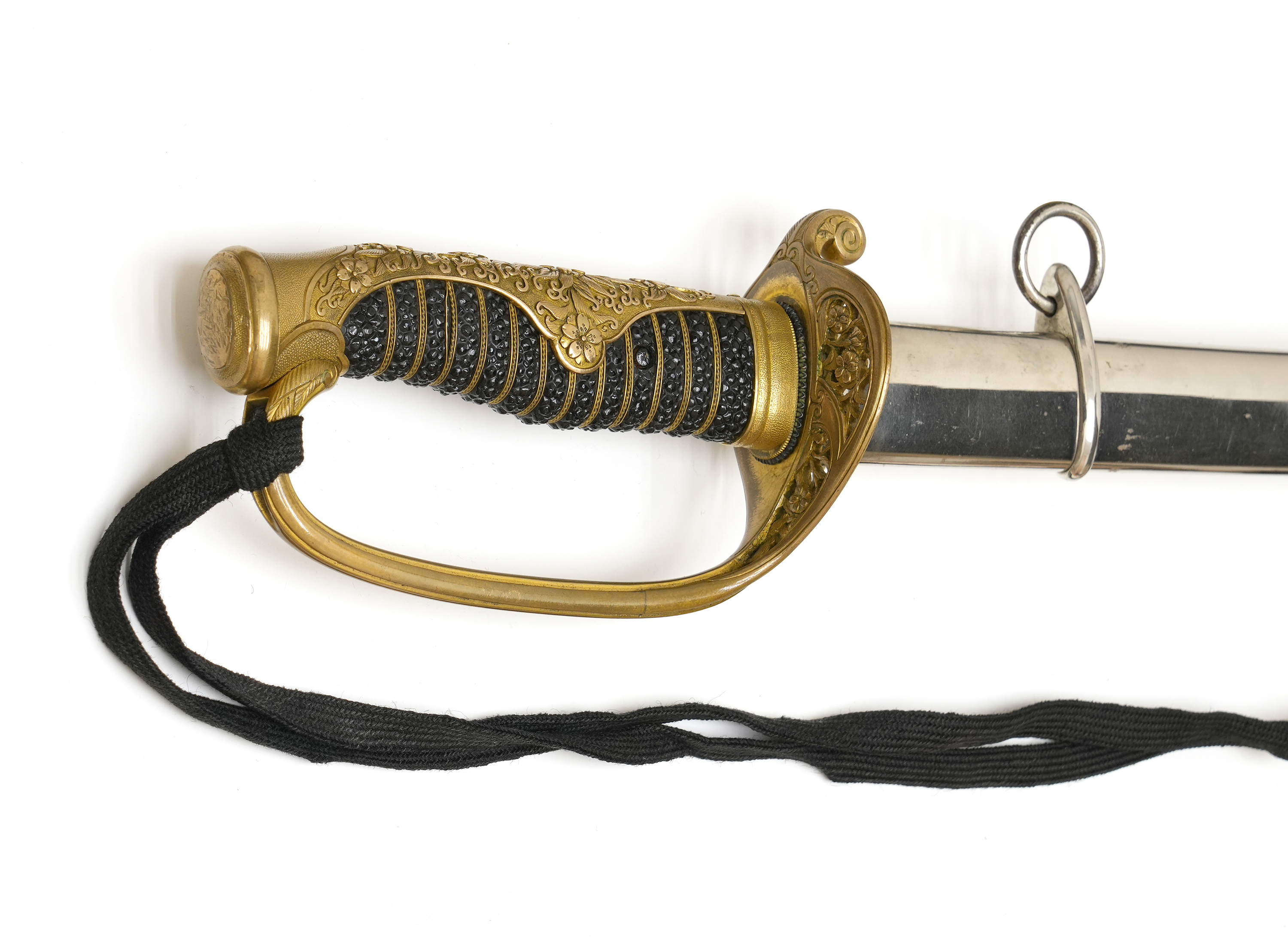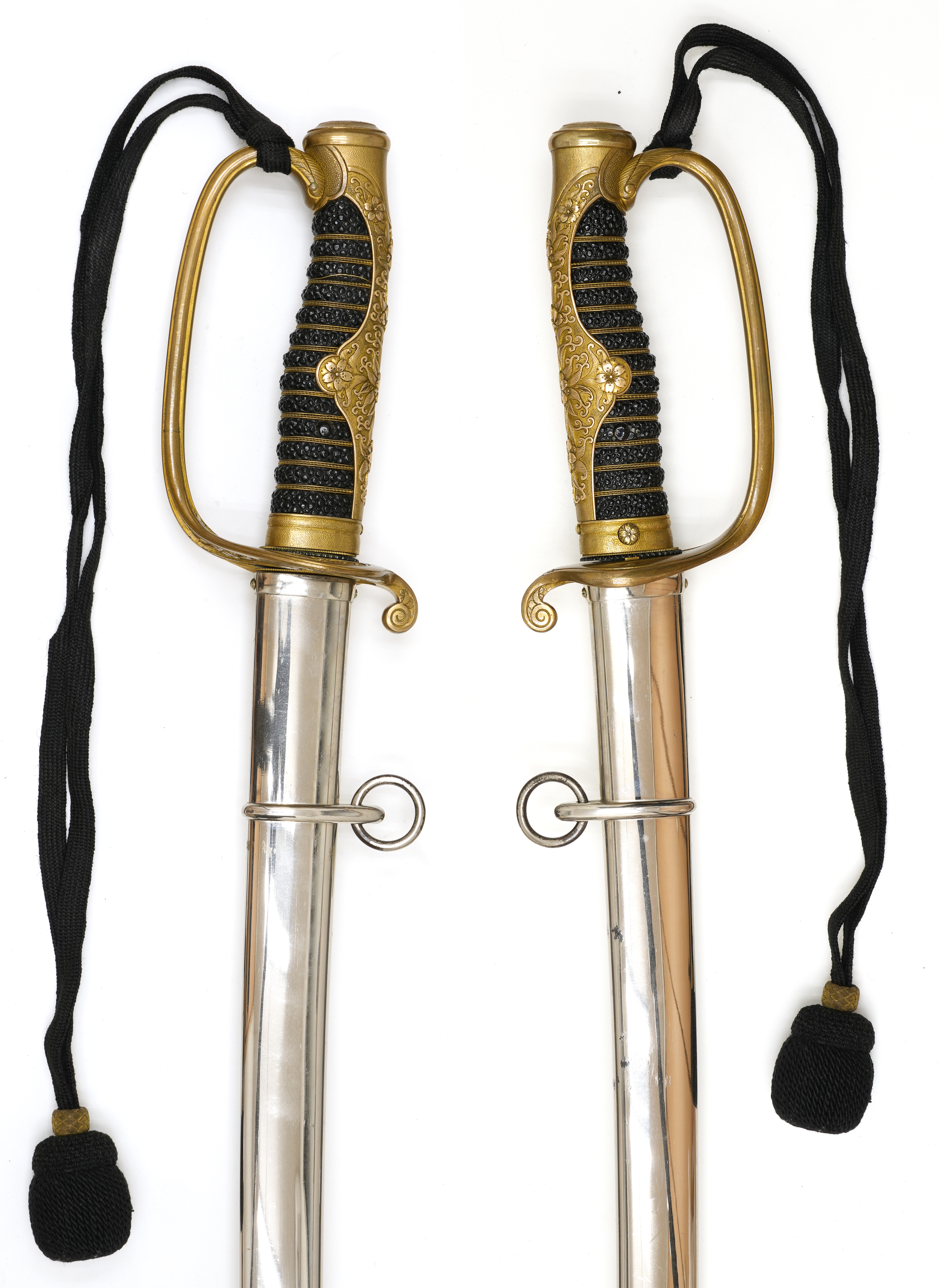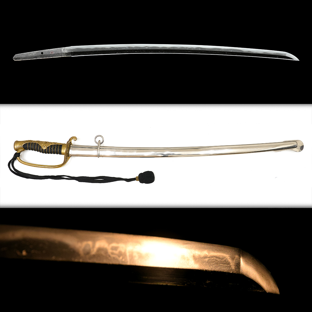 附属の拵は、明治七年制定の陸軍佐官両手用サーベル外装。鐔鳴りと柄の僅かながたつきこそ見られるものの、全体として保存状態は良好で、いまはなき大日本帝国陸軍の威光を静かに伝える、歴史的価値と存在感を兼ね備えた名品といえましょう。