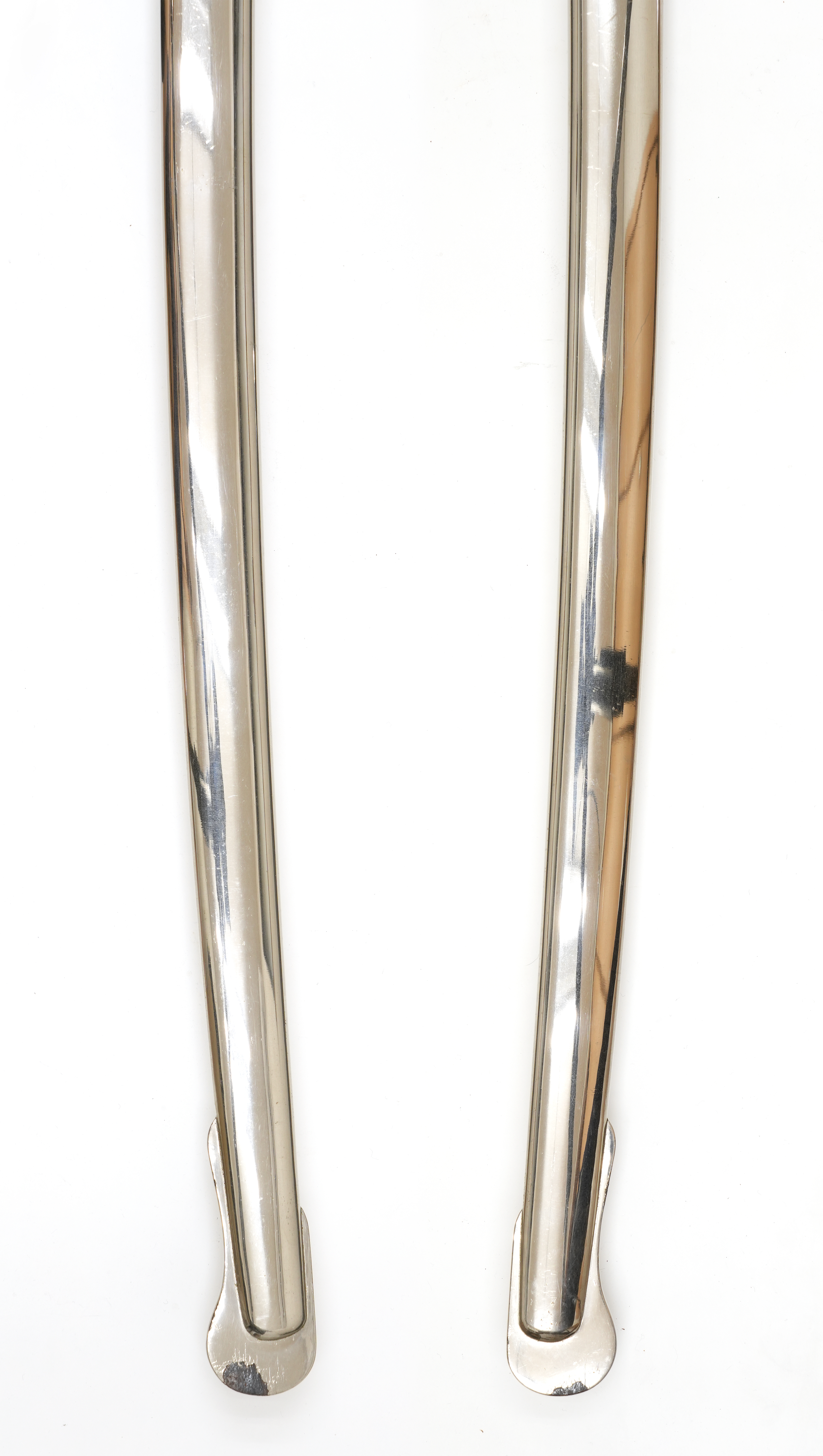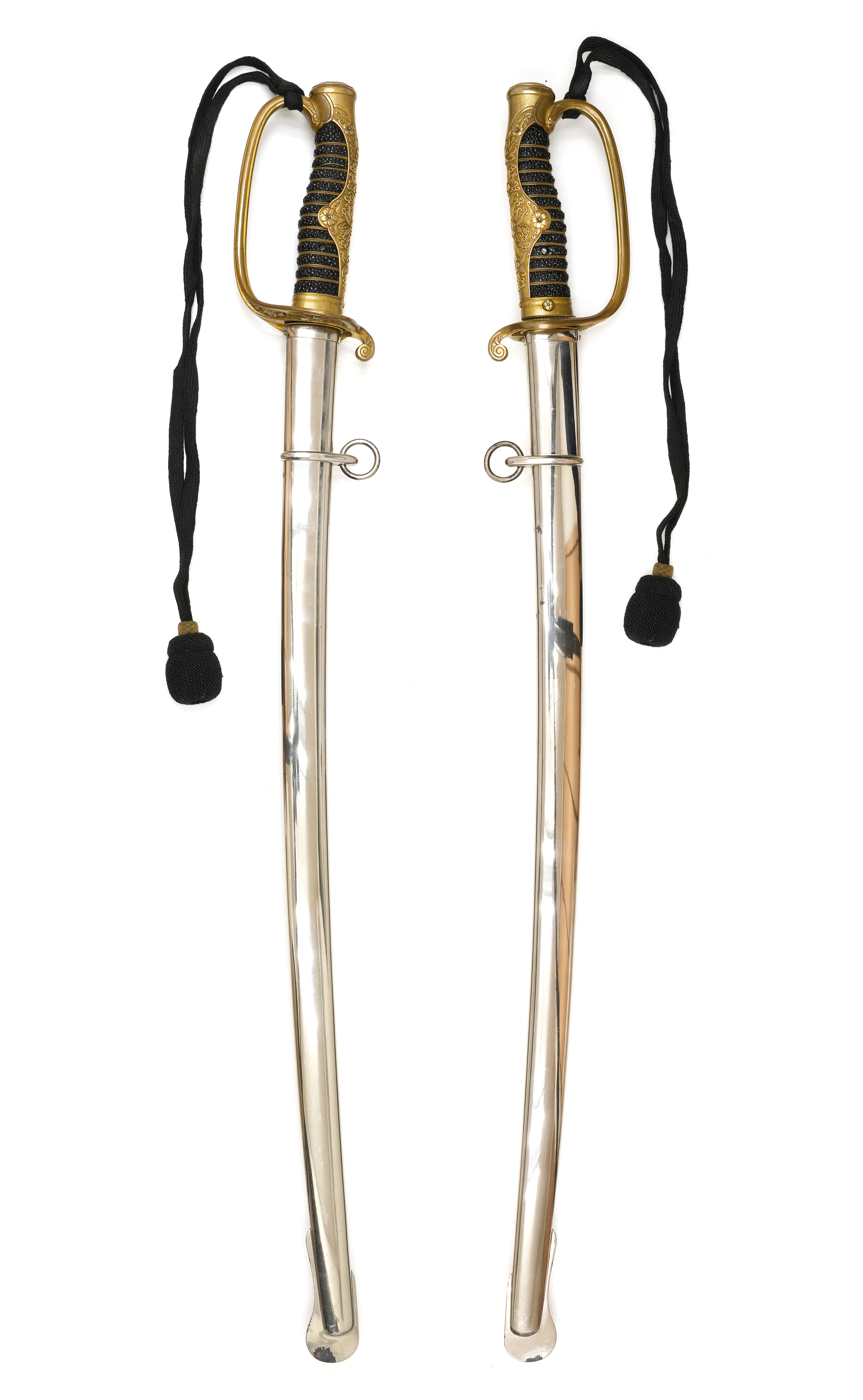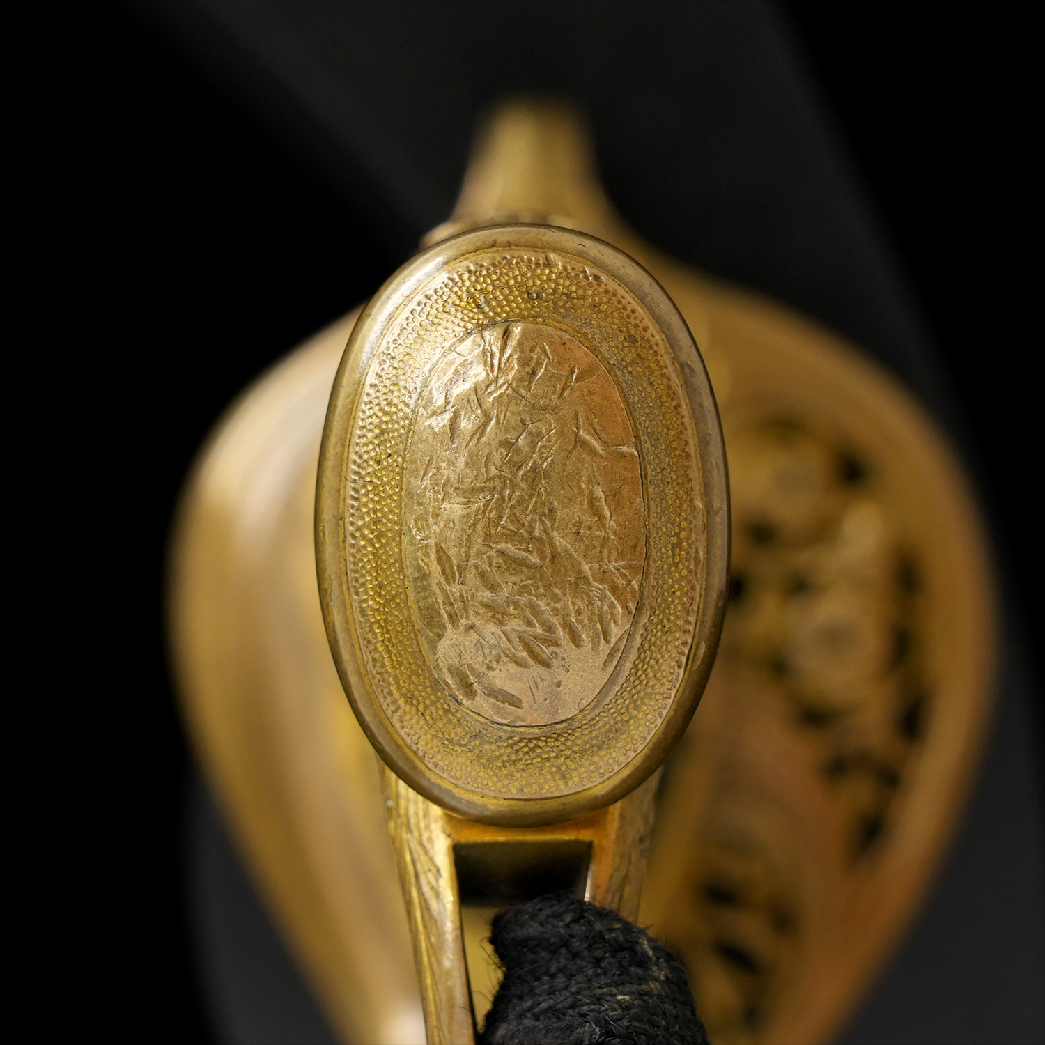 附属の拵は、明治七年制定の陸軍佐官両手用サーベル外装。鐔鳴りと柄の僅かながたつきこそ見られるものの、全体として保存状態は良好で、いまはなき大日本帝国陸軍の威光を静かに伝える、歴史的価値と存在感を兼ね備えた名品といえましょう。