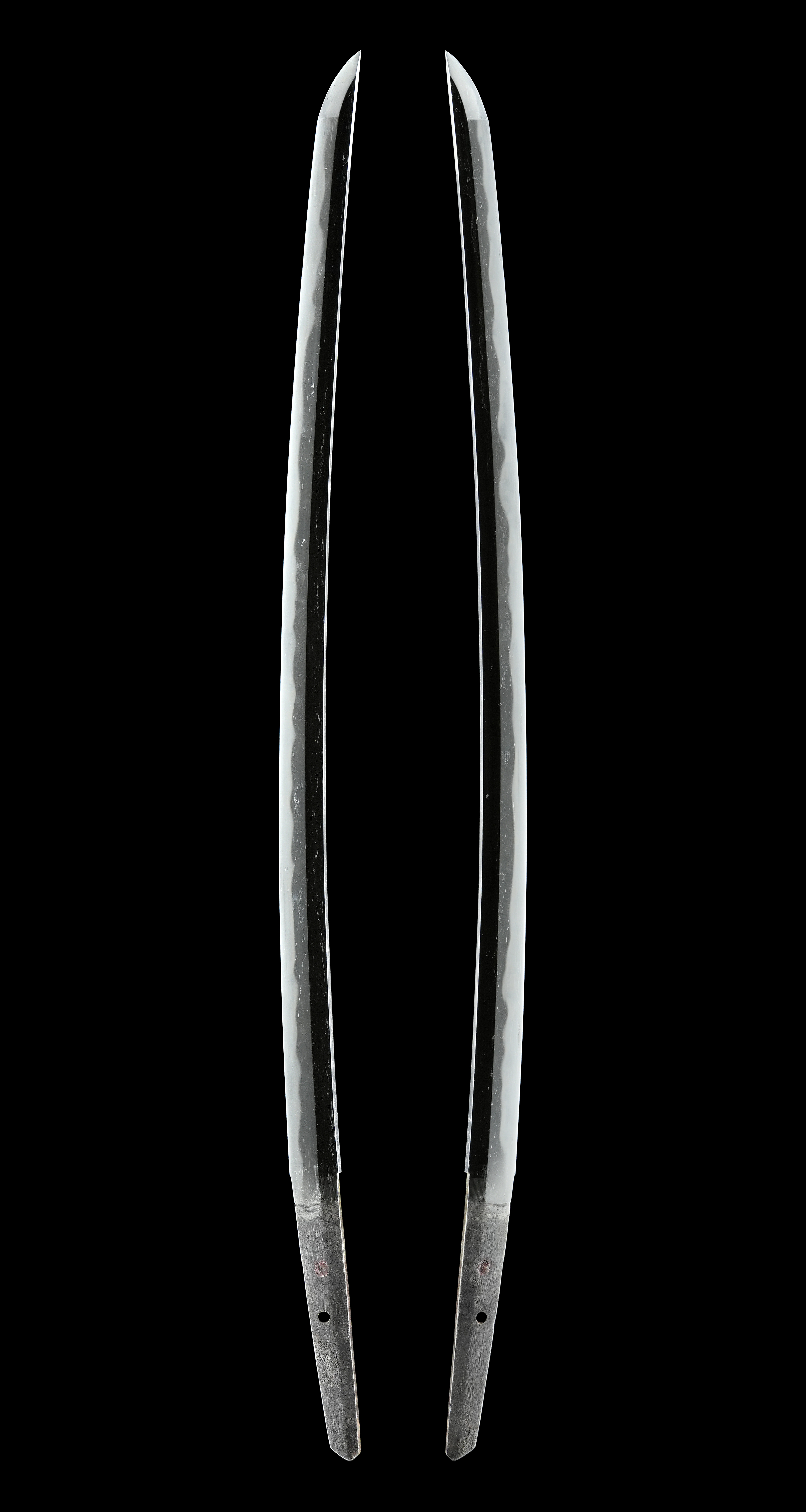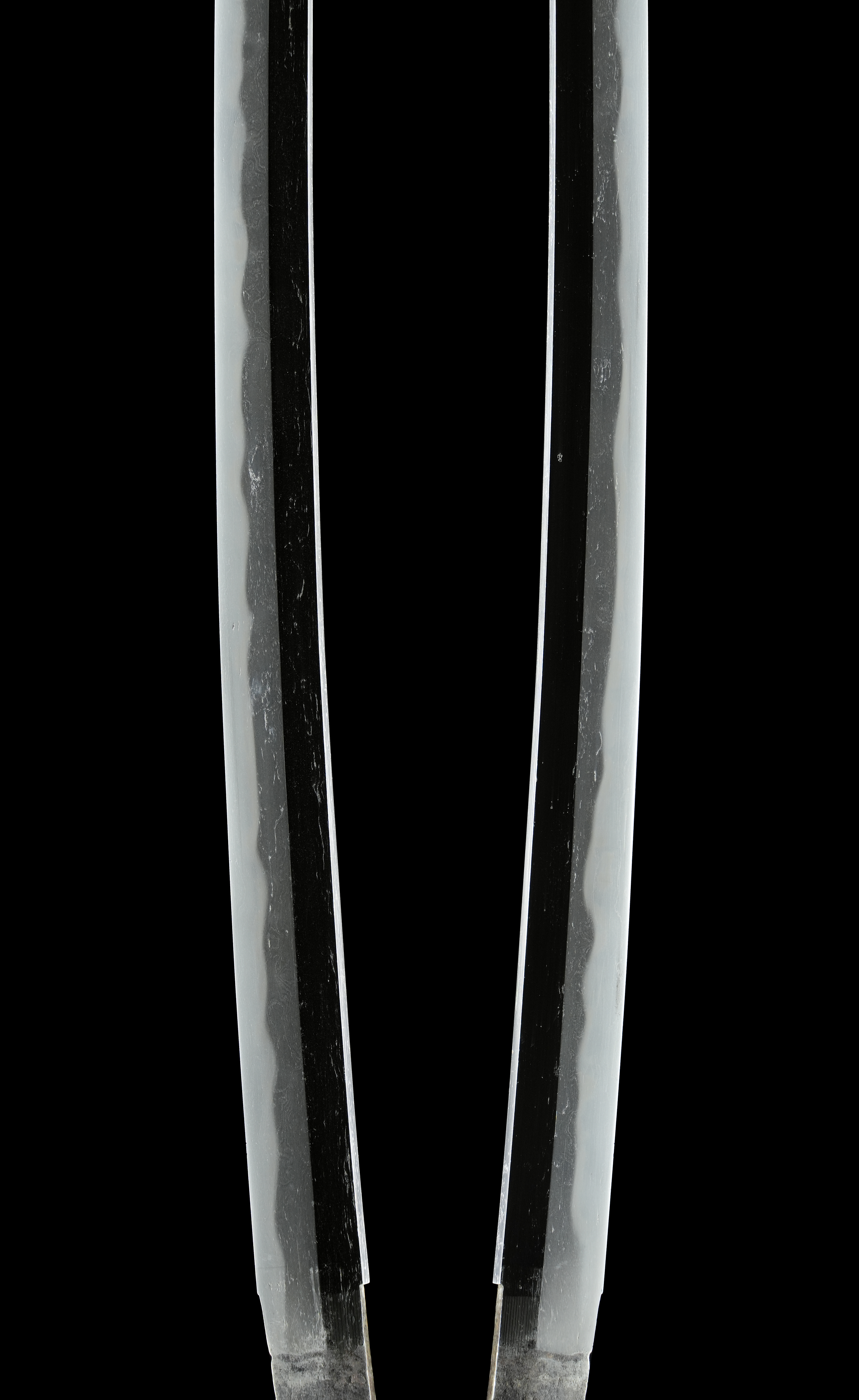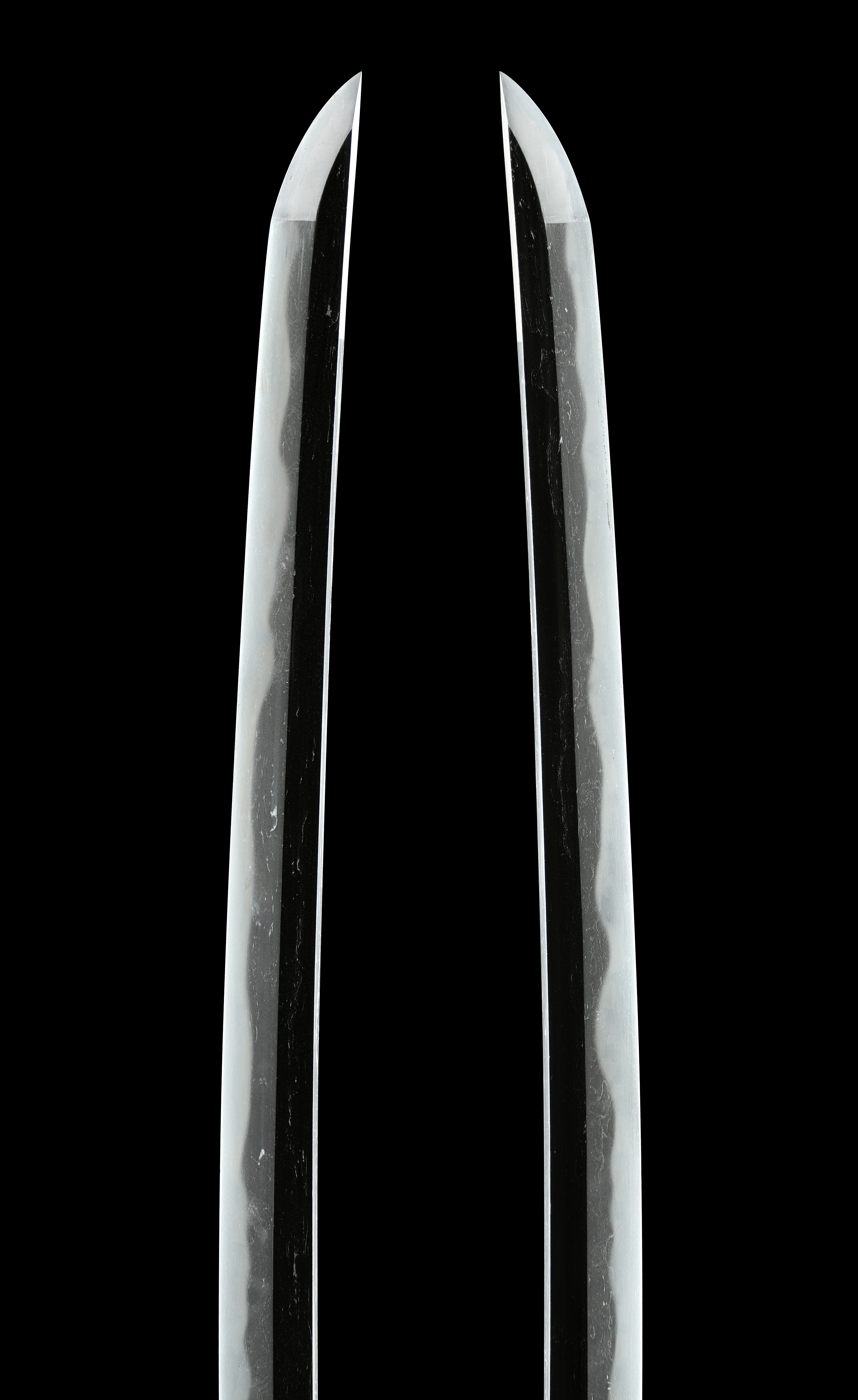 元先の幅差頃好く開き、切先は鋭く延びた堂々たる姿を呈する一振。地鉄は精妙な杢目肌がよく練れて地景を伴い、映りも立つなど、見どころ豊かな肌合いを示しています。刃文は匂口明るく冴え、互ノ目に丁字を交えつつ、ところどころに尖りごころの刃を交えた奔放な趣。刃中には砂流かかり、金筋も随所にあらわれ、刃中の景色はまことに華やかです。鋩子は直ぐに先丸く返る端正な造り。茎は反りを伏せられており、元の反り姿は今よりも深いものであったことがうかがえます。