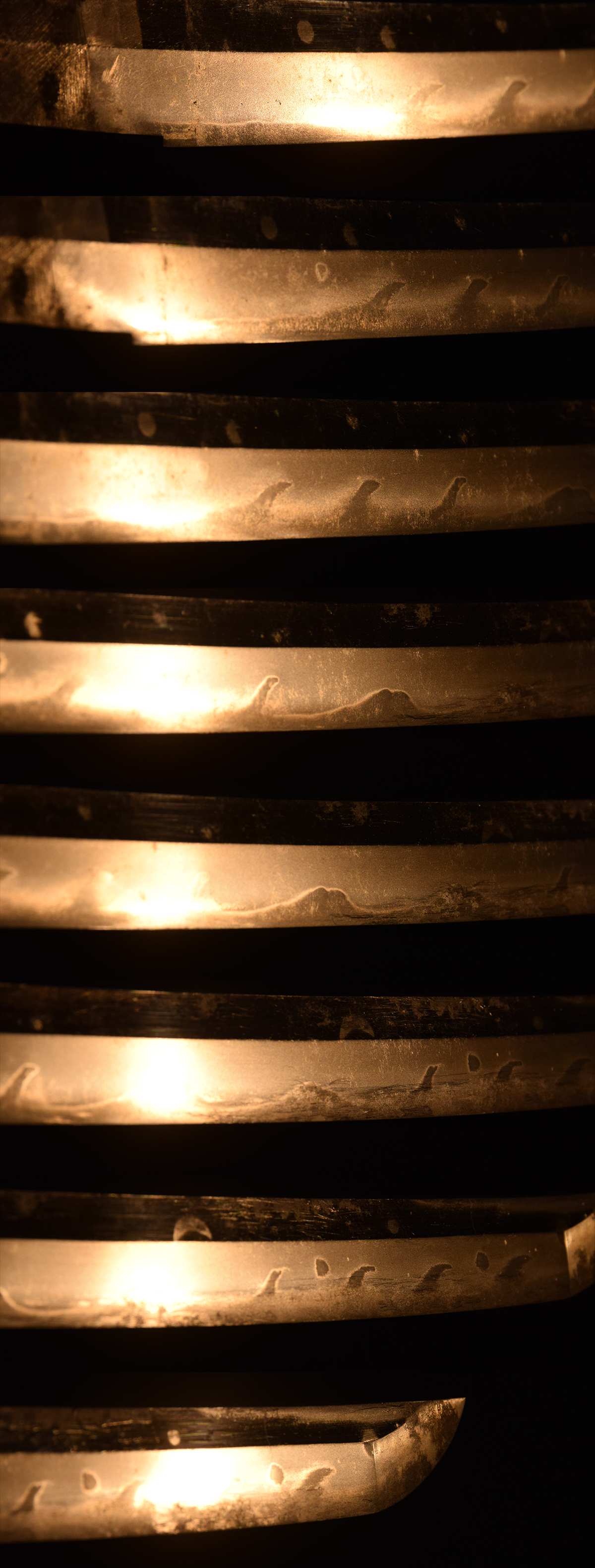 本脇指は、元先の幅差が目立たず、すらりと中切先が延びた端整な姿を備えています。地鉄はよく錬れた杢目が細かく詰み、地沸がしっとりと付く精美な肌合い。静かに眺めていても、鉄の呼吸が伝わってくるような上質な地鉄です。刃文は匂口明るく冴え、濤瀾風の乱れを基調としながらも、助廣らの濤瀾とは一線を画した、斜角を強めた独特の濤瀾を焼き上げています。波頭が勢いよく砕けるように、飛焼が平地から鎬地にまで飛び、匂口がぐっと締まる箇所と、大粒の沸がふわりと広がる箇所が交互に現れることで、まるで打ち寄せる波の飛沫をそのまま刀身に映し取ったかのような、実に趣深い景色を描き出しており、鋩子は直ぐに先丸く、長く焼き下げています。
