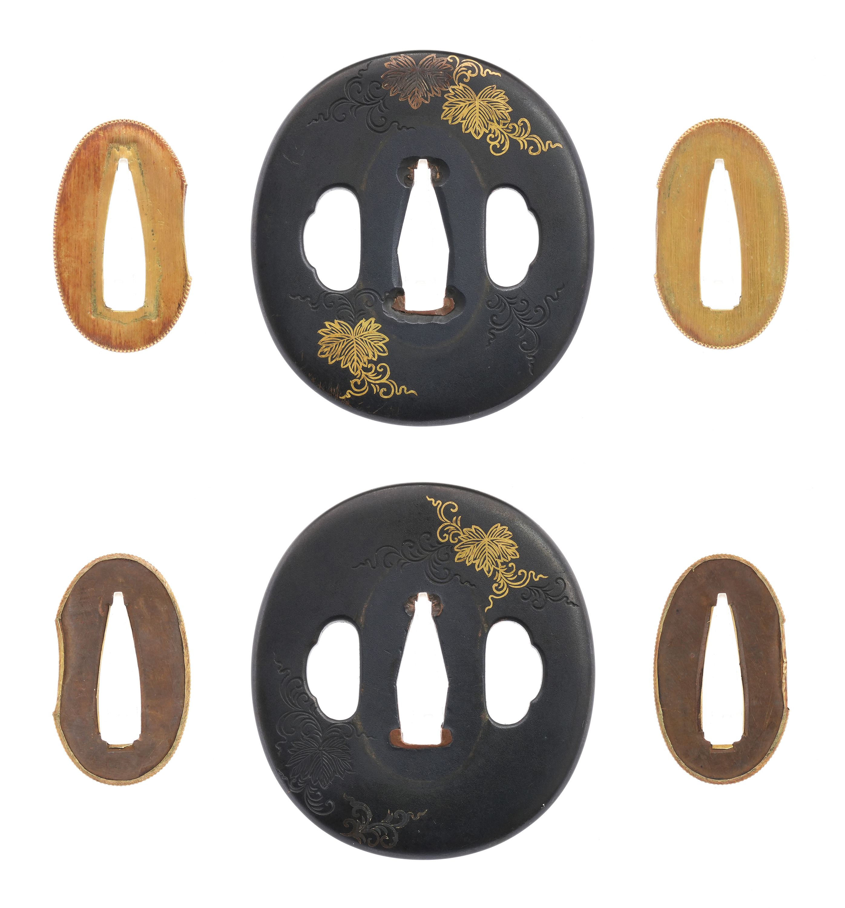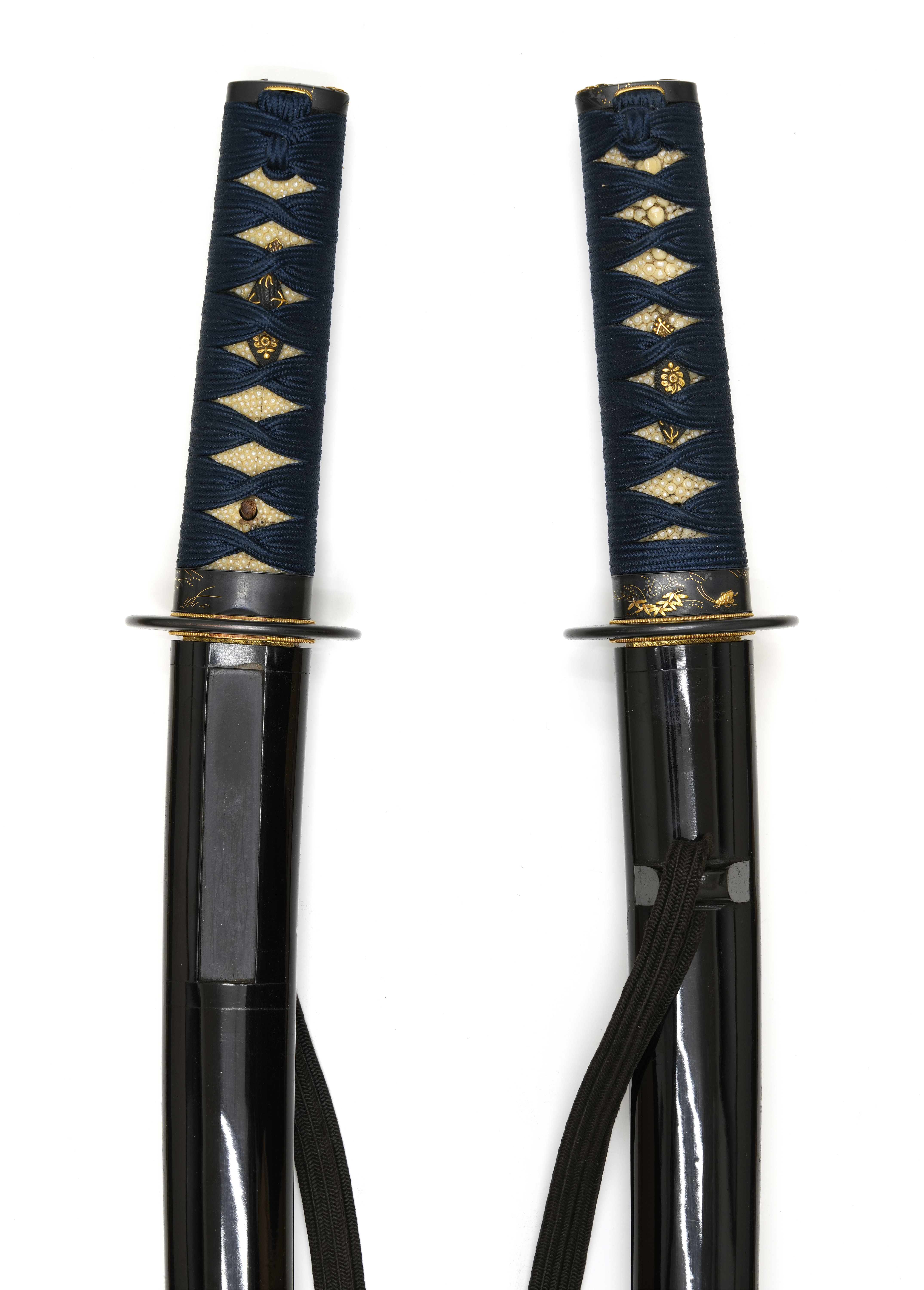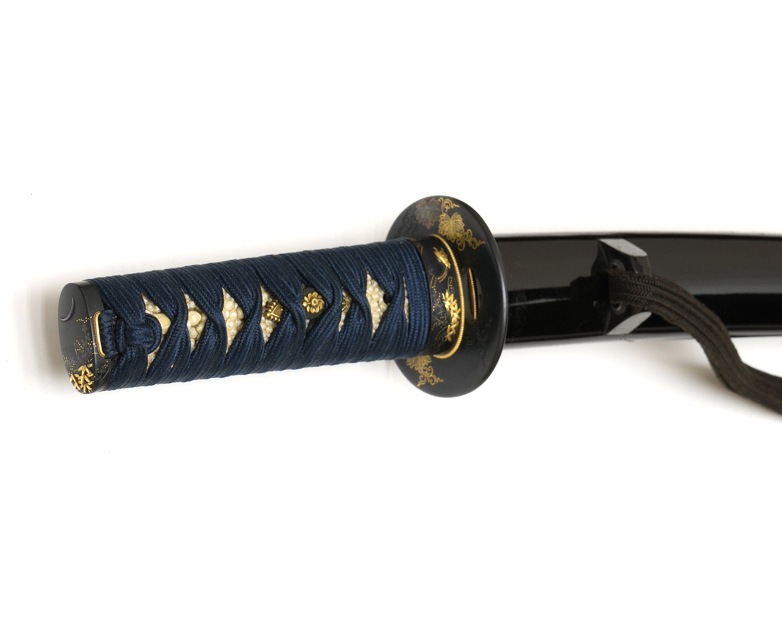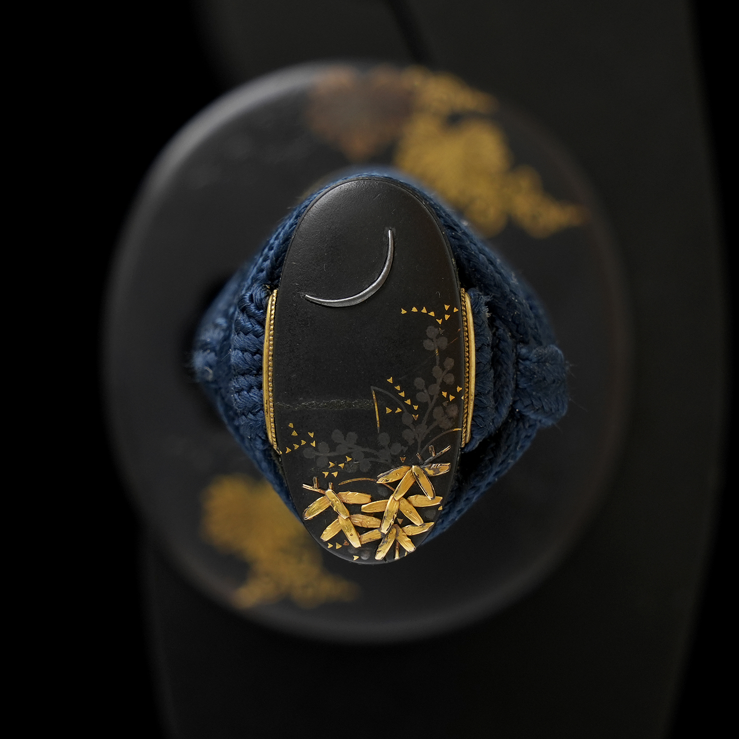 附属の拵は小柄こそ欠失しておりますが、切羽のすり替えが一切見られない“完全なうぶの状態”で残っている点は極めて貴重です。はばき・切羽に施された金も純度が高いようで、一般的なものより重みがあり、発色も上質。縁頭の意匠に合わせ、秋草図の小柄を添えていただくことで拵全体の調和もさらに整います。ぜひ拵にも鑑定書を付け、末永くご愛蔵いただきたい逸品です。