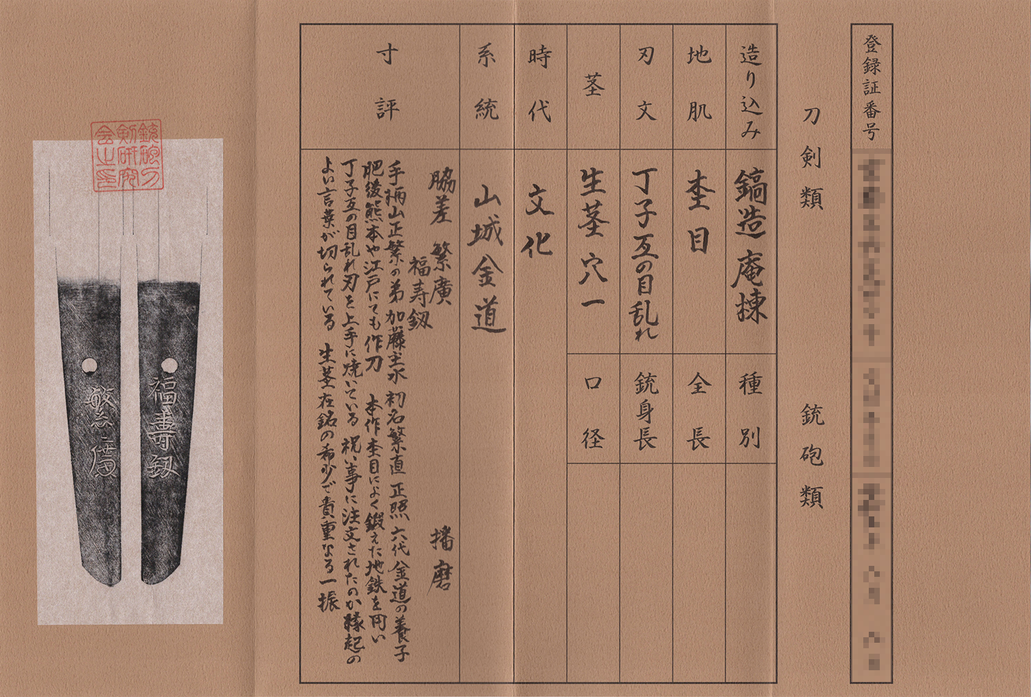 附属 銃砲刀剣研究会鑑定書、黒蝋塗鞘脇指拵、素銅地金着二重はばき