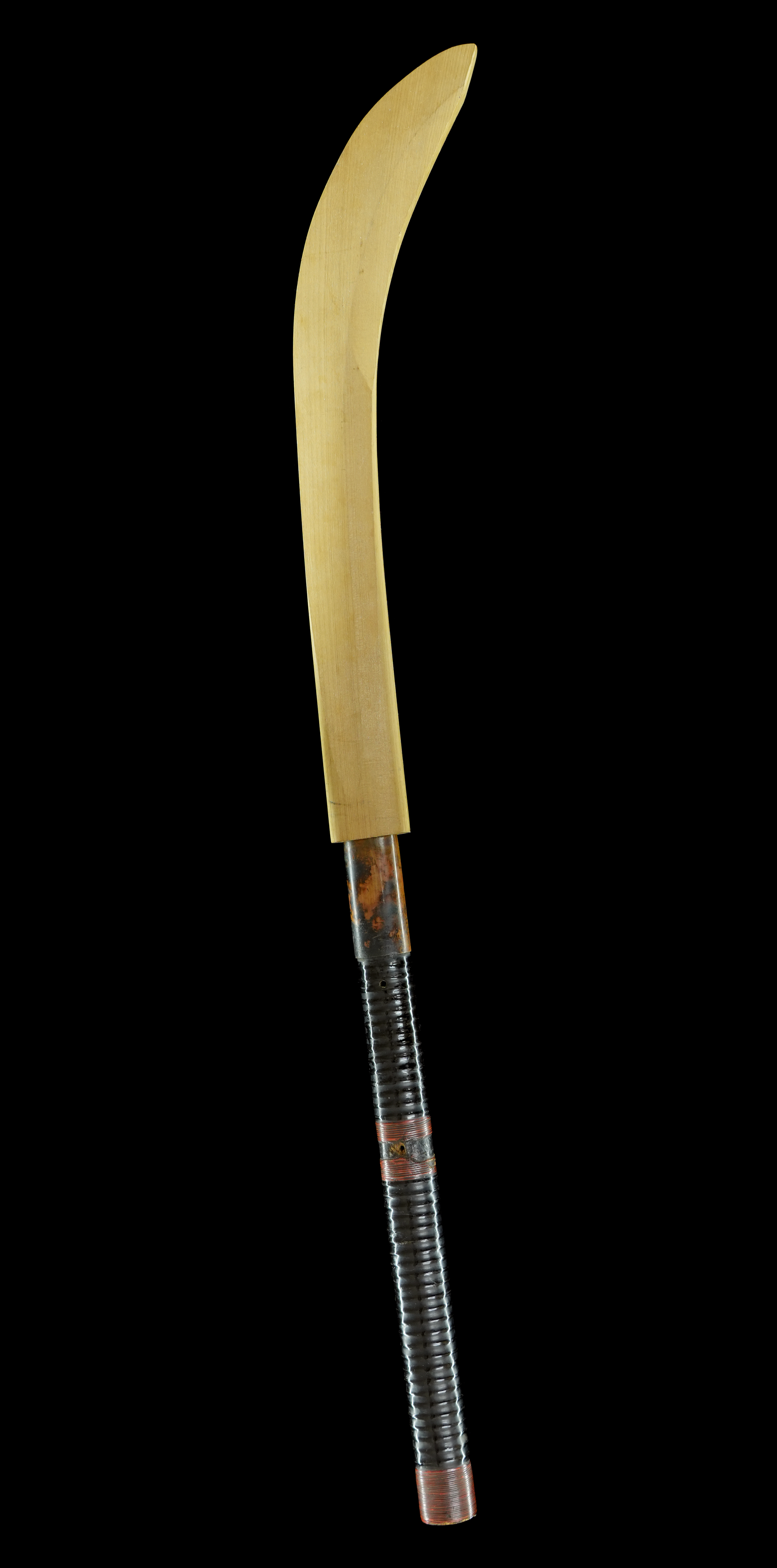 切断されたことこそ惜しまれるものの、拵柄の残欠が附属しております。白鞘絡繰仕掛が施された非常に手の込んだ造りで、刀身を引き抜くと白鞘の棟側が開き、納めると自動的に閉じる趣向になっています。刀身に余計な空気を当てぬよう工夫された鞘師の智慧が窺え、何とも興味深く面白い逸品です。
