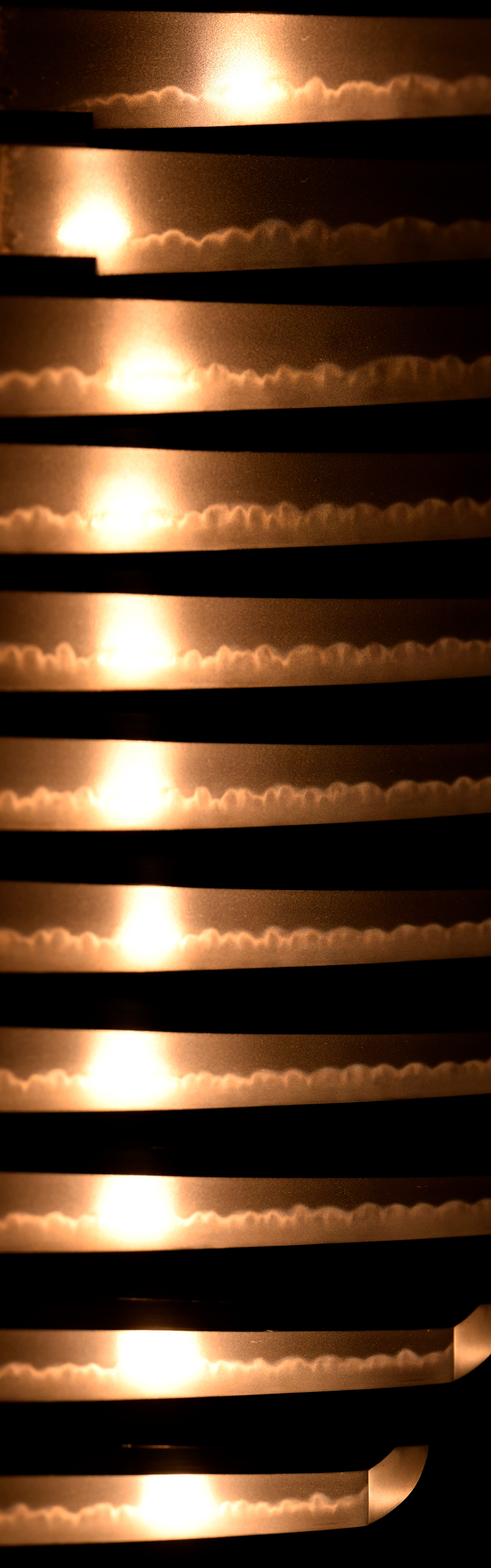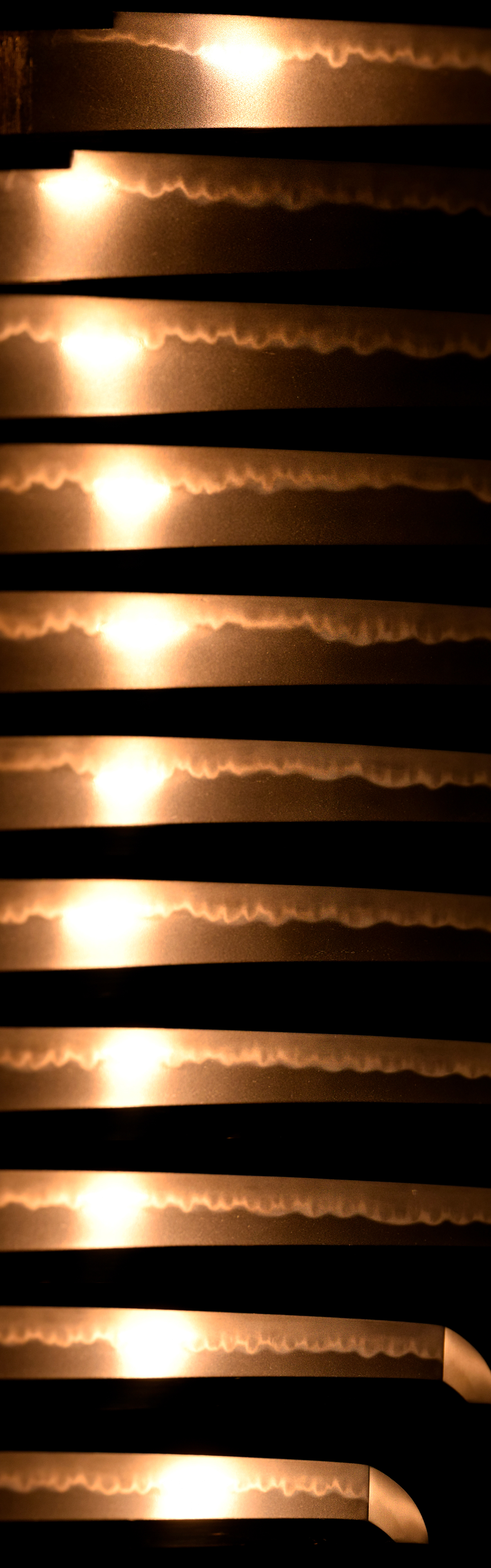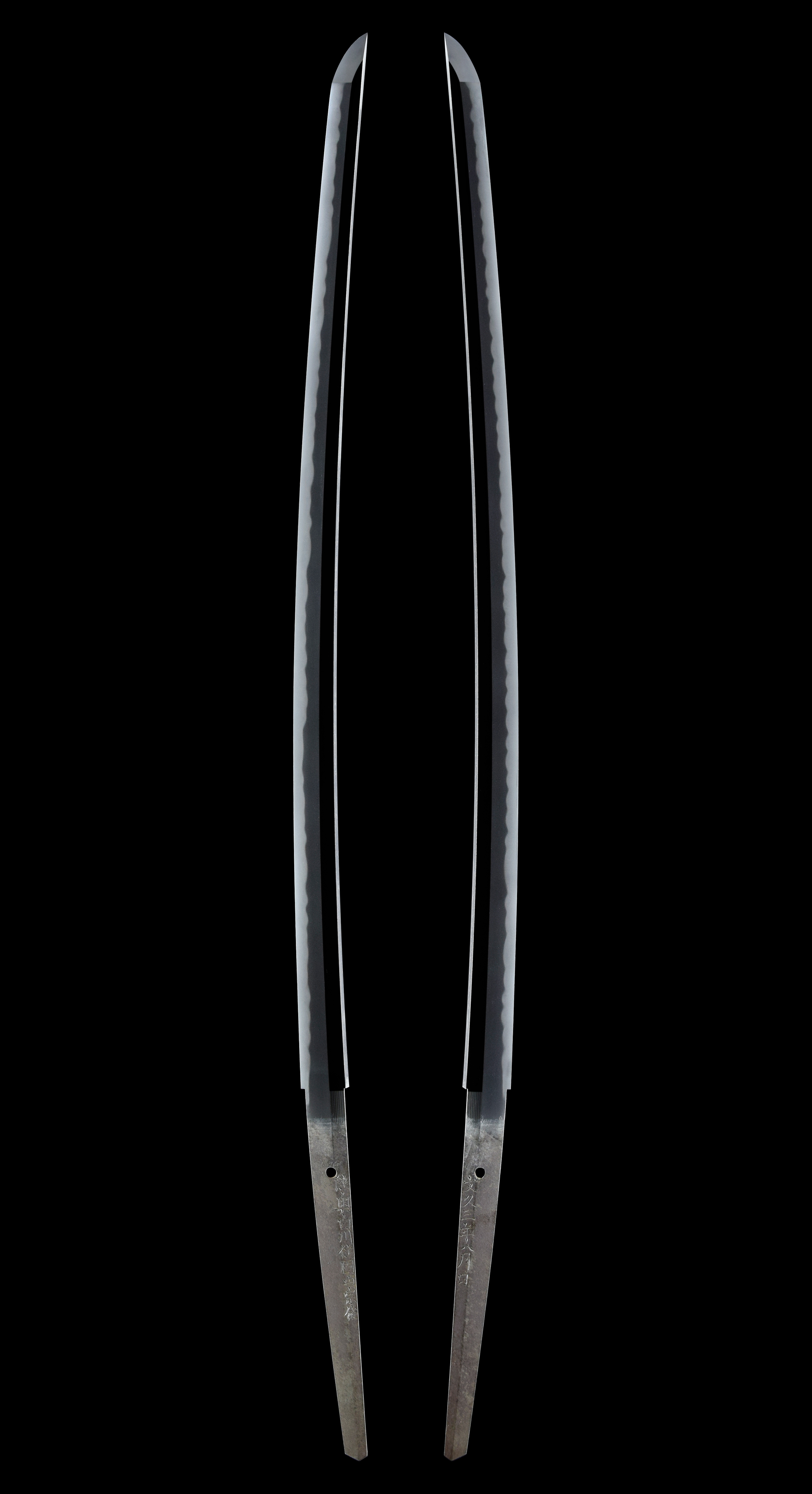 作風は、茎の仕立や銘振りなど、全てが宗次の刀に似ており、小板目がよく詰んだ綺麗な地鉄に、刃文は互の目丁子を焼き、やや小沸が付くのが特徴です。 この刀は元先の幅差が頃好く開き、切先やや延びごころ。反りやや浅目で茎は長く、重ね厚く頑丈な造り込み。地鉄は固山宗次によく似て小板目肌よく練れて地沸が付き、地景細かに入って精美なることこの上無し。刃文は互の目で焼き出し、明るく冴え、匂口は締りごころながらもふわりとした柔らかさを感じさせ、刃中には足が頻りに入り、帽子は横手で互ノ目を焼き込み、焼きたっぷりと、直ぐに先丸く返る。
