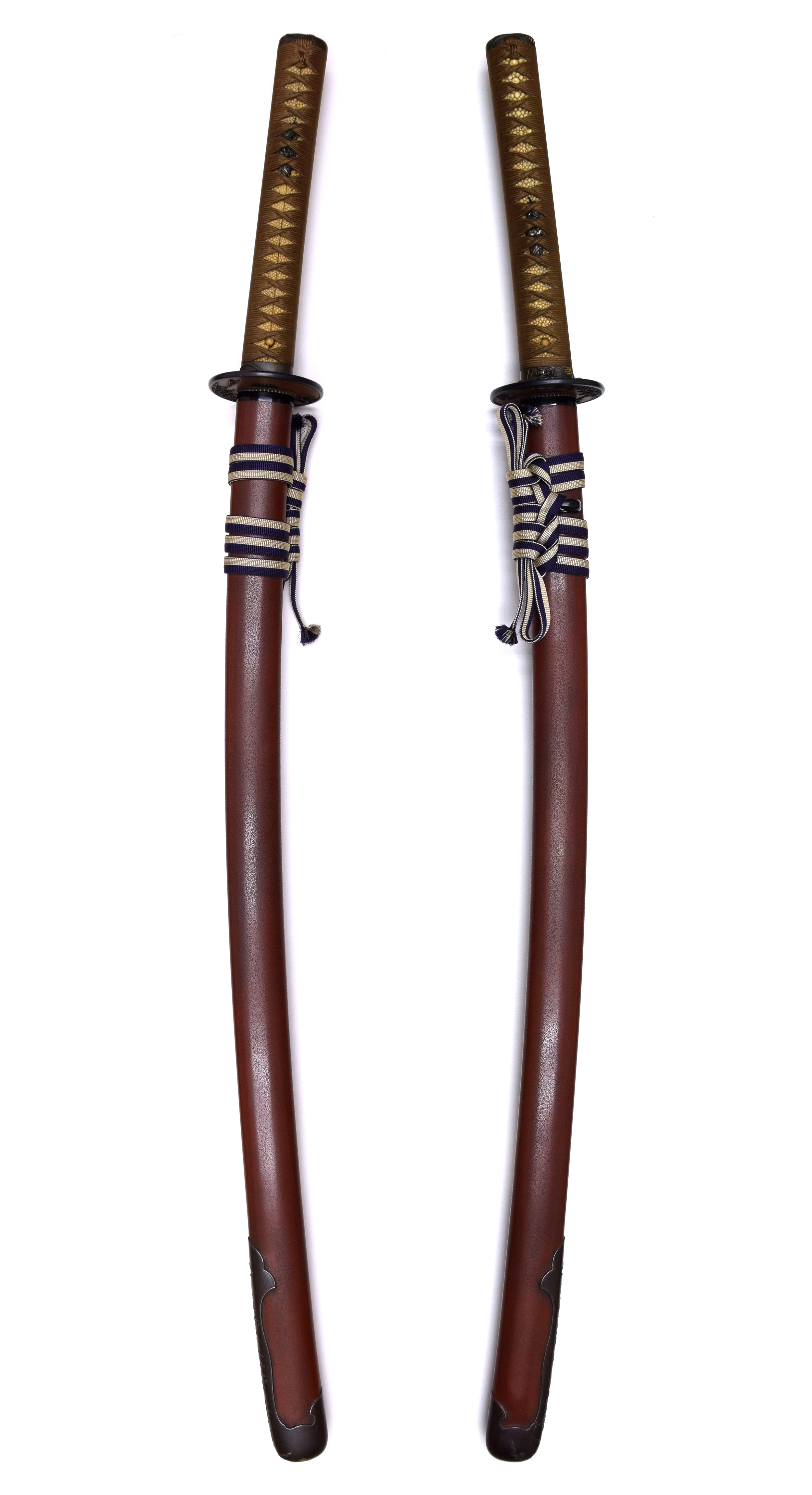 附属 特別保存刀剣鑑定書、日本美術刀剣倶楽部鑑定書、赤茶石目変塗鞘打刀拵、素銅地金着はばき、白鞘、継木