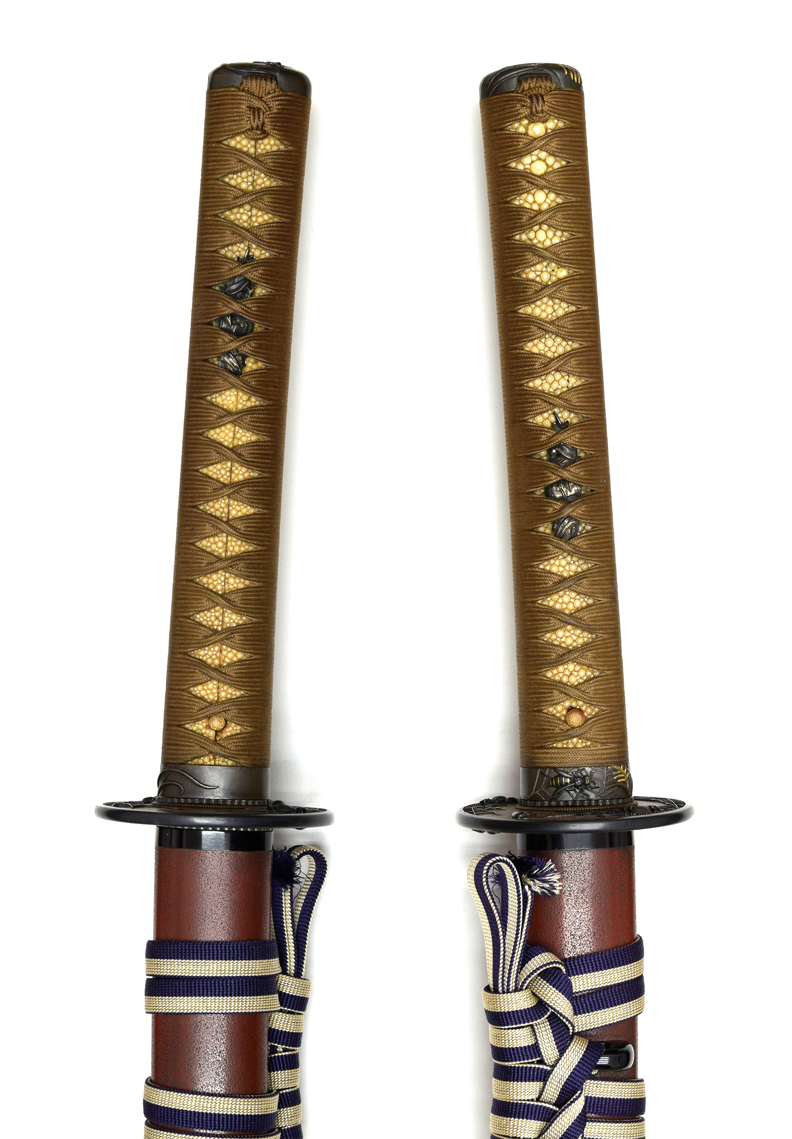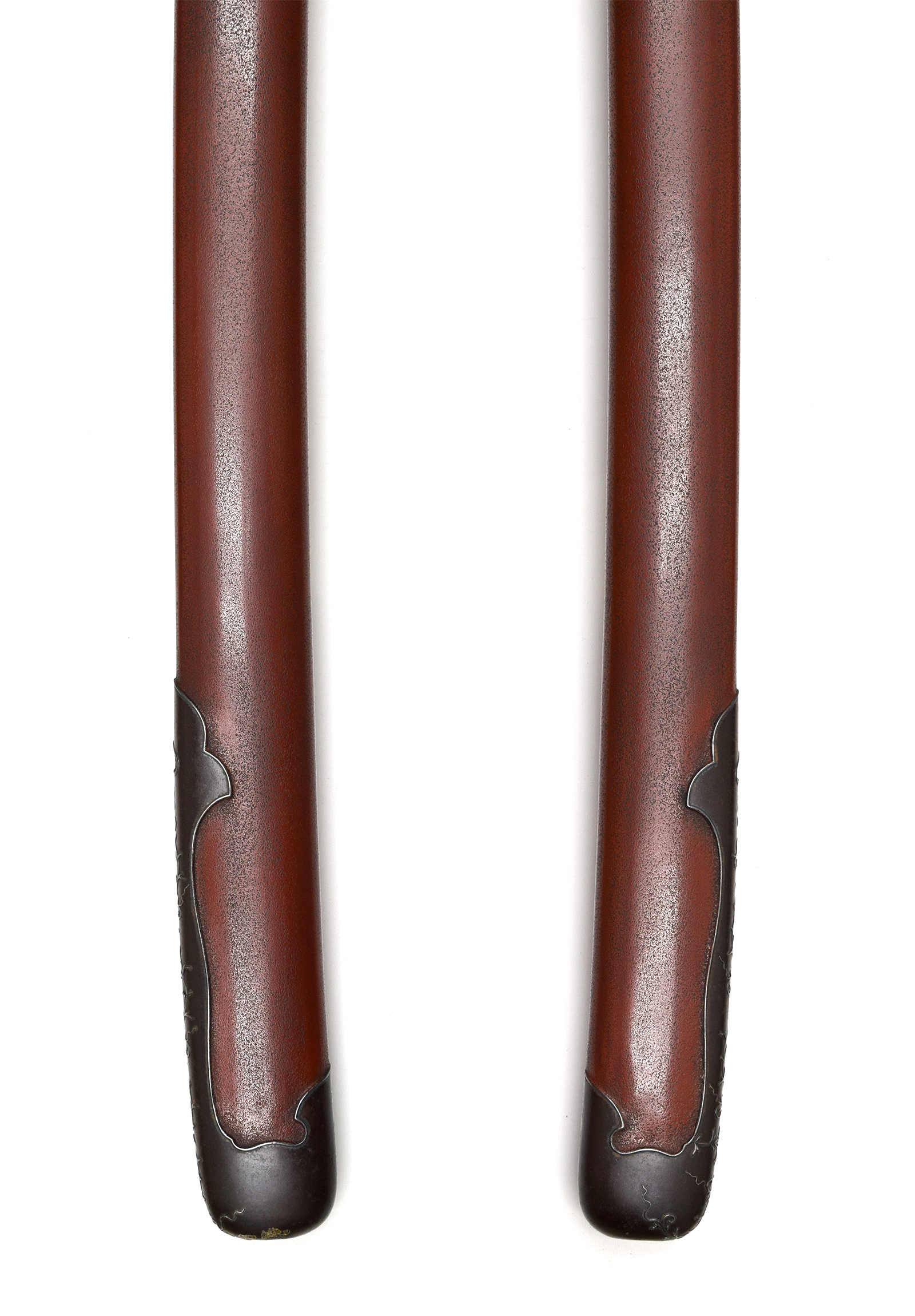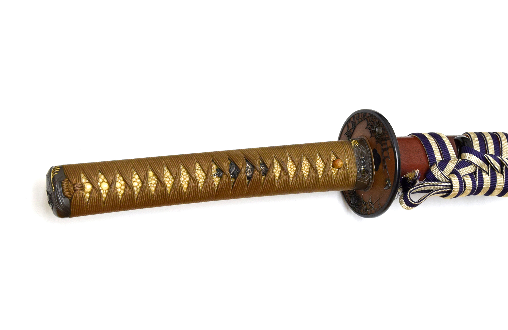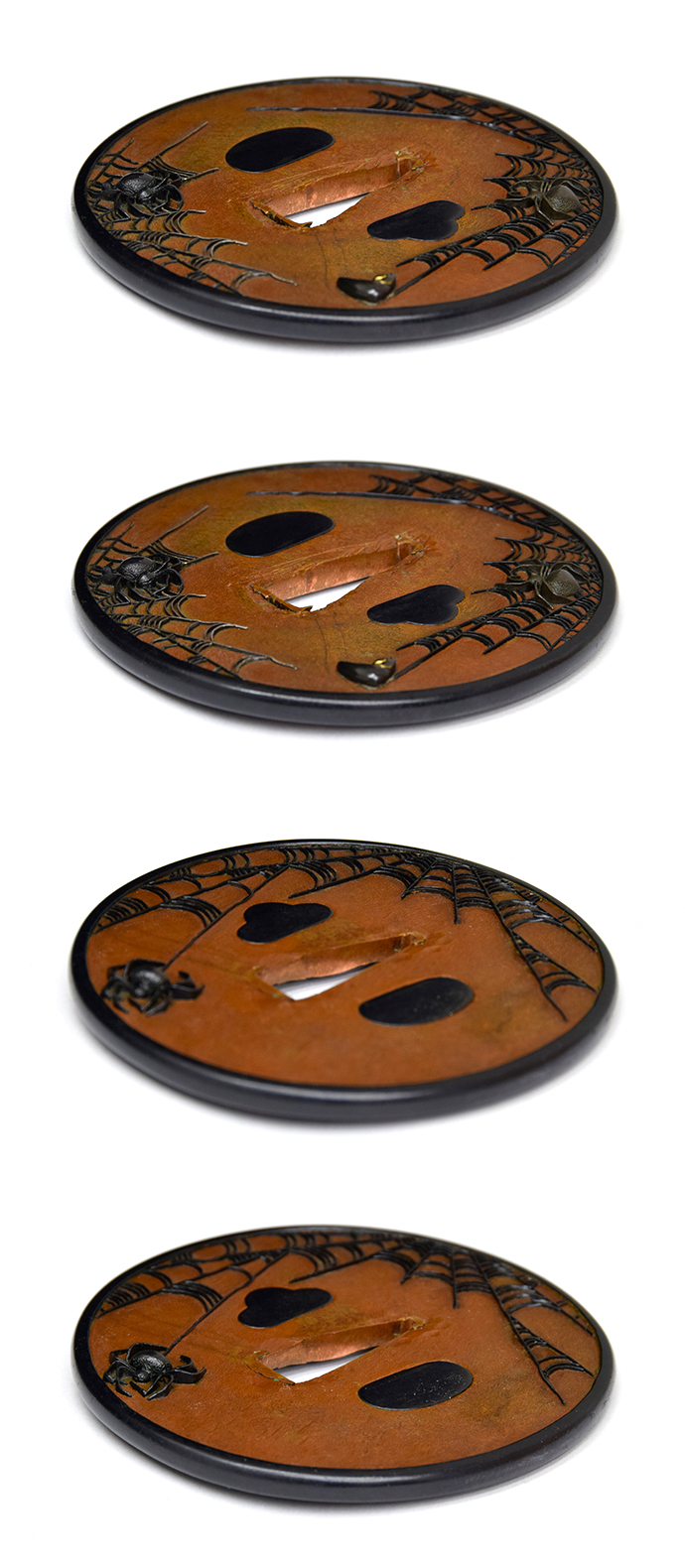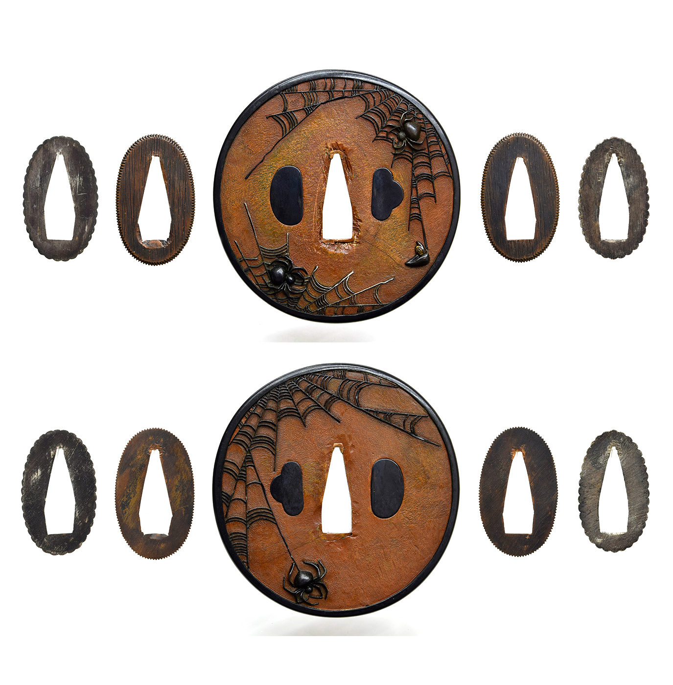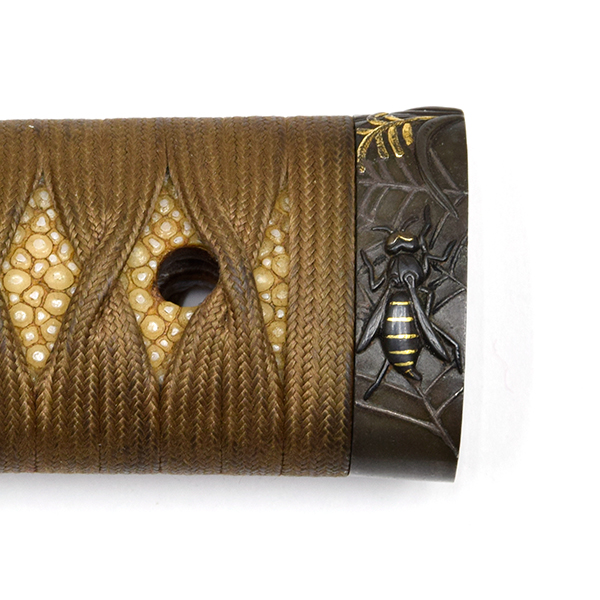 附属の拵は、長年大切に扱われてきたことが一目で伝わるほど保存状態が極めて良好です。特に存在感のある大振りの鐺と、蜘蛛の巣を題材に精緻に意匠された金具は、観る者の視線を強く惹きつけ、印象に深く残ります。さらに、切羽一枚に至るまで後補やすり替えの痕跡は見られず、本刀と共に正しく伝来してきたことを物語る、誠に希少価値の高い逸品です。