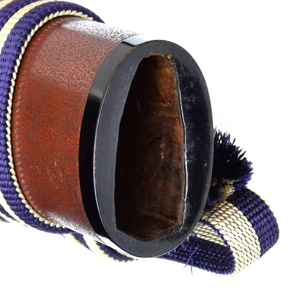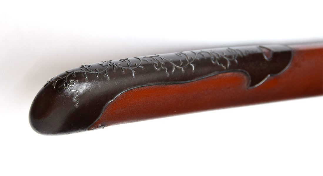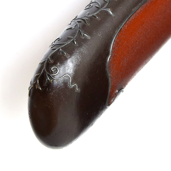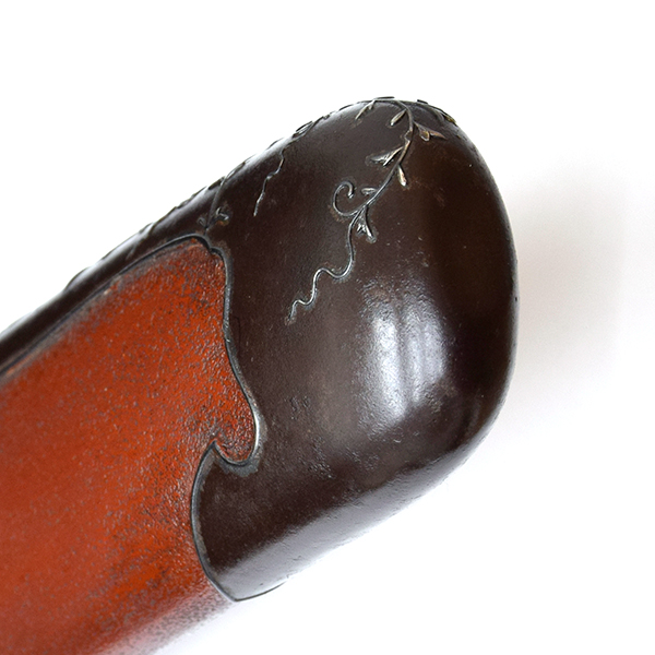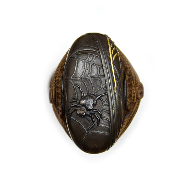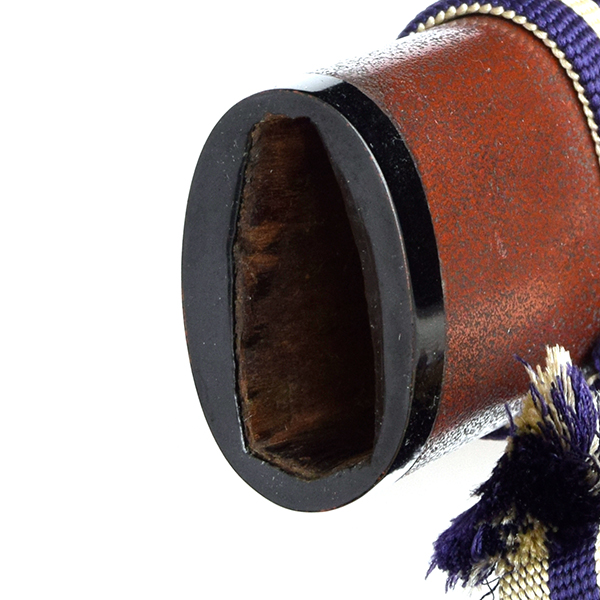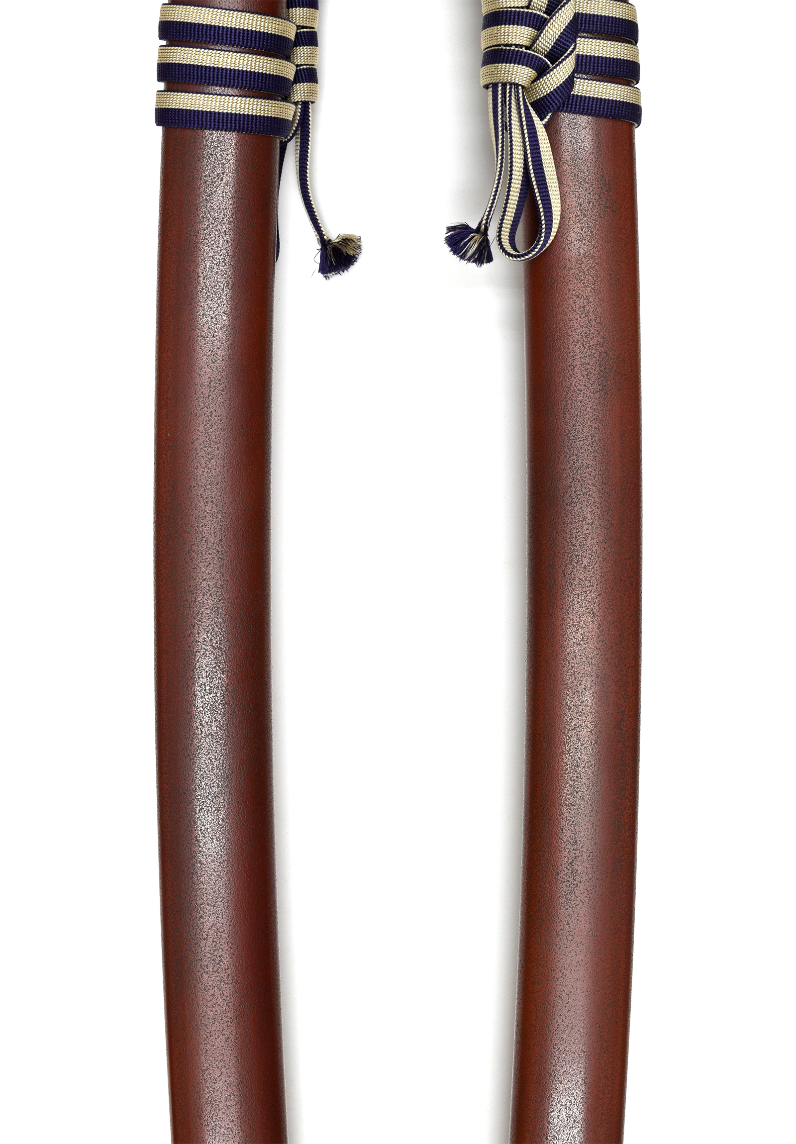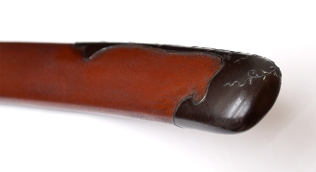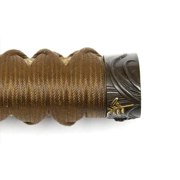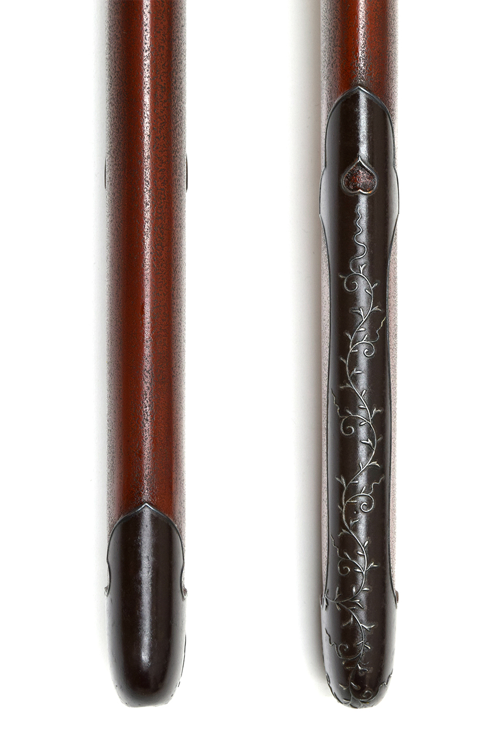 附属の拵は、長年大切に扱われてきたことが一目で伝わるほど保存状態が極めて良好です。特に存在感のある大振りの鐺と、蜘蛛の巣を題材に精緻に意匠された金具は、観る者の視線を強く惹きつけ、印象に深く残ります。さらに、切羽一枚に至るまで後補やすり替えの痕跡は見られず、本刀と共に正しく伝来してきたことを物語る、誠に希少価値の高い逸品です。