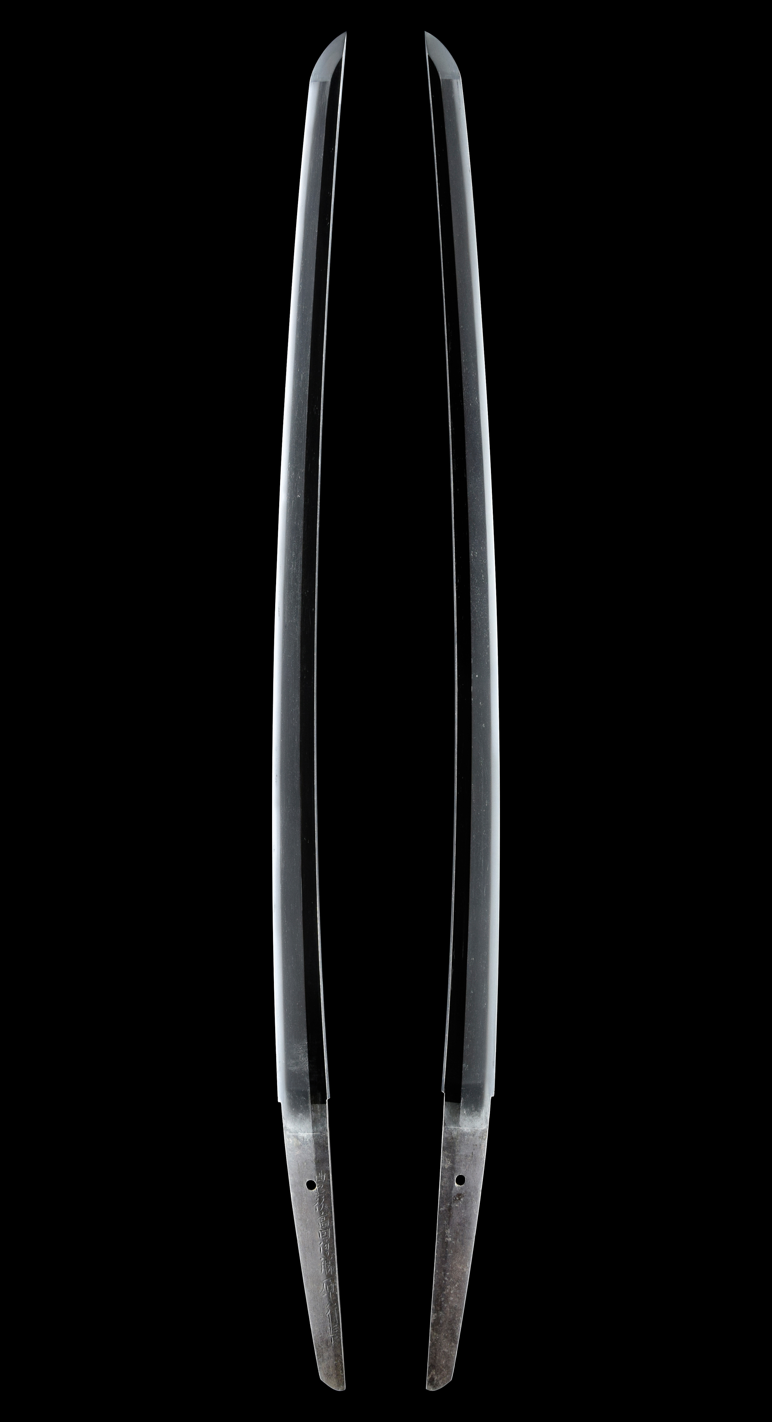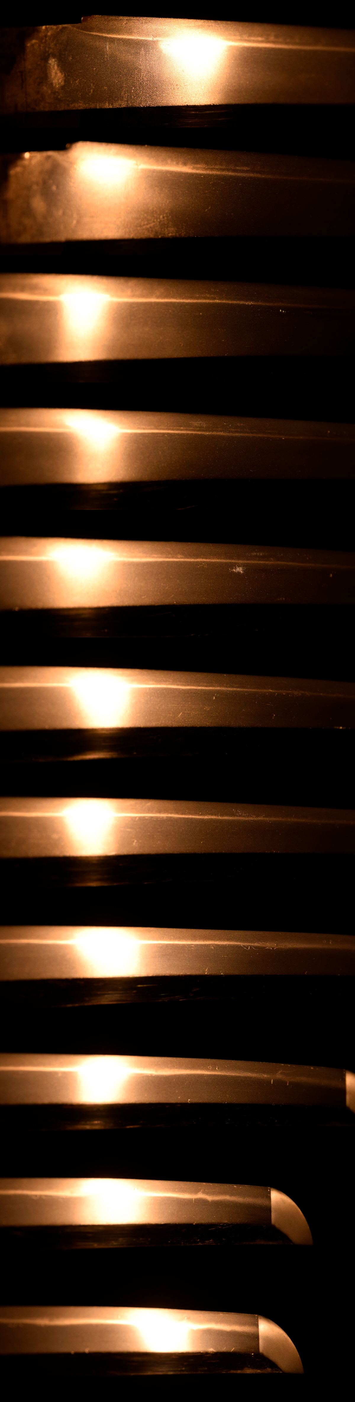 この刀は元先の幅差開き反り浅めの寛文新刀体配。現状では長いヒケがやや目立ちますが、地刃の鑑賞に支障は無く、地鉄は小板目よく練れて詰んで精美。刃文は匂口明るく冴えた中直刃仕立てで、刃縁の内側に糸を添わせたが如き真っ直ぐな金筋が随所に見られ、砂流かかる箇所も看取出来、行長の直刃の完成度の高さを知らしめる作品です。