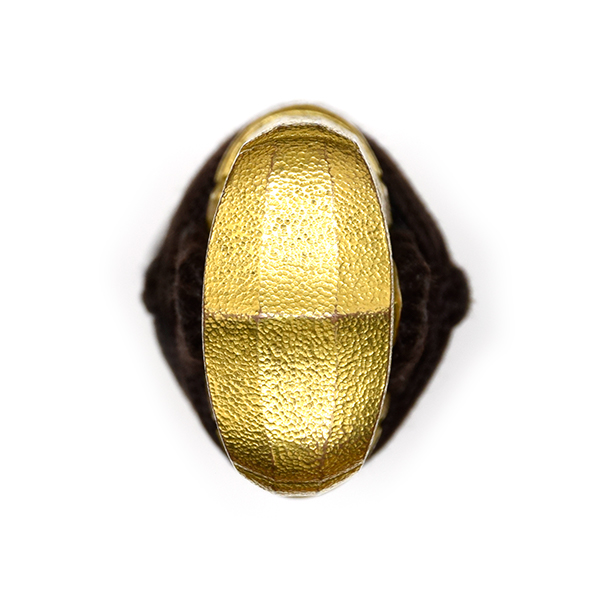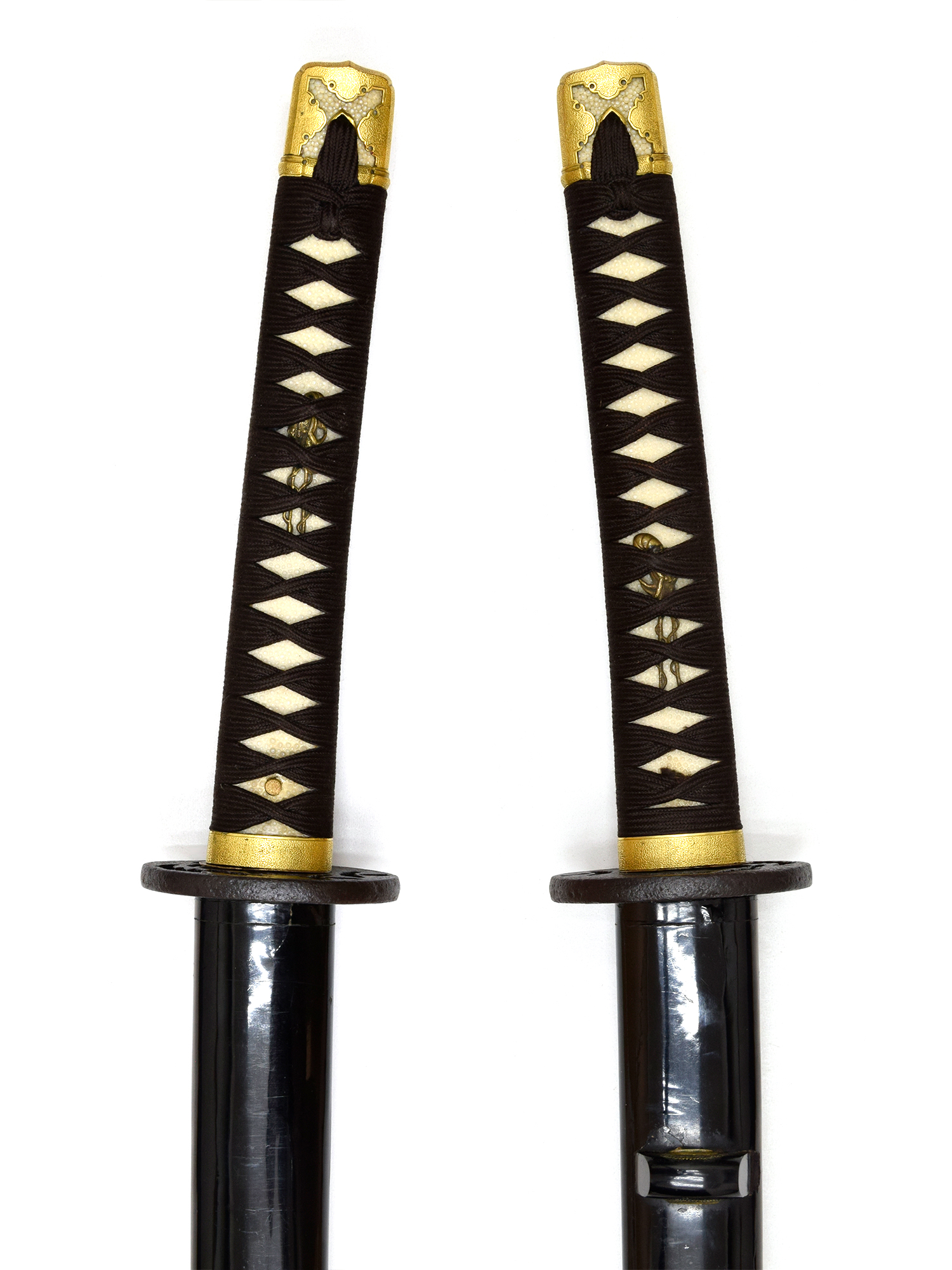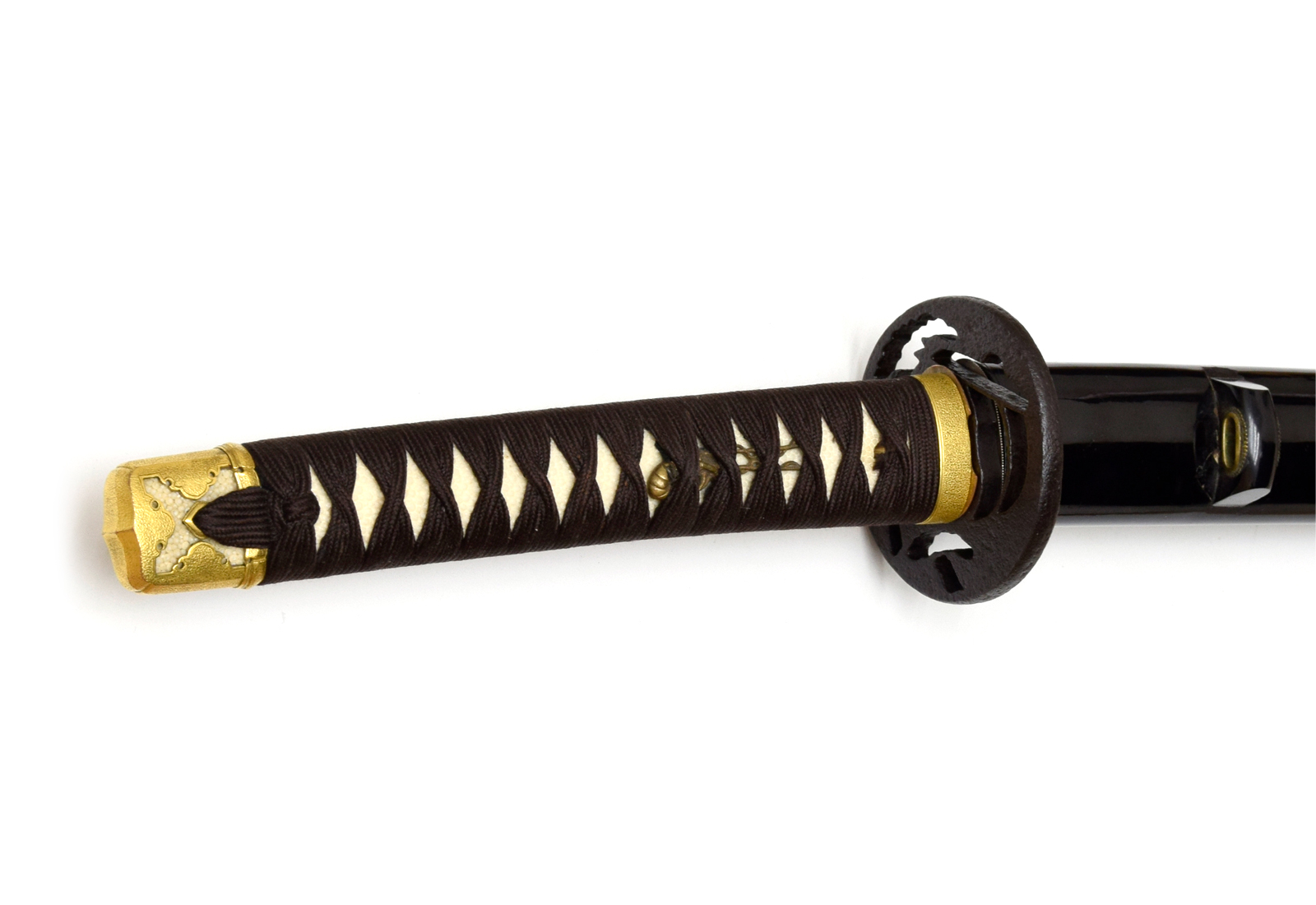 もとよりバランスが良い一刀ですが、拵に厚く重い鐔が添えられているため、更に手元重心となってバランスが頗る良く、扱い勝手の良さを感じさせます。金色に輝く縁頭も印象的です。