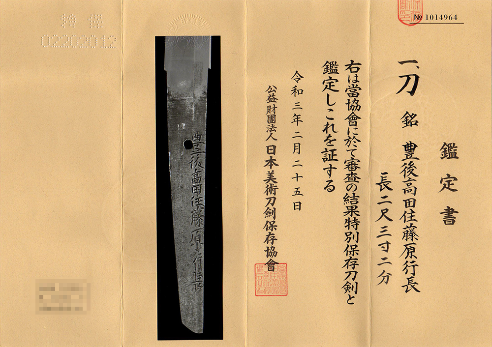 豊州高田派は豊後国高田地区(現大分市鶴崎近辺)で栄えた刀工一派で、古刀期の作に平姓を銘切るものが多いことから、それらを平高田と称し、新刀期以降は藤原姓を銘切るようになったことから、藤原高田と汎称します。古来より実用刀としての評価が高い一派で武用刀として数多の武将に愛用されました。