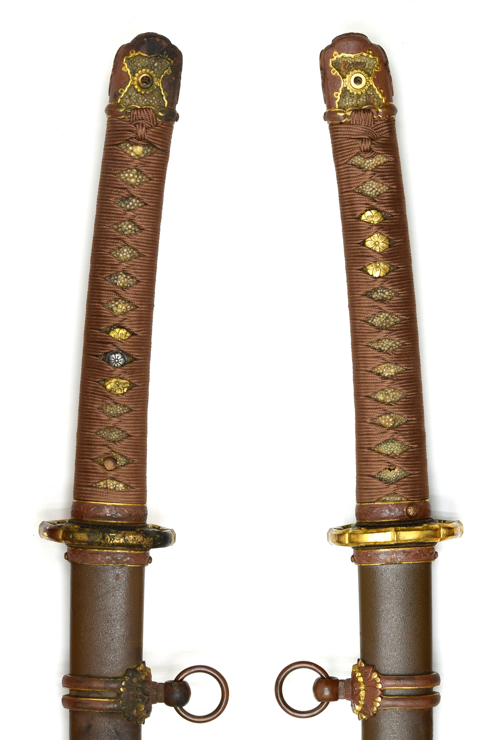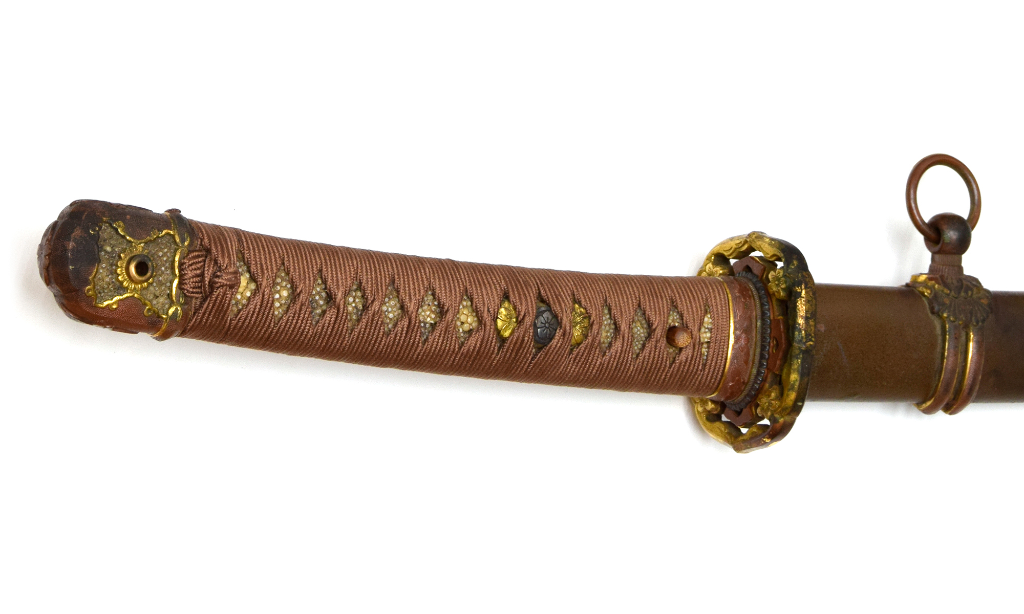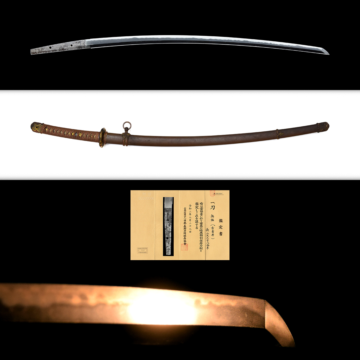 附属する陸軍刀拵は、第二佩鐶を逸失した元九四式拵で、目貫には端正な桔梗紋があしらわれています。拵の表裏で色調が異なる点も特筆すべき特徴で、これは戦後GHQによる刀狩りの折、「家伝の刀を決して渡すまい」との一念から、旧所有者が囲炉裏の上に長年秘匿していたことに起因します。その痕跡は、単なる経年変化ではなく、激動の時代を生き抜いた証として、深い説得力をもって語りかけてきます。 刀身そのものが鎌倉後期の名作として長き歴史を有することは言うまでもなく、加えてGHQの刀狩りという近代史の転換点において、持ち主が身を挺して守り抜いたという実話が、この一振に比類なき歴史浪漫を与えています。日本刀が辿ってきた数百年の歩みと、人の想いが重なり合う逸品を、ぜひこの機会にお手元でご堪能ください。